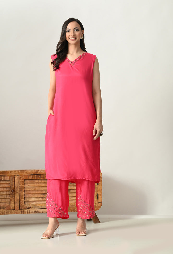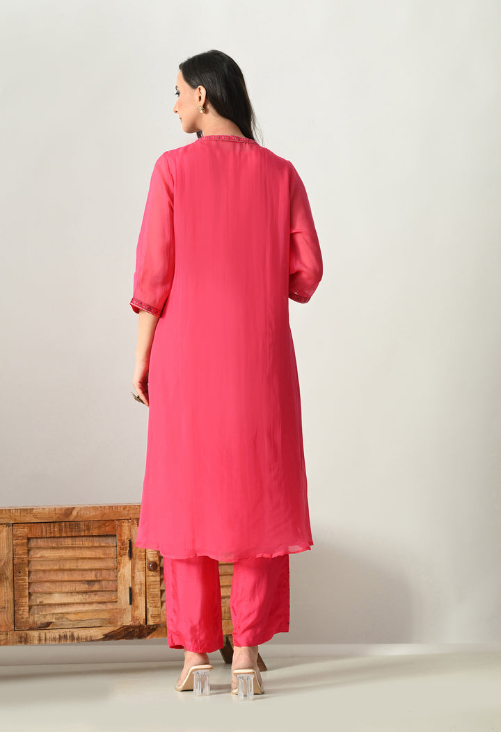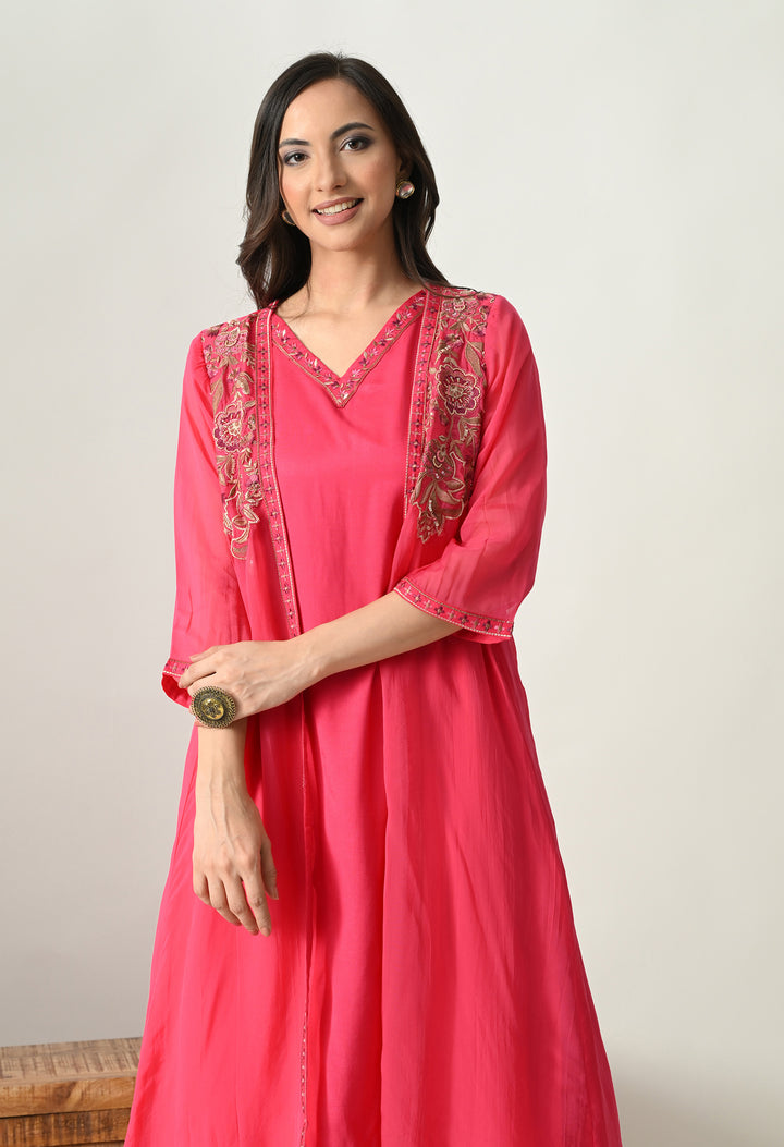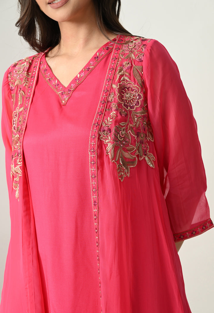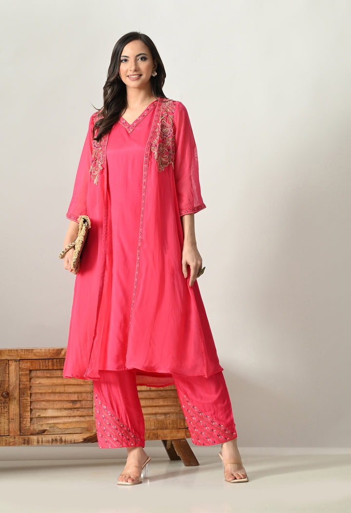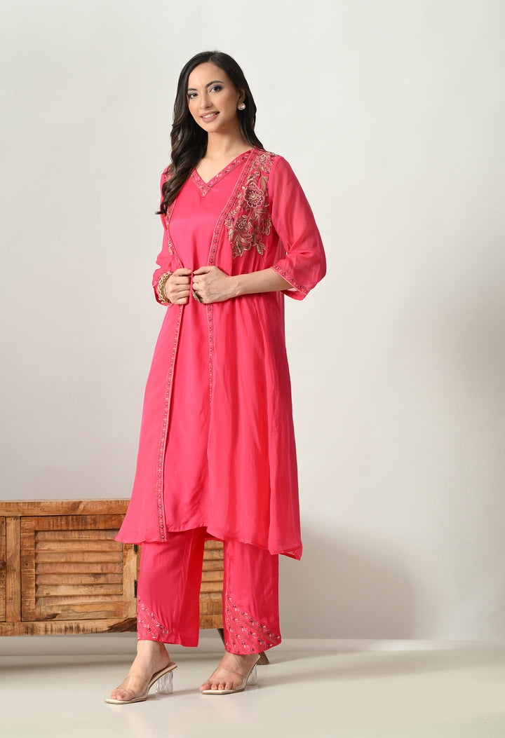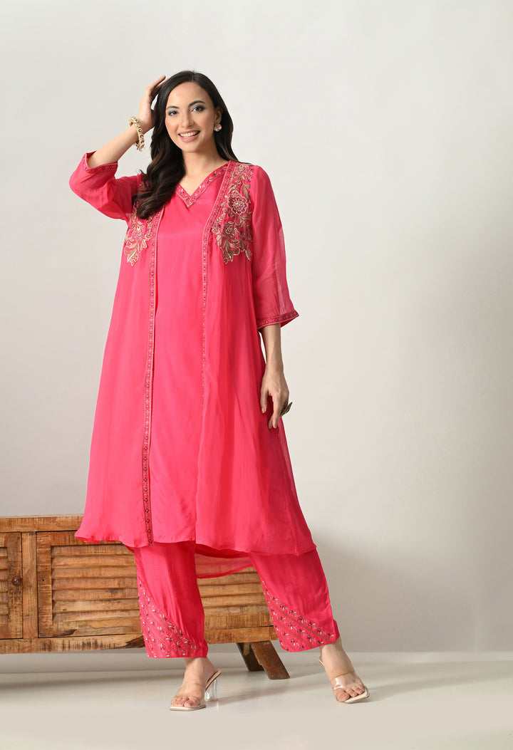 Shine bright in this Radiant Magenta Pearl Work Ensemble, a stunning 3-piece Indo Western dress. The outfit comes with a soft silk palazzo, a long sleeveless V-neck inner, and a beautifully designed open jacket. The jacket is the highlight, decorated with delicate thread, zari, pearl, and sequin work on 3/4th sleeves, making it both elegant and festive. The palazzo includes a convenient side pocket and stylish work at the mori, adding charm to the look. With its cotton lining for comfort and a graceful magenta shade, this outfit is perfect for weddings, parties, and festive occasions. A true showstopper!
