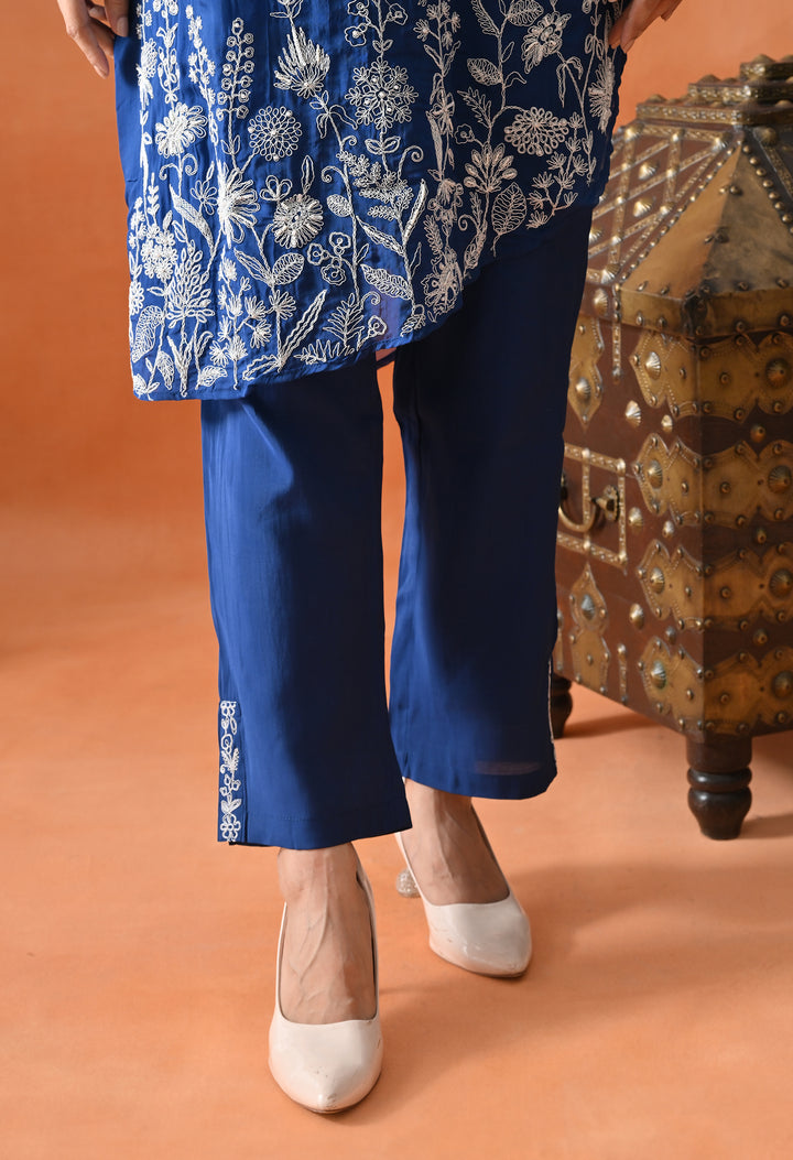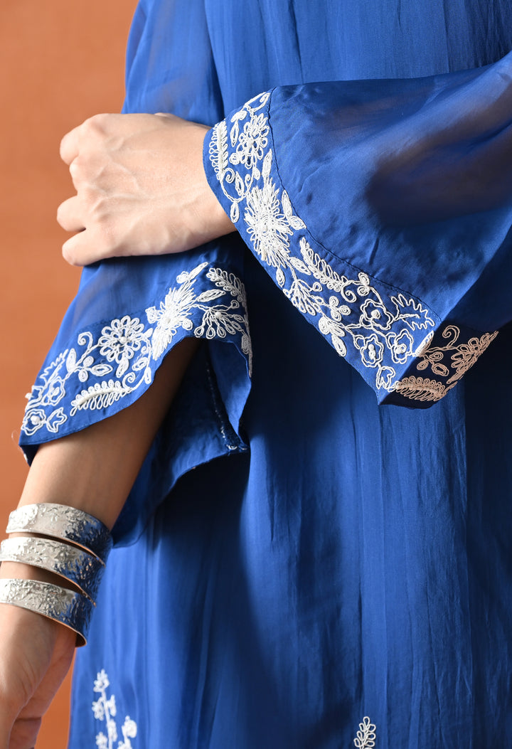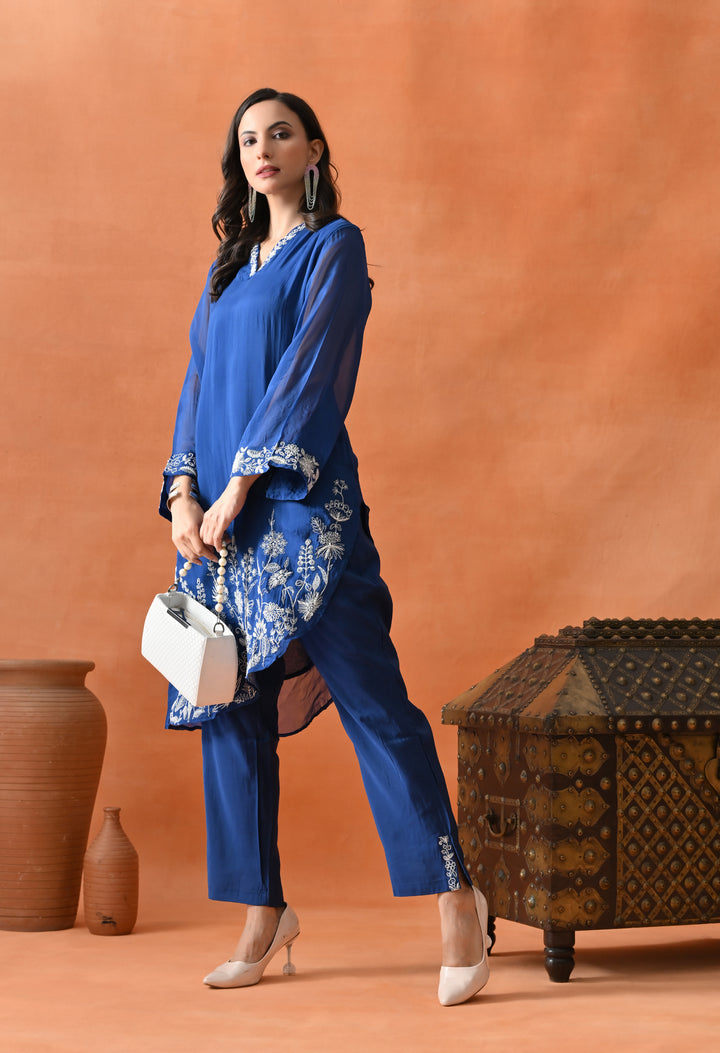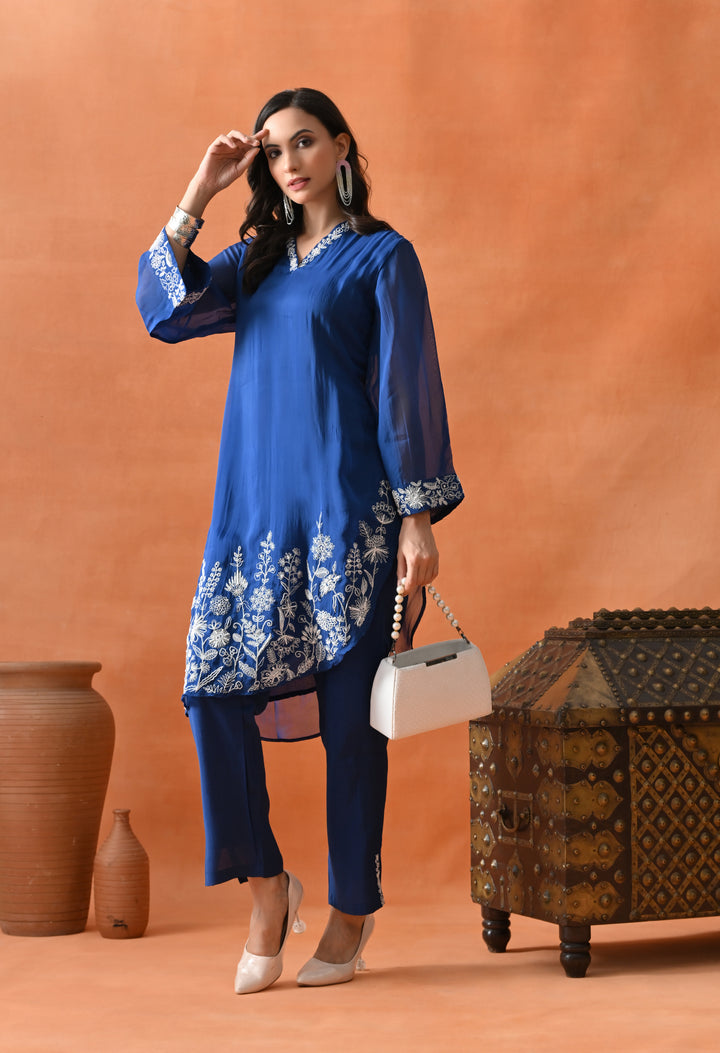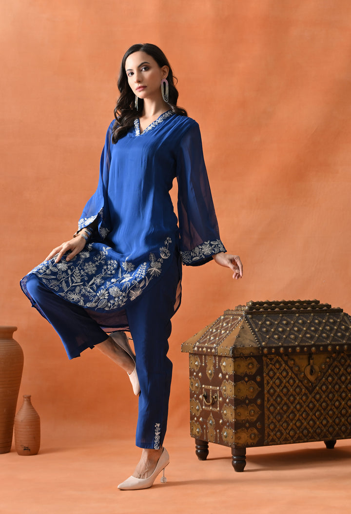 Get ready to look gorgeous in this stylish diagonal cut co-ord set in a lovely blue shade. Made from soft organza crepe with full lining, it feels super light and comfy. The beautiful pearl and thread work make it look classy and festive. The full sleeves with umbrella-style design add a graceful touch, and the V-neck keeps it trendy. The pants come with one side pocket—perfect for your phone or lip balm! Whether it’s a party or family function, this outfit will make you shine and stand out with its pretty and modern design.