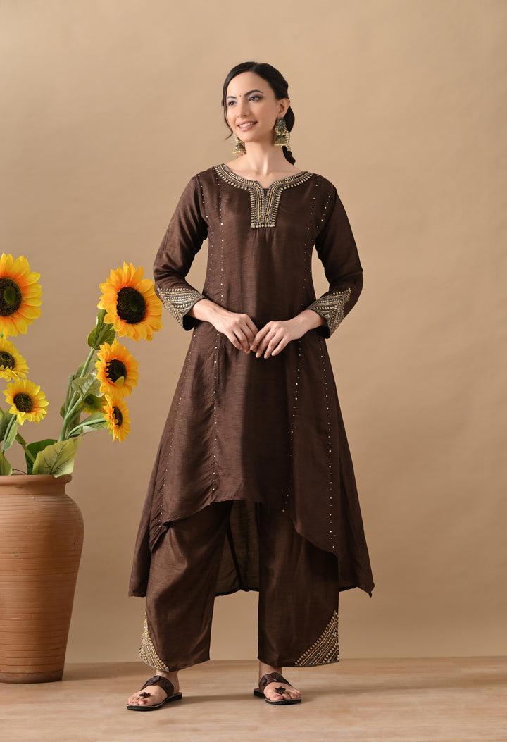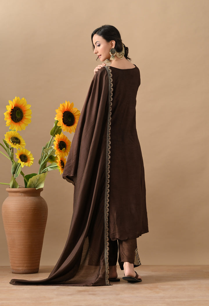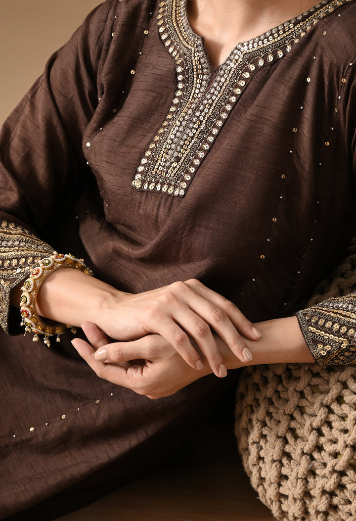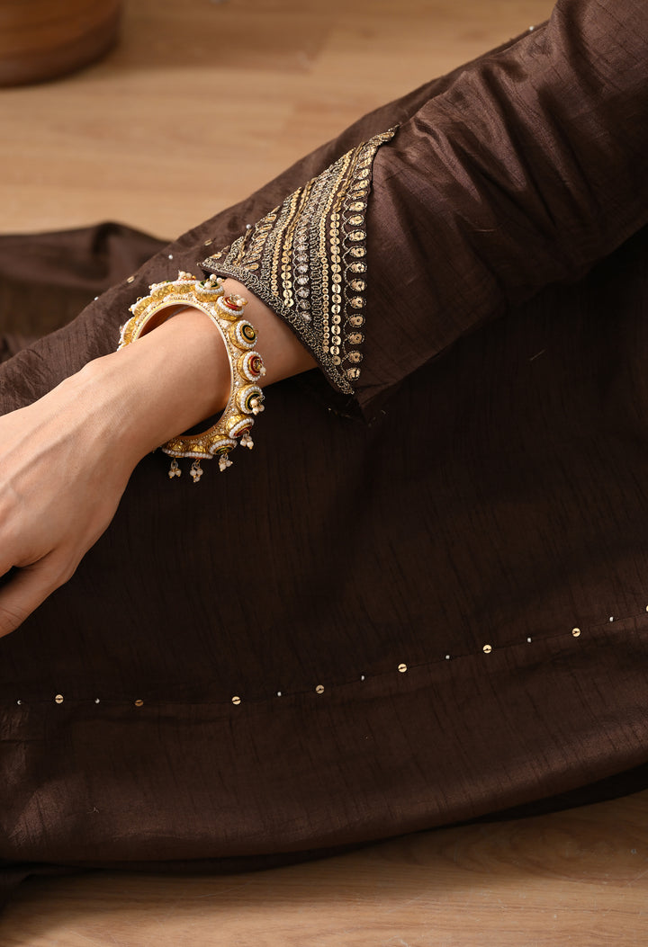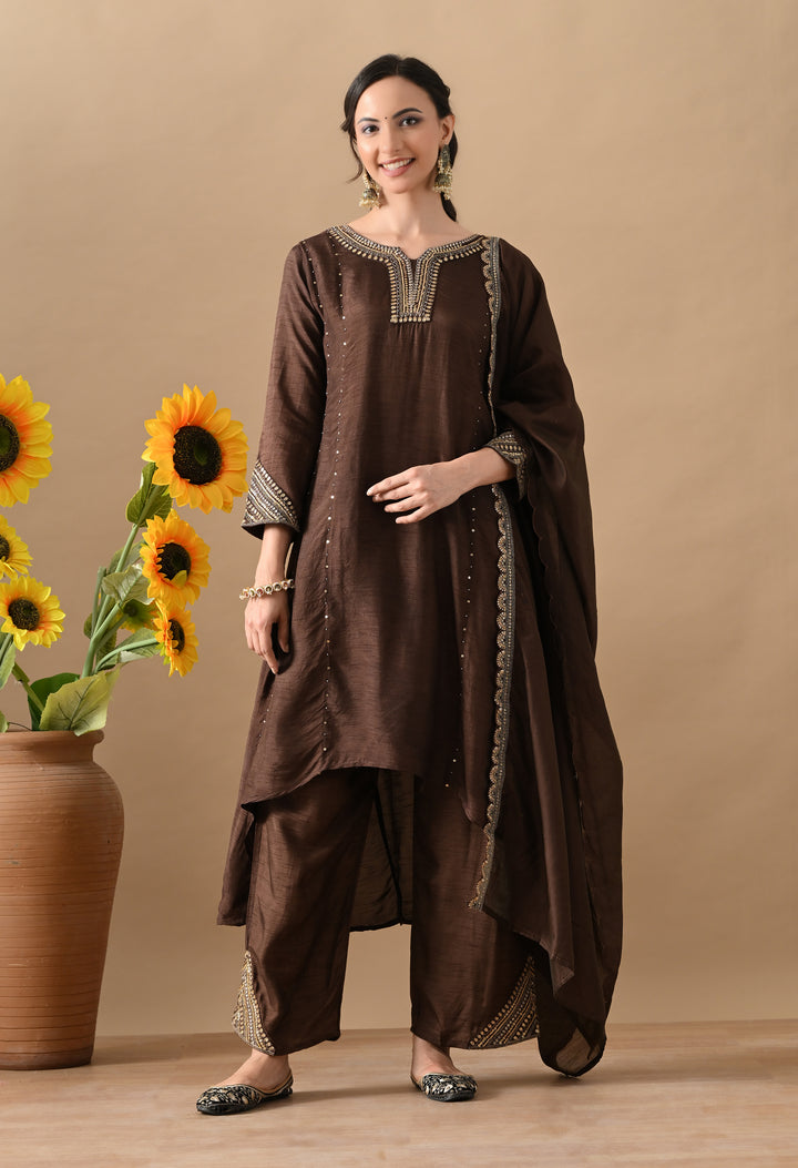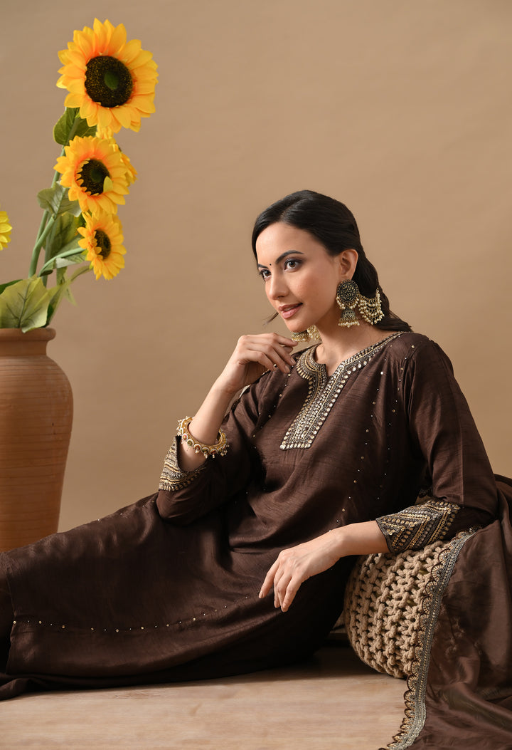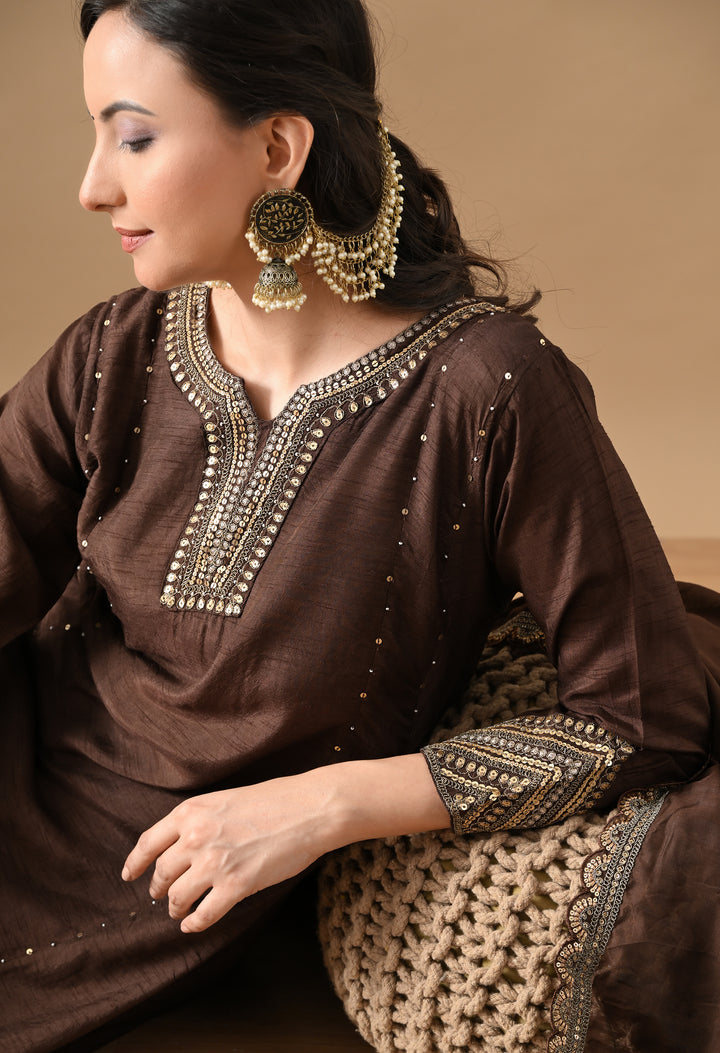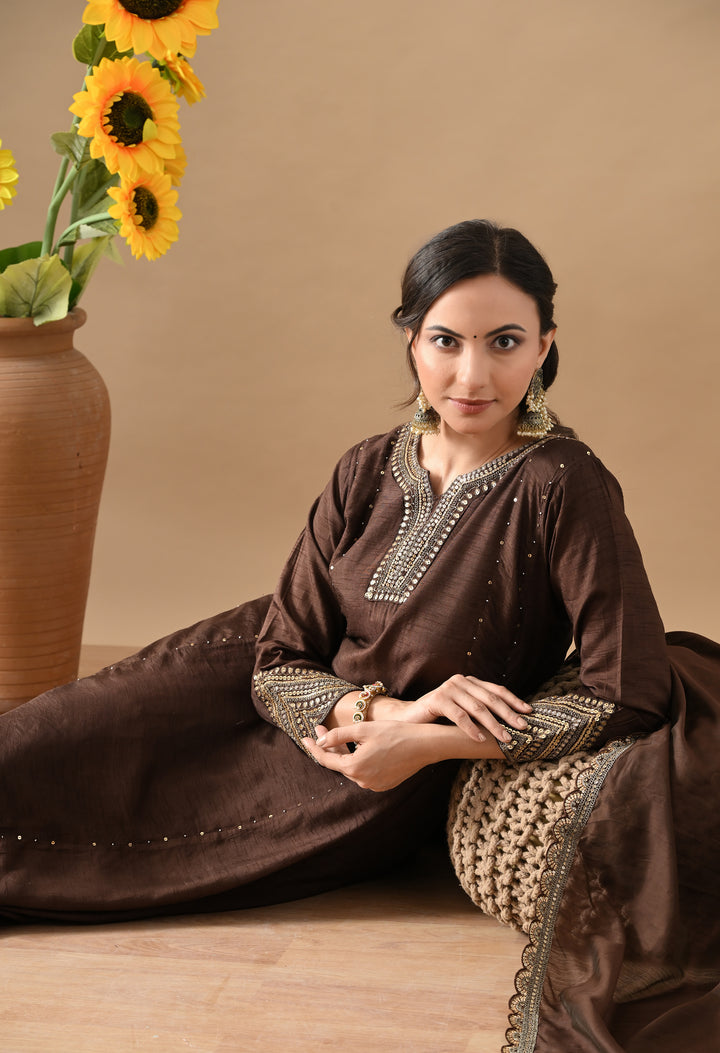 Step into elegance with this Brown Zari Sequin Raw Silk Suit — crafted to make you shine! The A-line kurta in rich raw silk is beautifully adorned with sequins, pearls, zari, and thread work, making it perfect for festive wear or special events. The 3/4 sleeves and round neck add a graceful charm, while the pants with work at the mori and a one-side pocket combine comfort with style. The viscose organza dupatta features stunning 2-side scalloping and 1-side gotta, completing the royal look. This outfit is pure class — stylish, graceful, and truly irresistible!