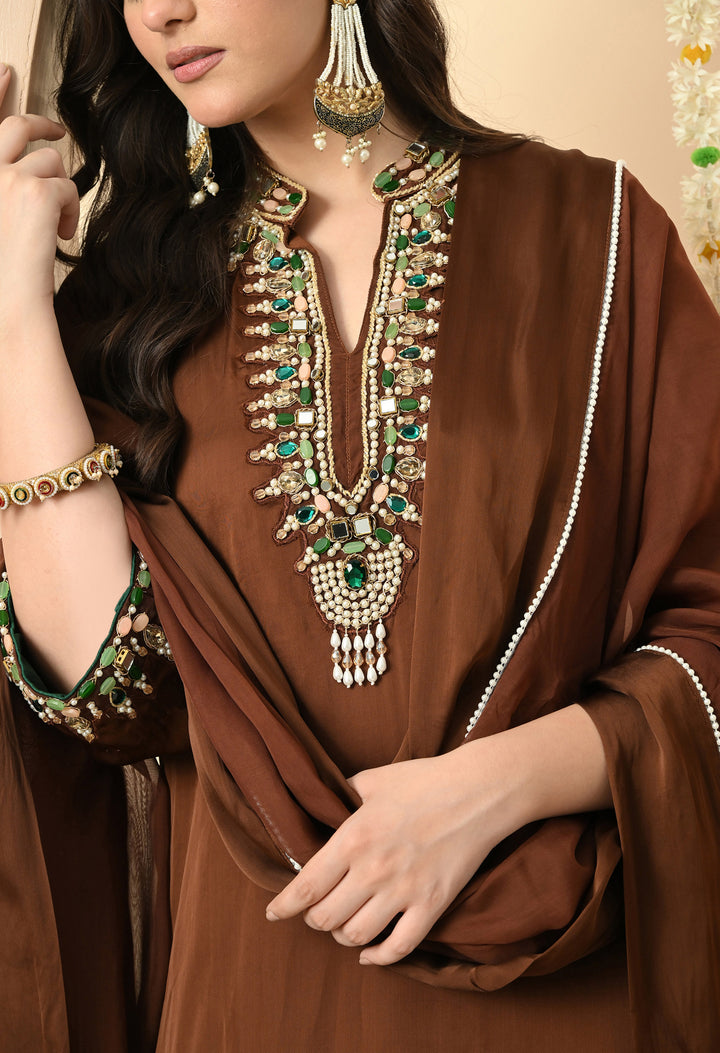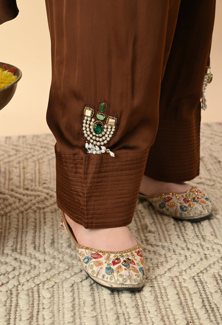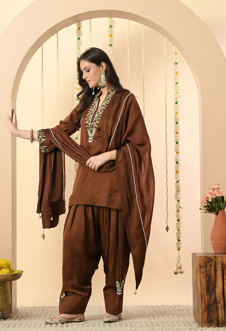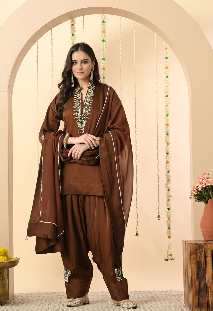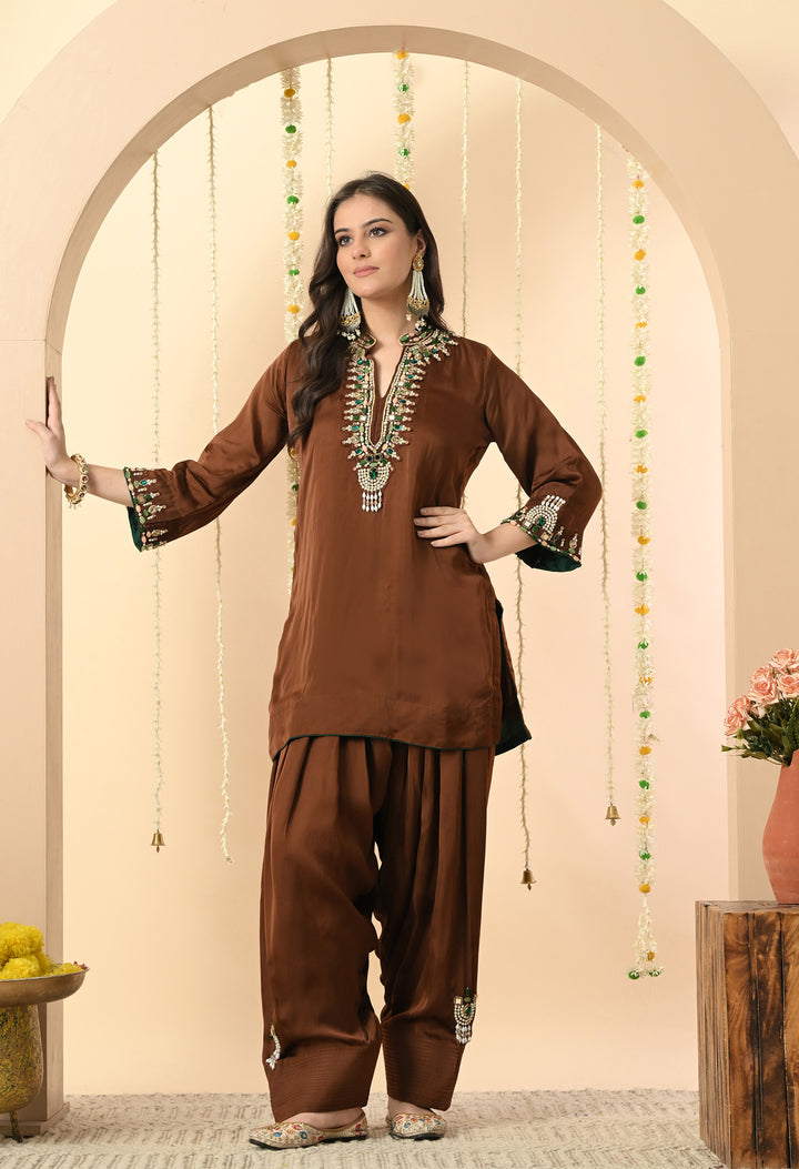 Step into every party with style in this beautiful brown partywear suit. The short kurti with a mandarin neck and 3/4 sleeves is adorned with mirror work, crystals, dabka, cut dana, and pearl detailing, making it perfect for festive occasions. The Parsi salwar features intricate patchwork with pearls, crystals, and mirrors, adding extra charm. The organza crepe dupatta with four-side pearl detailing and tassels completes the elegant look. A matching potli purse adds a stylish touch. With soft satin crepe fabric and full lining, this outfit is both comfortable and stunning.