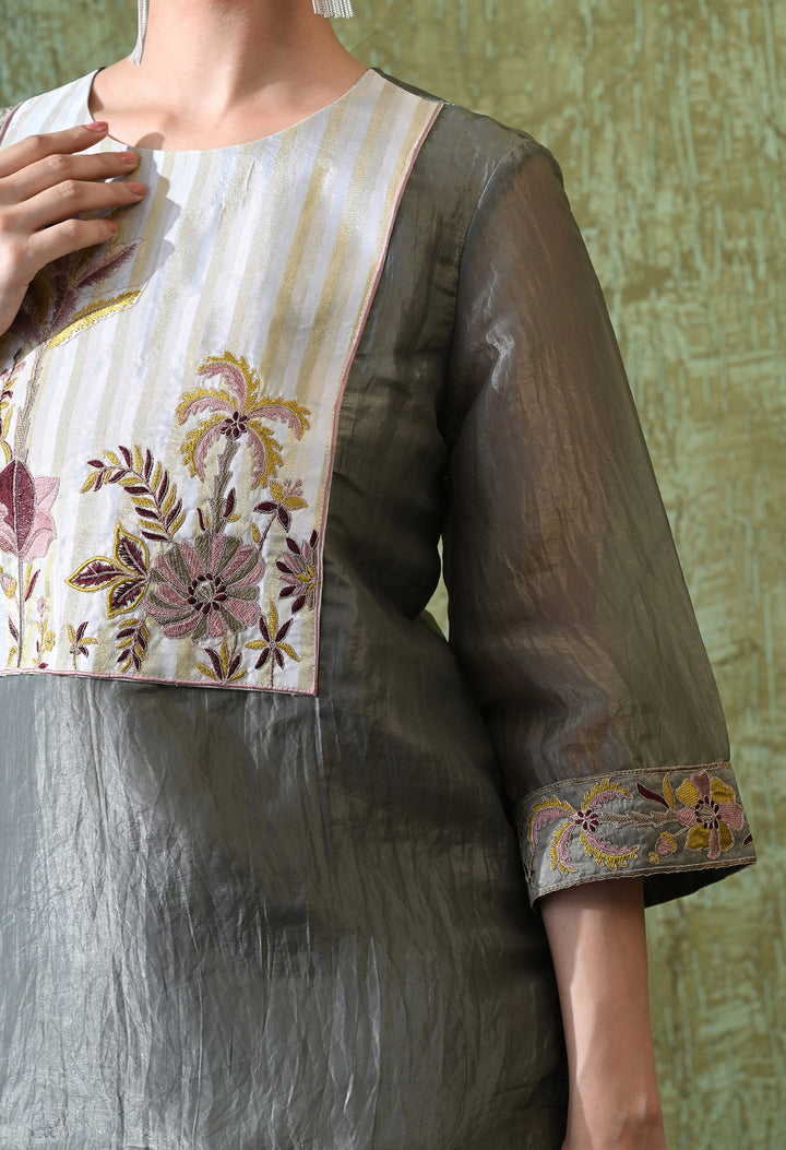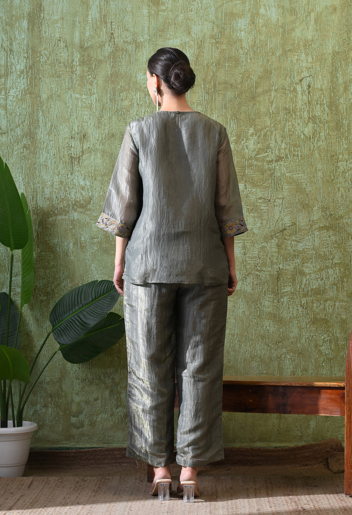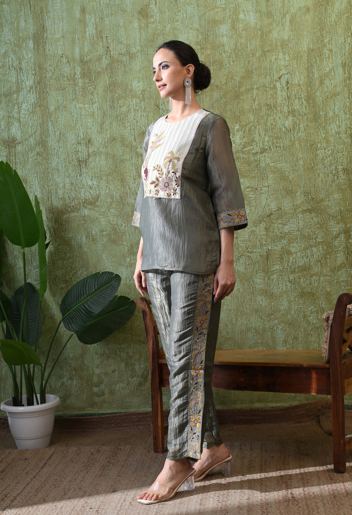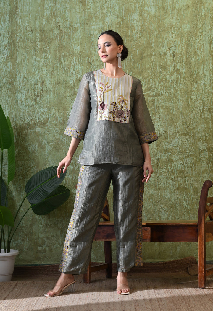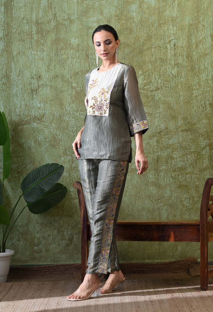 This Graceful Grey Festive Co-ord Set is designed to make you shine at any event. Made from rich opara silk, it feels soft and luxurious while giving you a classy look. The set is decorated with delicate zari and thread work that adds just the right sparkle. The stylish palazzo comes with a convenient side pocket, making it both pretty and practical. With its round neck, 3/4 sleeves, and cotton lining, you’ll feel comfortable all day. Whether it’s a family gathering, party, or festival, this co-ord set is a perfect mix of tradition and modern fashion.