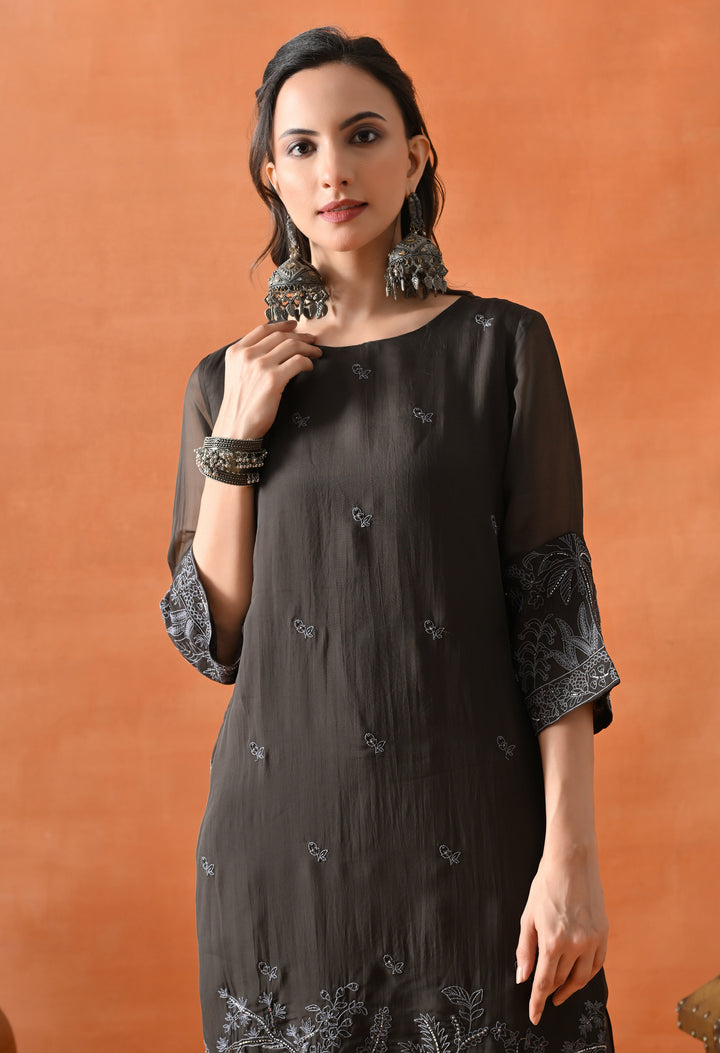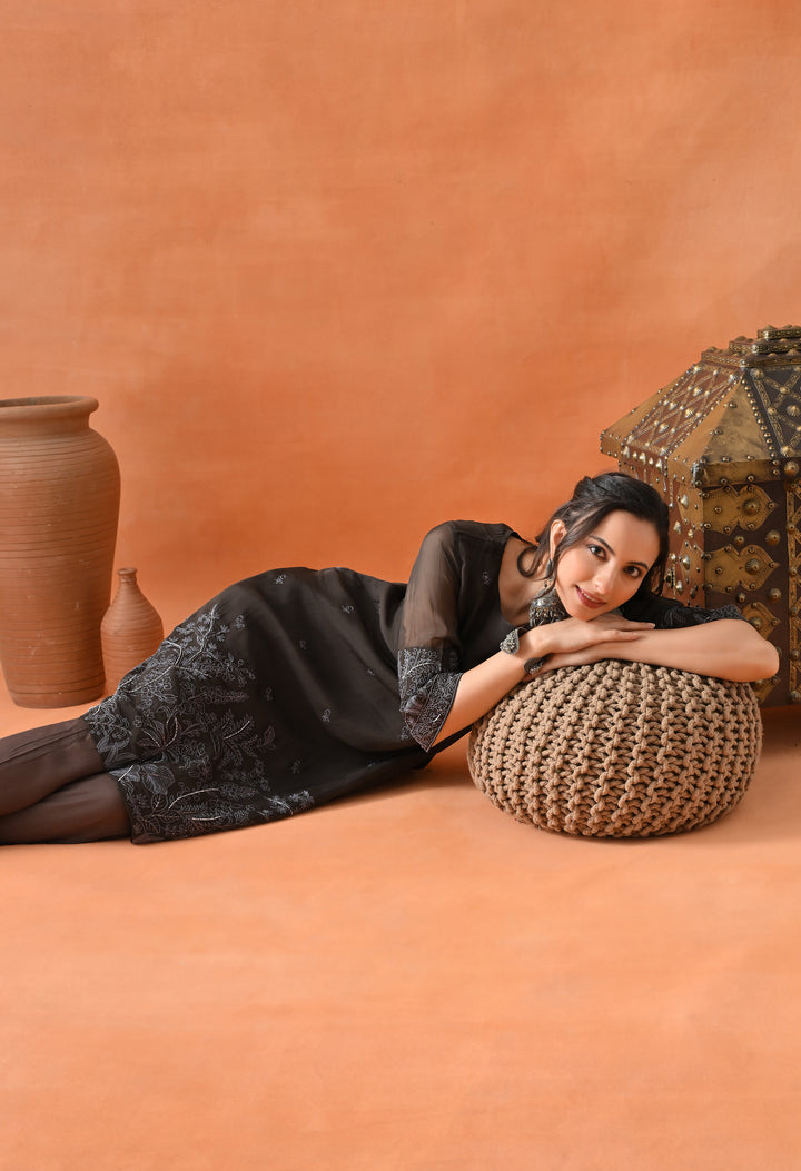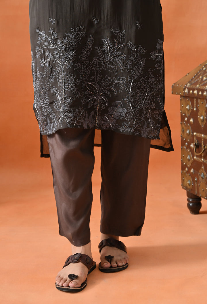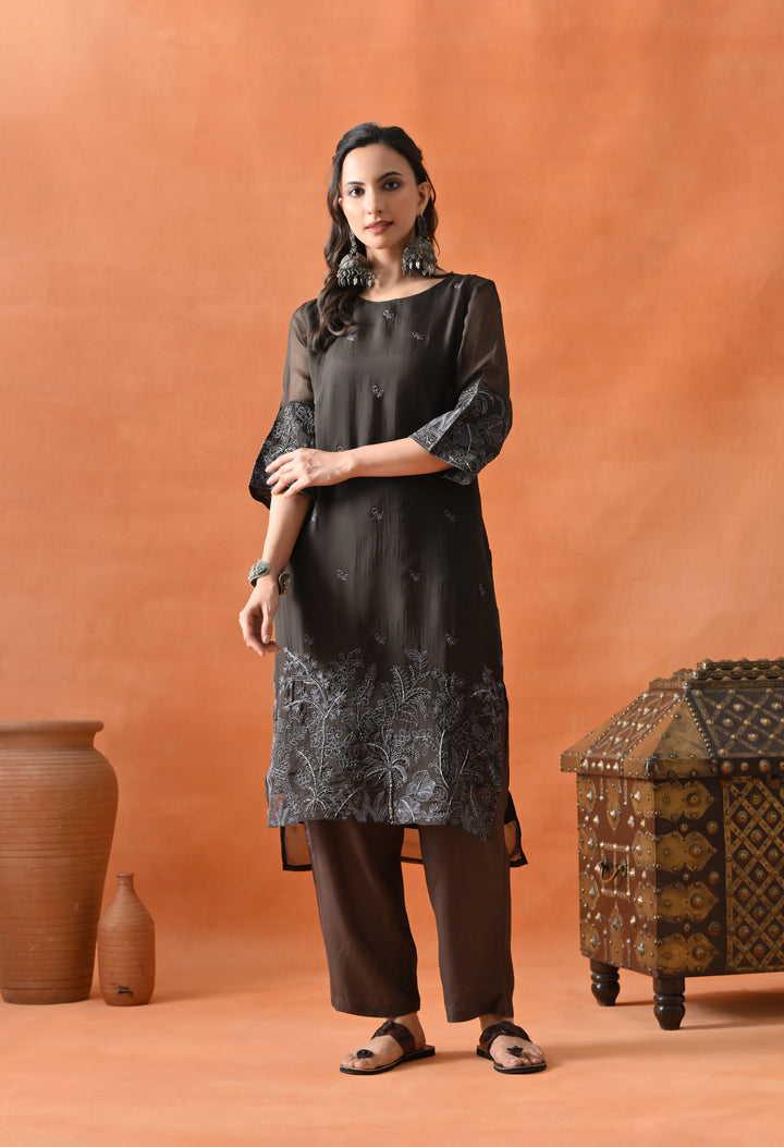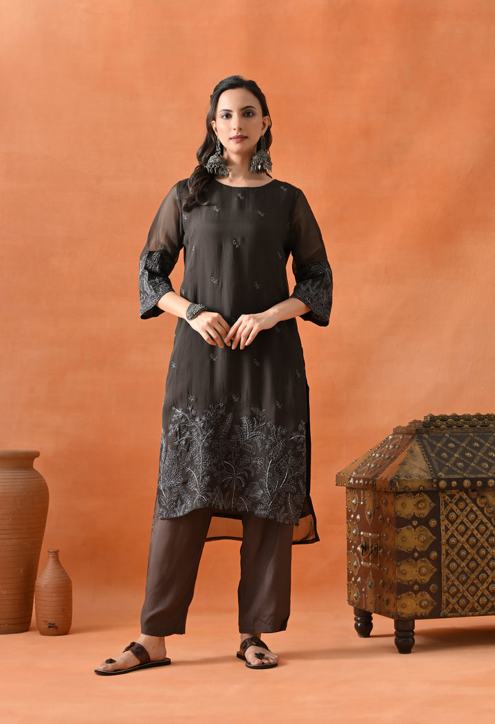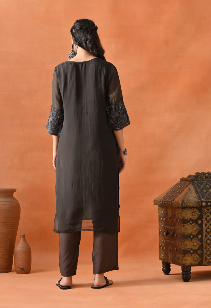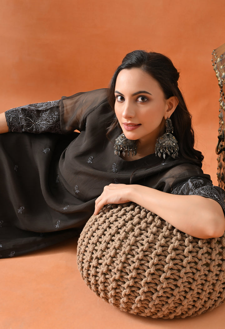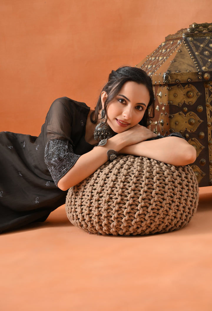 Turn heads with this classy dark brown Pakistani suit, made from rich organza crepe. The outfit is beautifully decorated with detailed thread work, shiny cut dana, and delicate pearls, giving it an elegant and festive look. It features a comfortable round neck, half sleeves, and a stylish pant with a handy one-side pocket. Fully lined for extra comfort, this suit is perfect for weddings, parties, or any special event. Its rich color and graceful design will make you feel confident and beautiful every time you wear it.