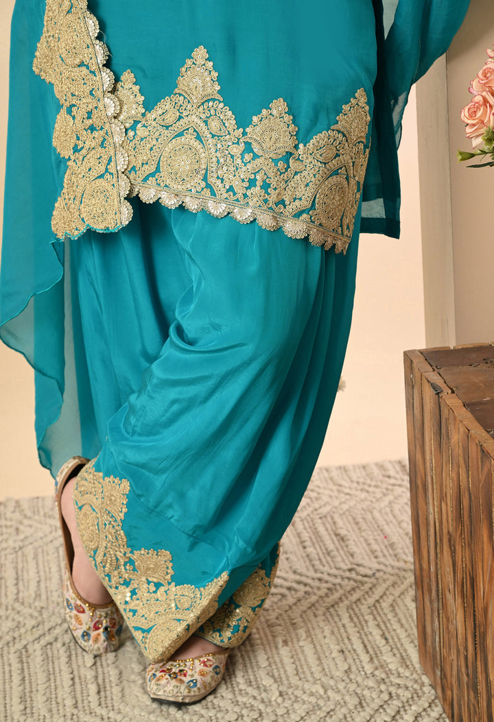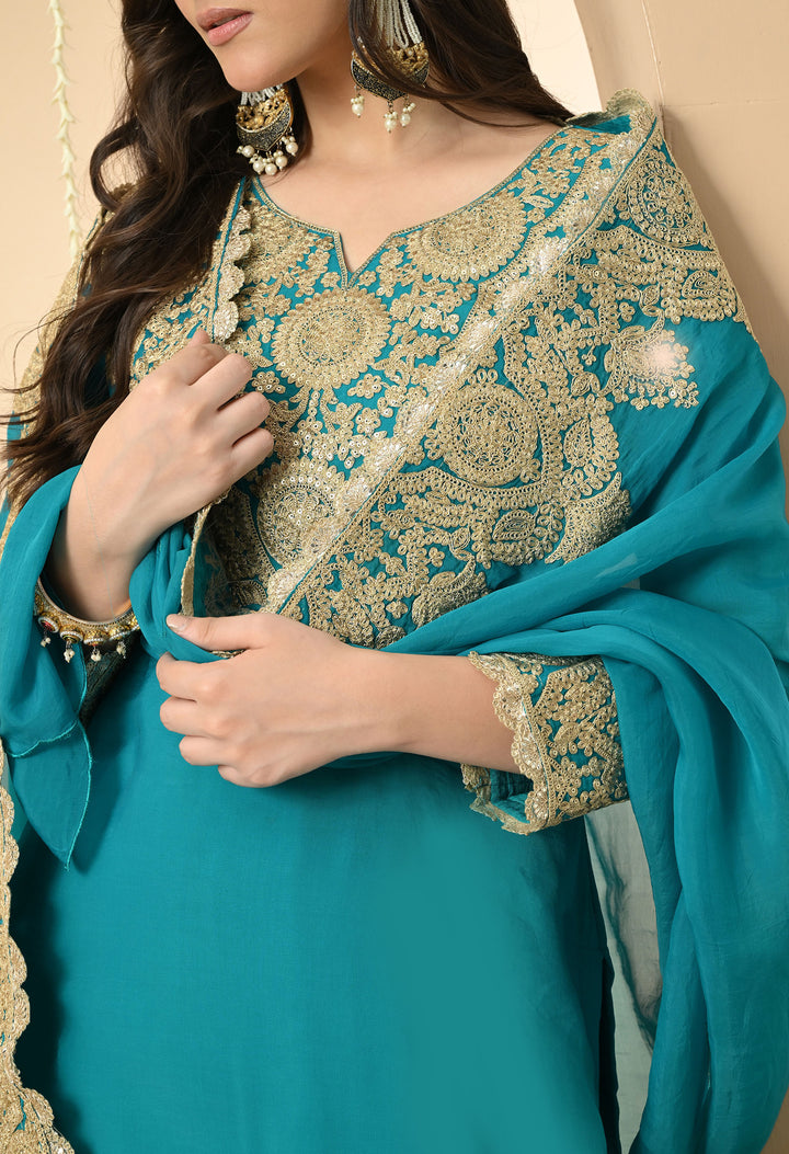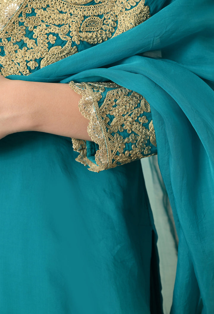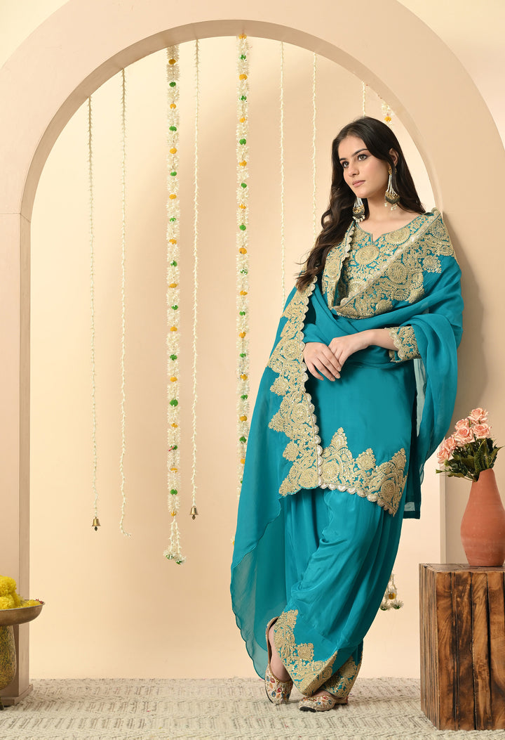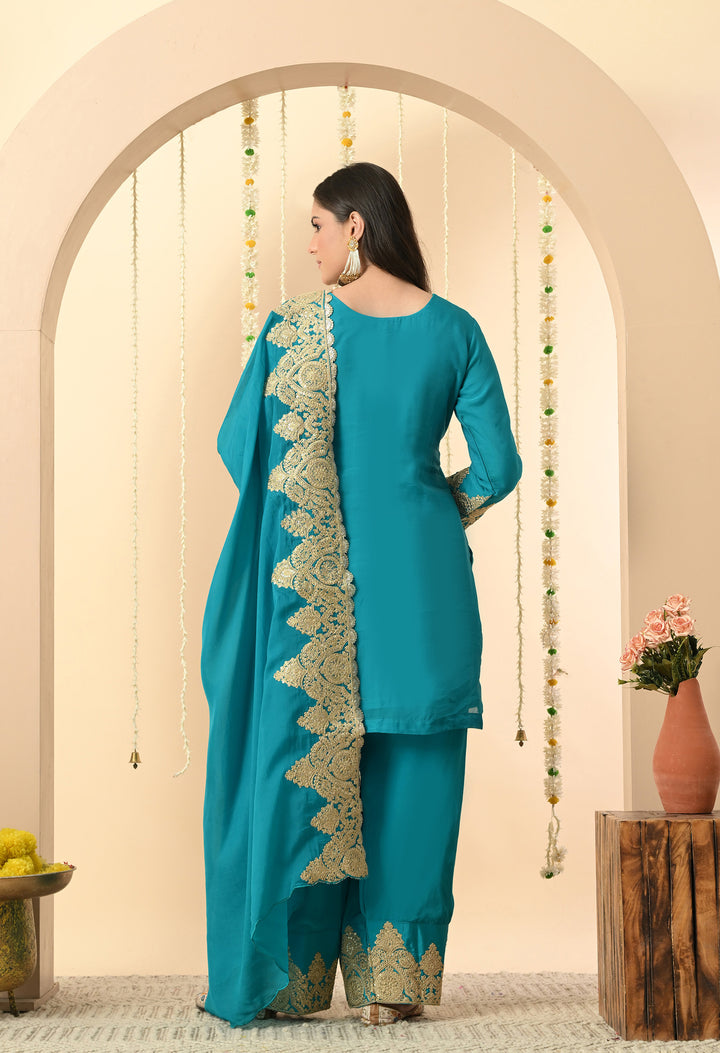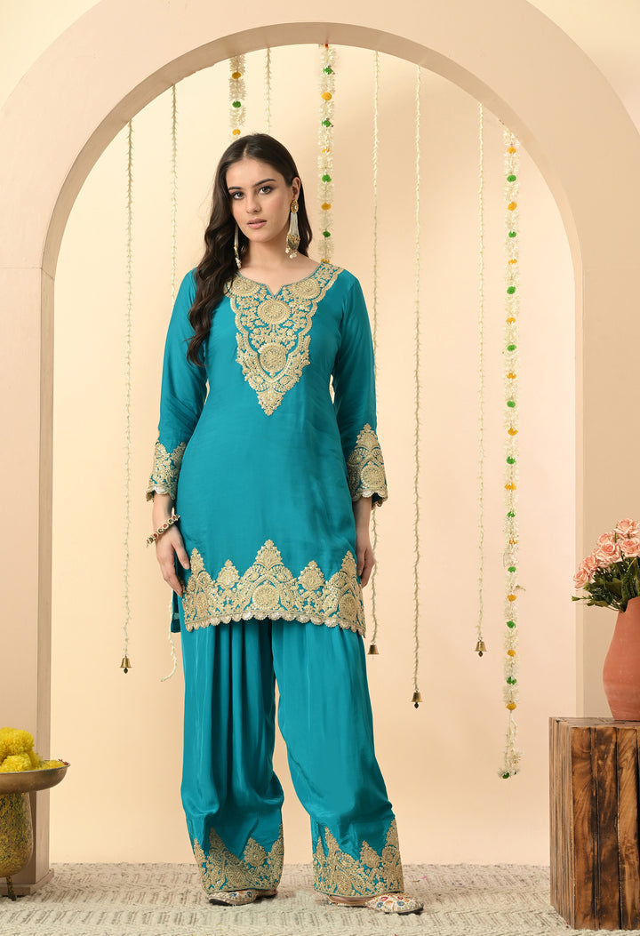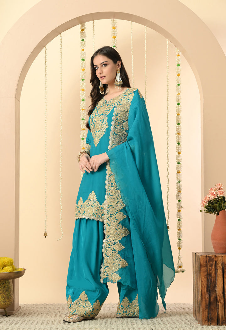 The Dark Firozi Zari Elegance Kurti is a stunning party wear outfit designed to make you stand out. The short kurti, crafted from organza crepe with delicate zari work, brings sparkle and style together. Its round neck with a smart V-cut adds a graceful touch, while the full sleeves balance tradition and elegance. The pure crepe parsi salwar ensures comfort and flowy charm, perfect for long celebrations. Completing the look is a beautiful organza crepe dupatta, decorated with zari work, buti patterns, one-side border, and elegant scalloping. With lining for extra comfort, this outfit is a must-have for festive occasions.
