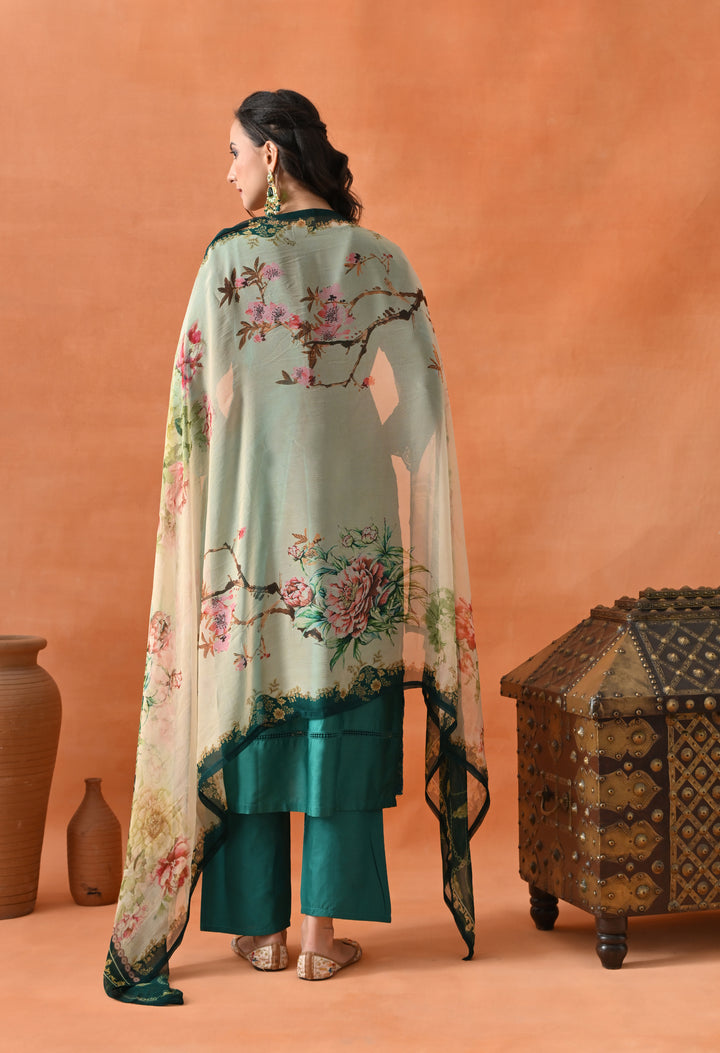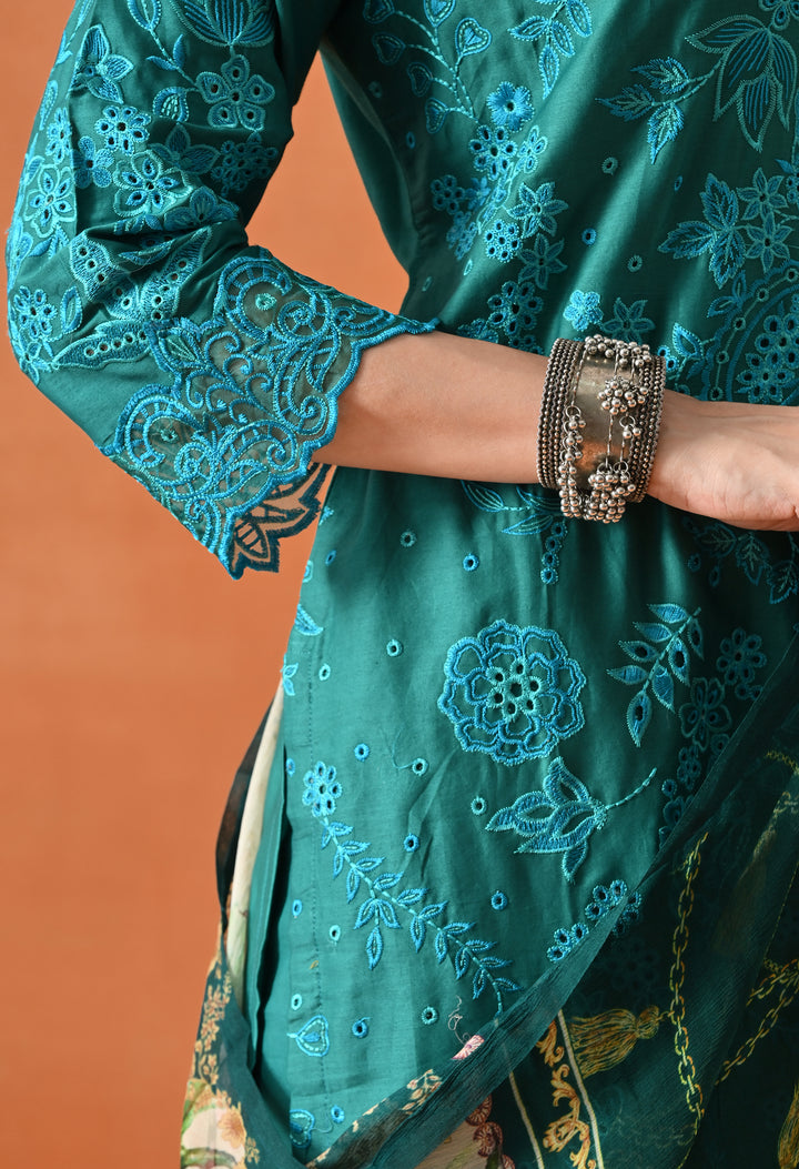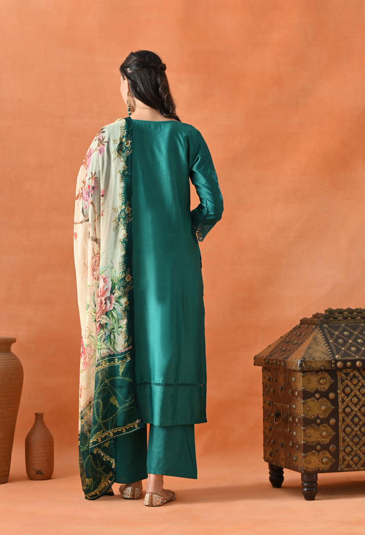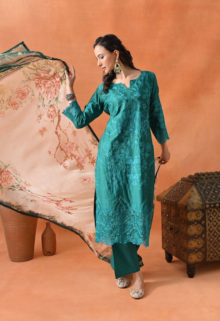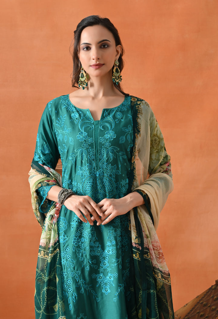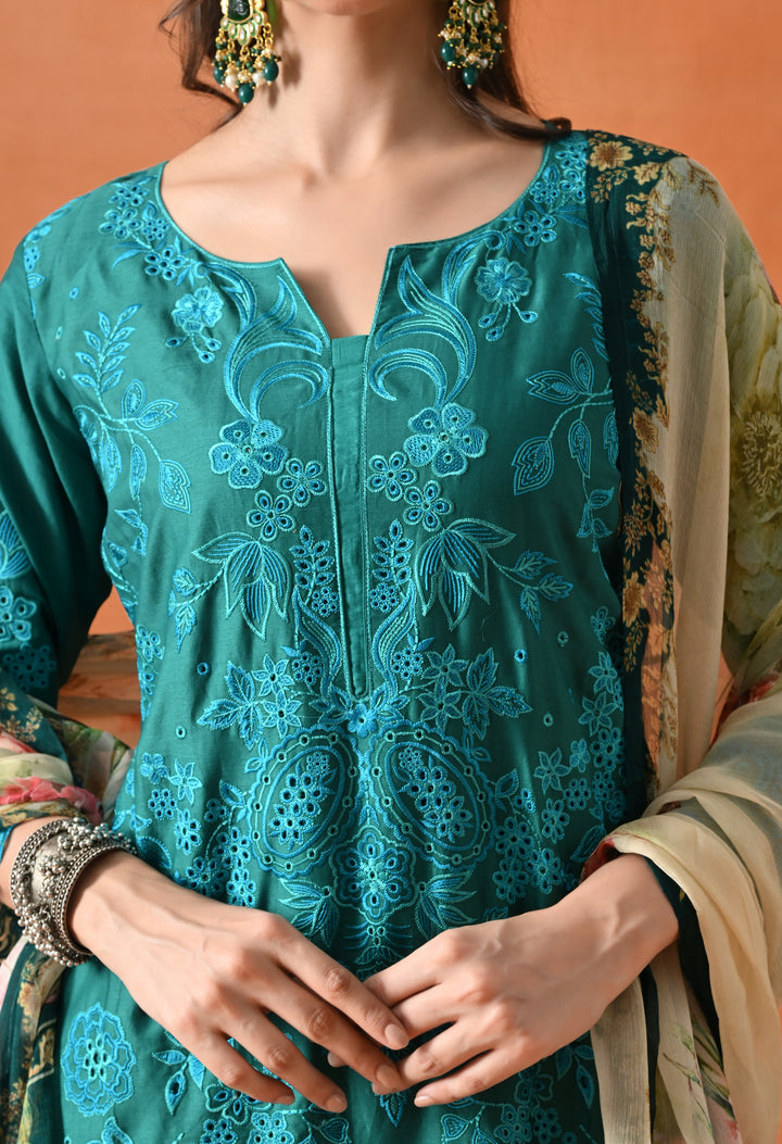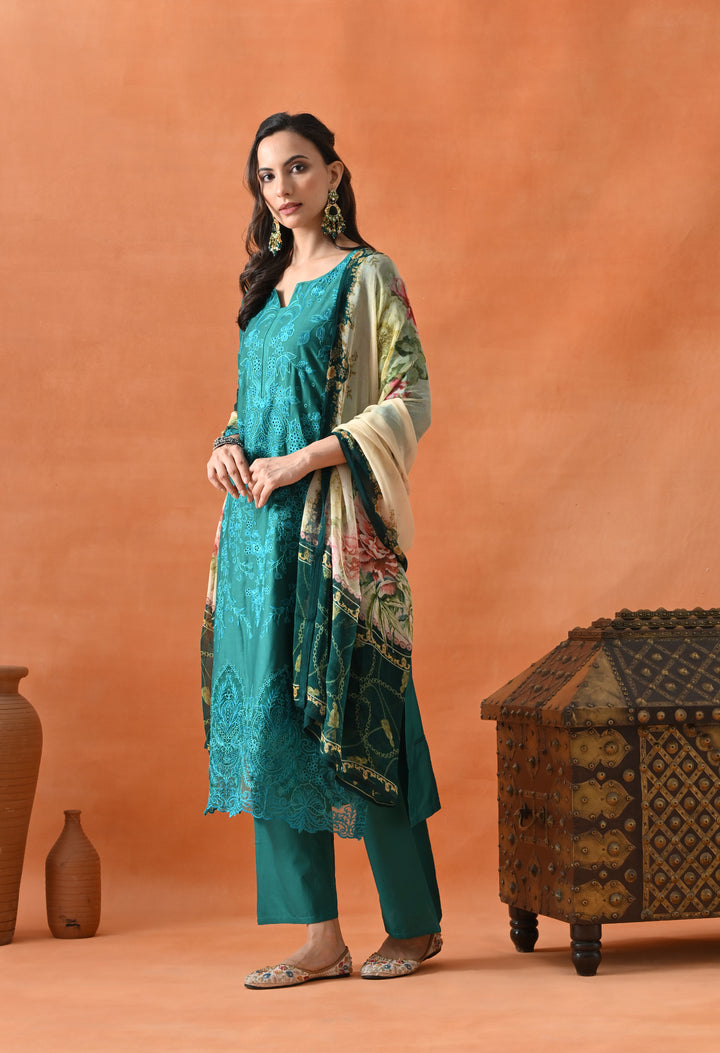 This dark green Pakistani-style suit is a must-have for your everyday and festive wardrobe. Made from soft cotton fabric, it feels light and comfy all day. The suit features neat siply work and a stylish round neck with a V-cut that adds a touch of elegance. It comes with 3/4 sleeves and a matching pant for a sleek look. The cream-based floral printed dupatta adds the perfect hint of grace and freshness. Whether it’s a family function or a casual outing, this outfit will make you feel beautiful instantly!