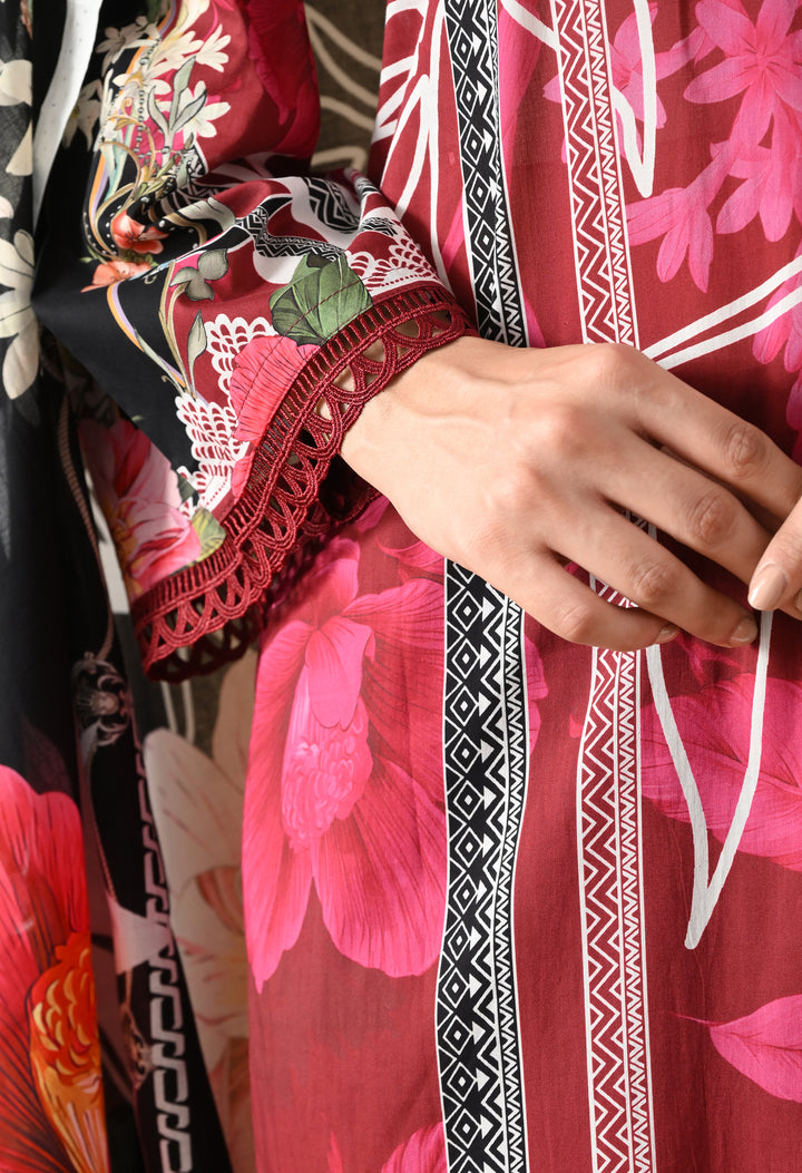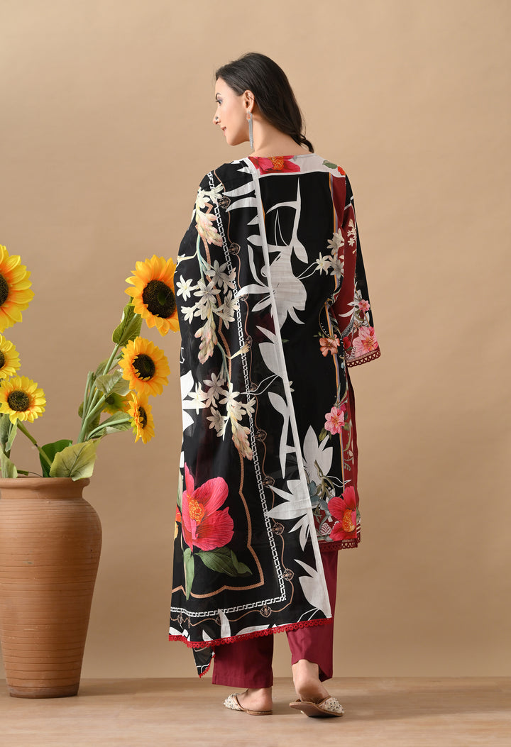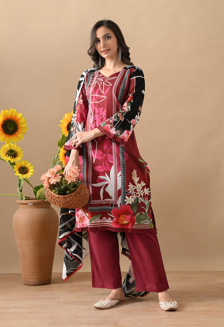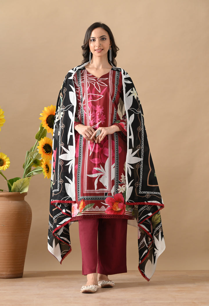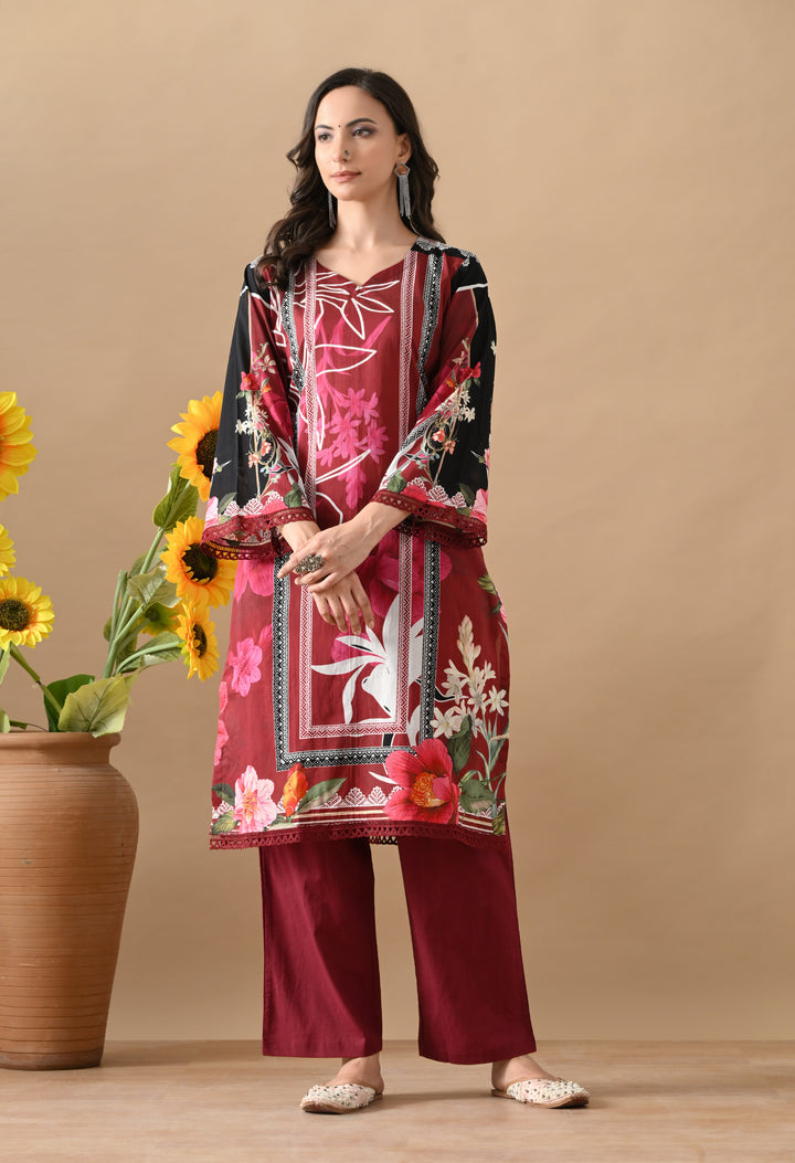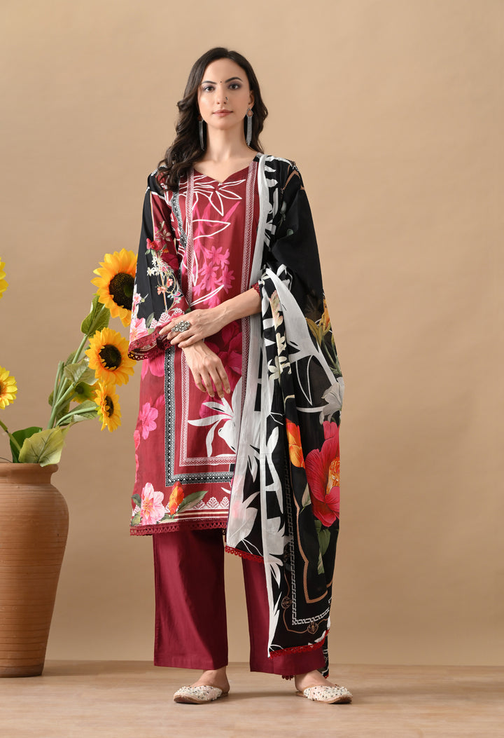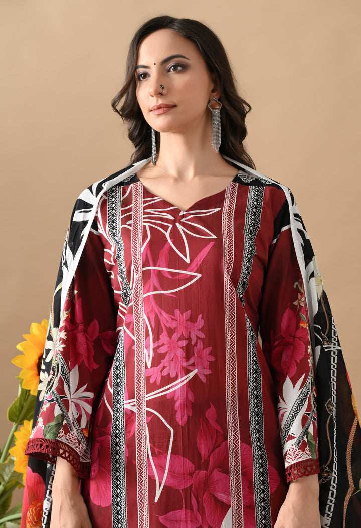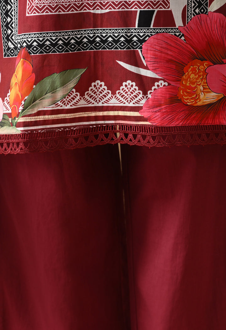 Step into effortless elegance with this Maroon Printed Cotton Lace Suit Set. Designed with a beautiful sweetheart neckline and 3/4 bell sleeves, the kurta features delicate lace detailing at the sleeve ends and hem (ghera) for a graceful finish. The maroon base with stylish prints makes it perfect for casual outings, festive gatherings, or daily wear. Paired with comfortable straight pants and a printed dupatta with 2-side lace, this outfit offers both comfort and charm. Lightweight, breathable, and beautifully made ā this suit is a must-have for every wardrobe!