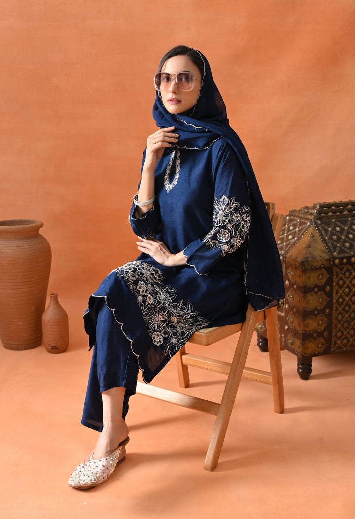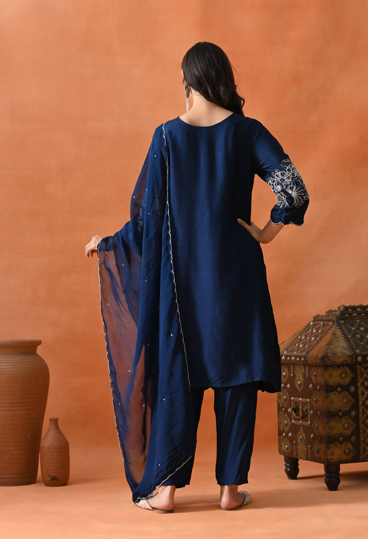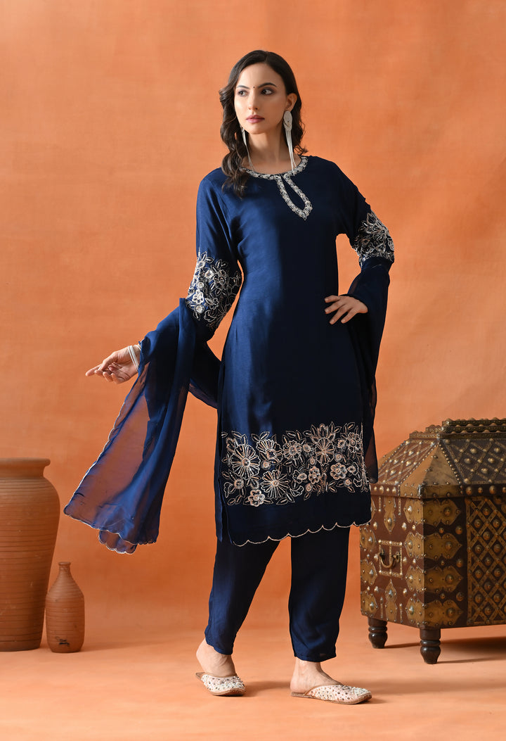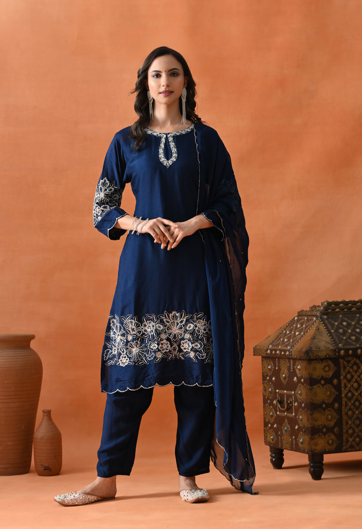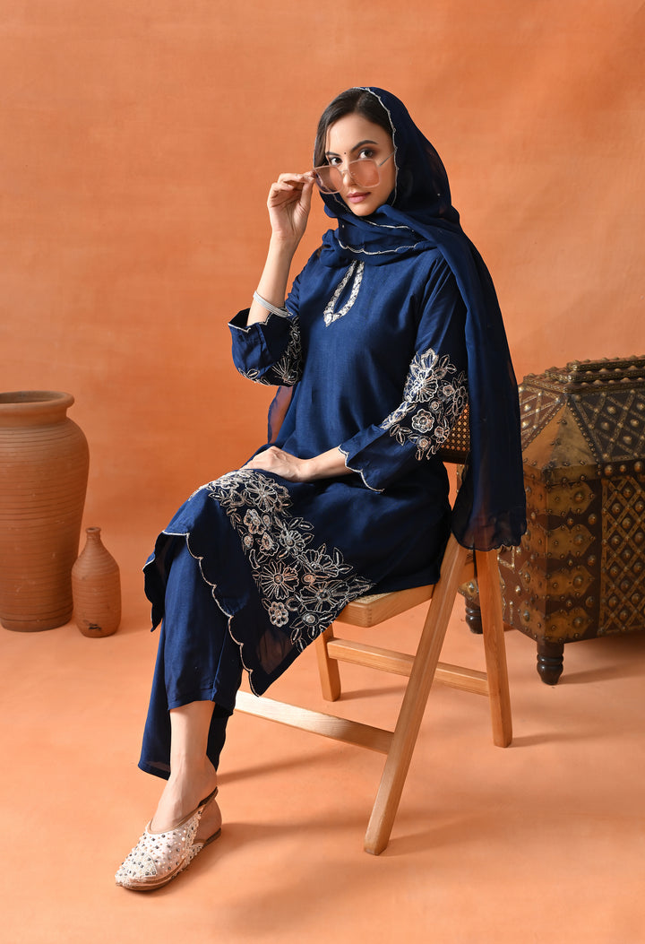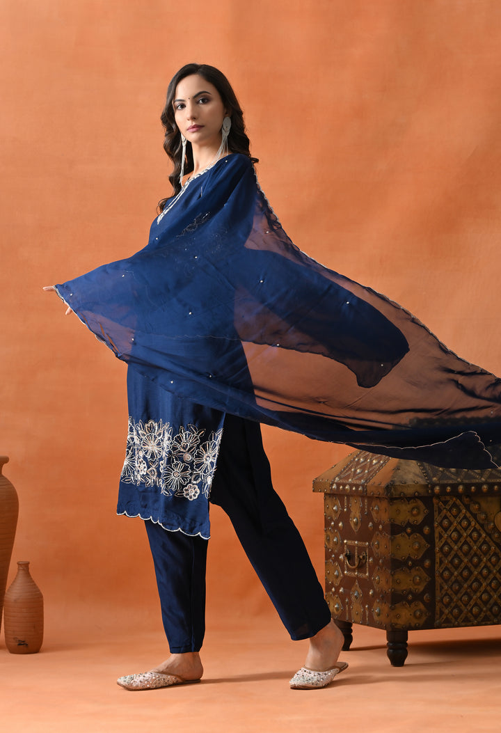 Shine bright at any party with this beautiful teal blue suit set. The silk top is decorated with eye-catching sequins, cut dana, and pearl work that add just the right sparkle. It comes with a matching pant for a comfortable fit and a stunning organza dupatta with 4-side scalloping, delicate buti, and pearl detailing. The 3/4 sleeves and round neck give a stylish yet easy-to-wear look. The top has lining for comfort, while the pants stay breezy without lining. Perfect for weddings, festivals, or evening functionsāthis outfit is a total showstopper!