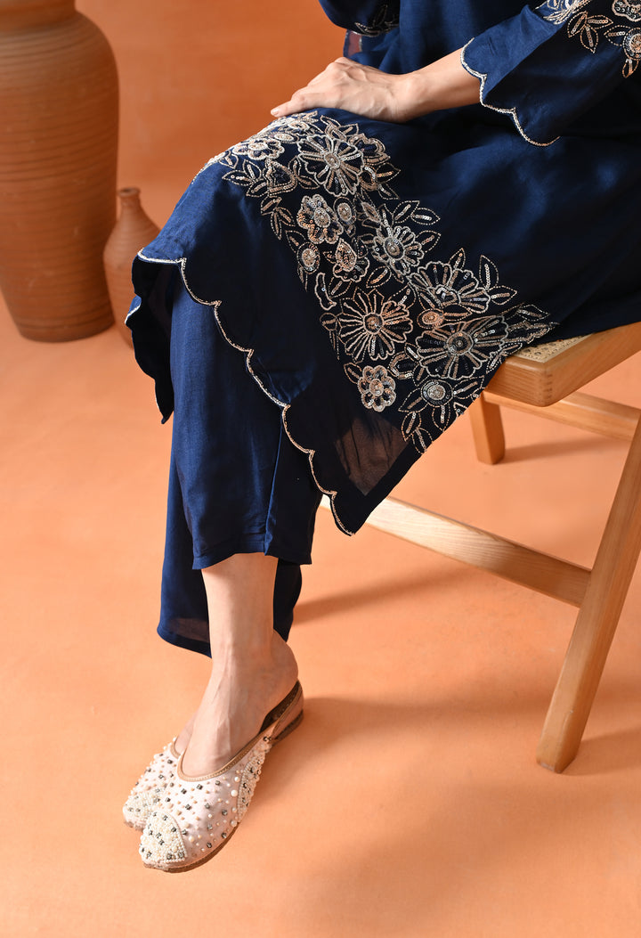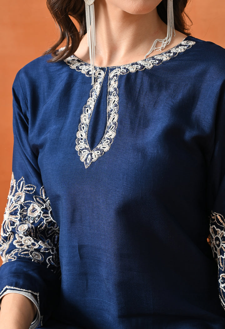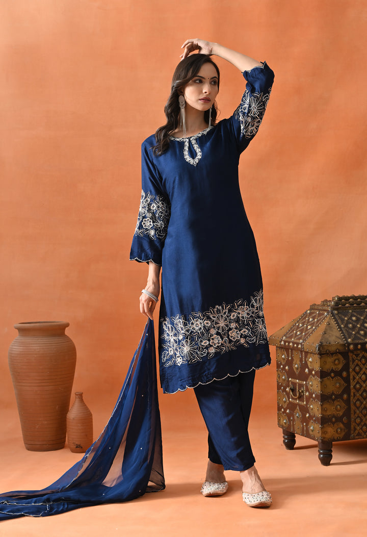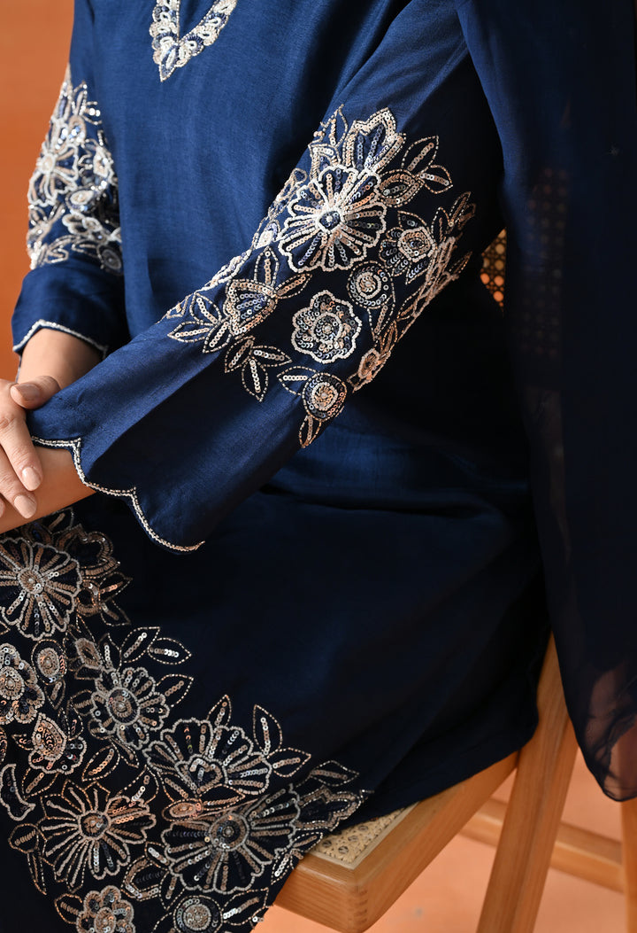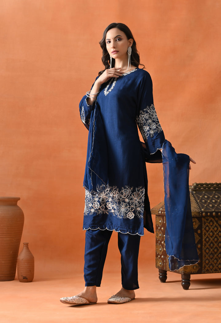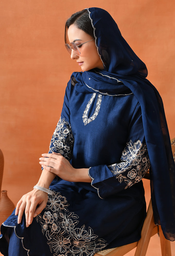 Shine bright at any party with this beautiful teal blue suit set. The silk top is decorated with eye-catching sequins, cut dana, and pearl work that add just the right sparkle. It comes with a matching pant for a comfortable fit and a stunning organza dupatta with 4-side scalloping, delicate buti, and pearl detailing. The 3/4 sleeves and round neck give a stylish yet easy-to-wear look. The top has lining for comfort, while the pants stay breezy without lining. Perfect for weddings, festivals, or evening functionsāthis outfit is a total showstopper!