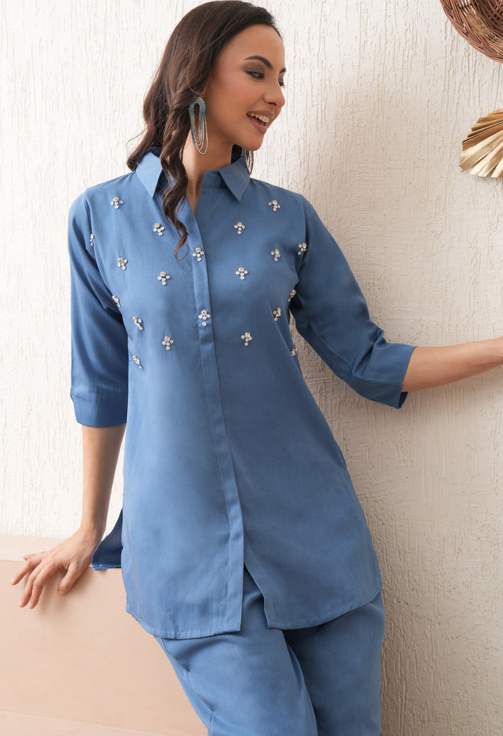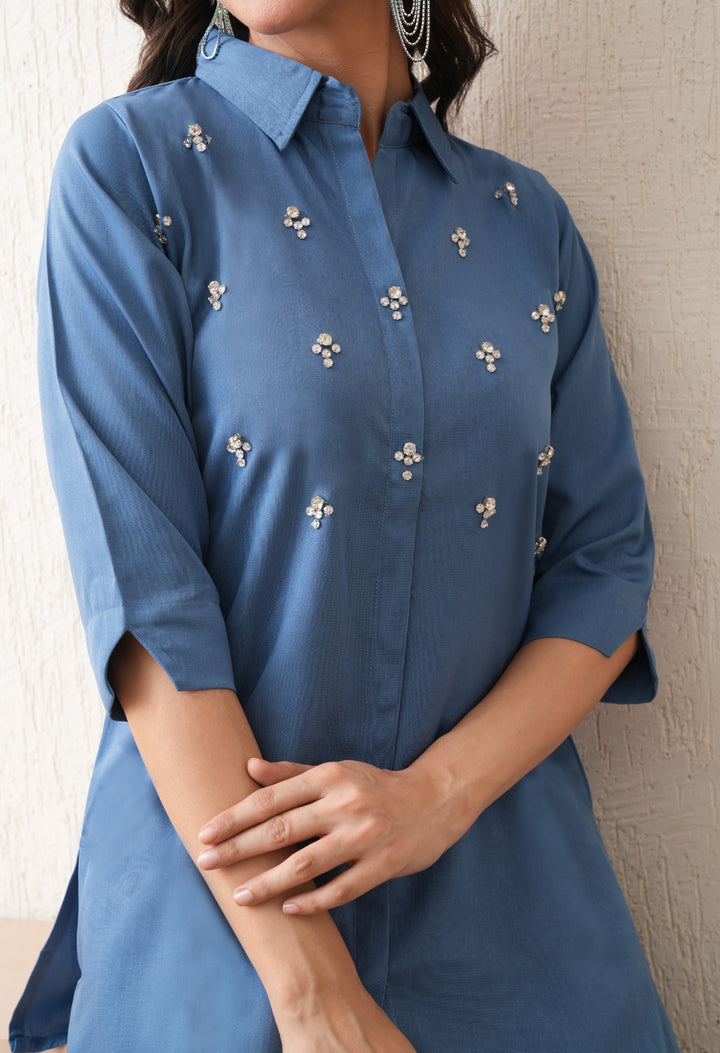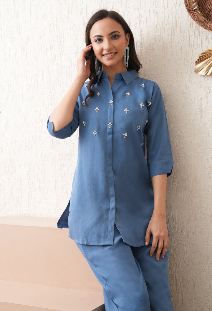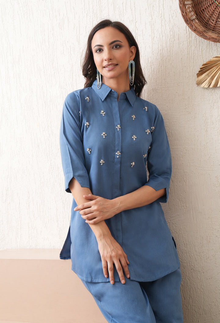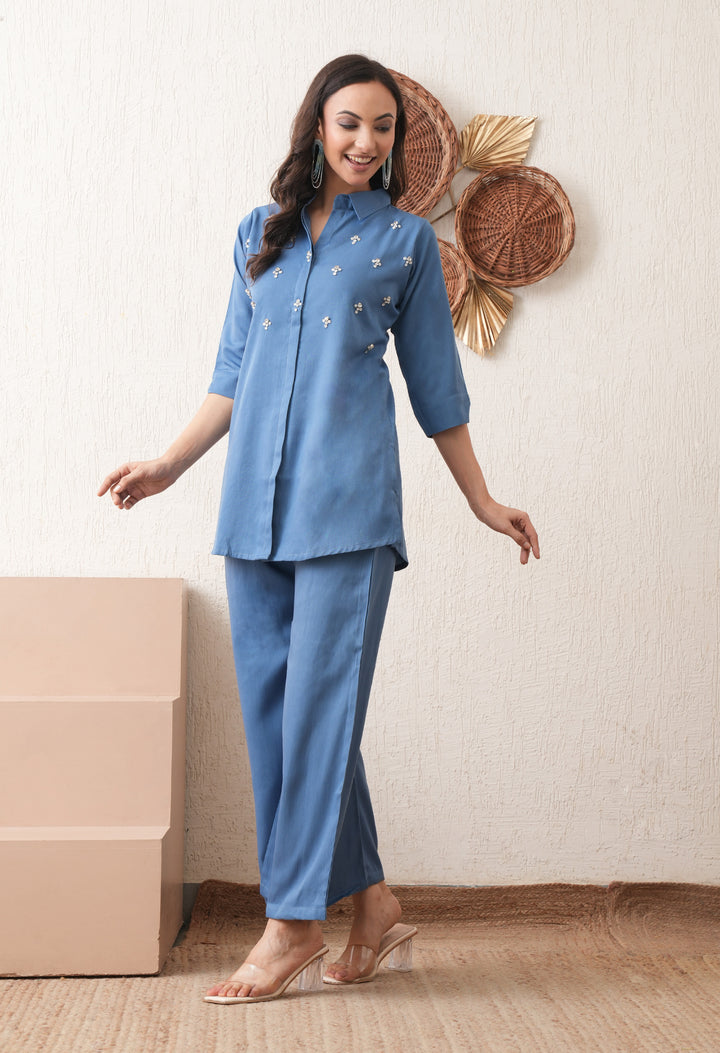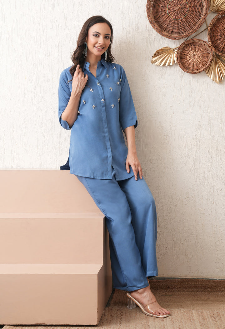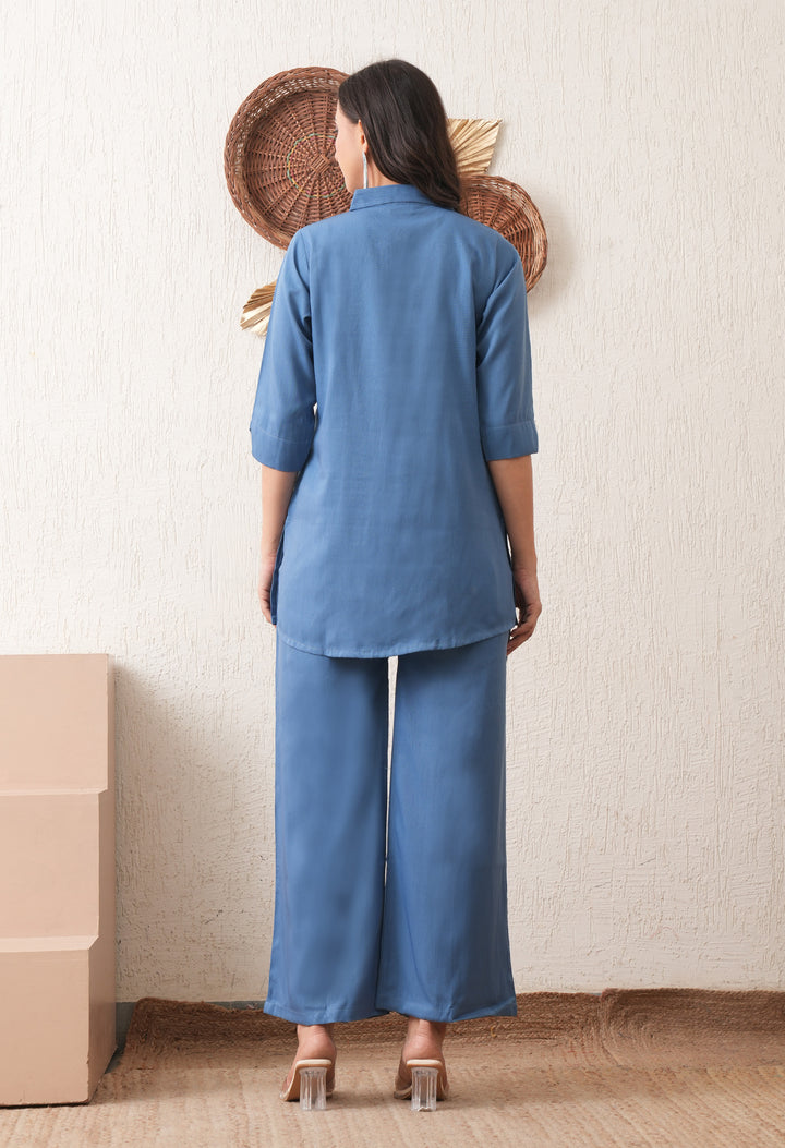 Step into effortless elegance with our Grace Blue Diamond Charm Co-ord Set. Crafted from premium cotton crepe, this chic outfit features subtle diamond work for a refined shimmer. The collared top with 3/4th sleeves pairs beautifully with a breezy plazzo that comes with a handy side pocket - perfect for both casual outings and festive gatherings. Light, comfortable, and fashion-forward - this co-ord set defines relaxed sophistication.