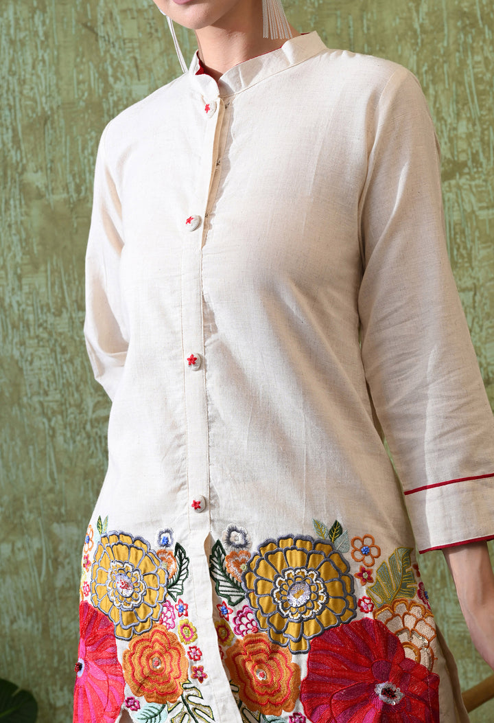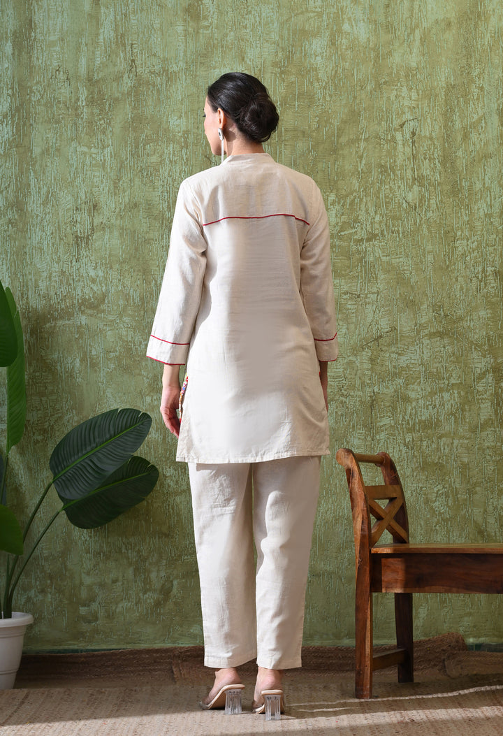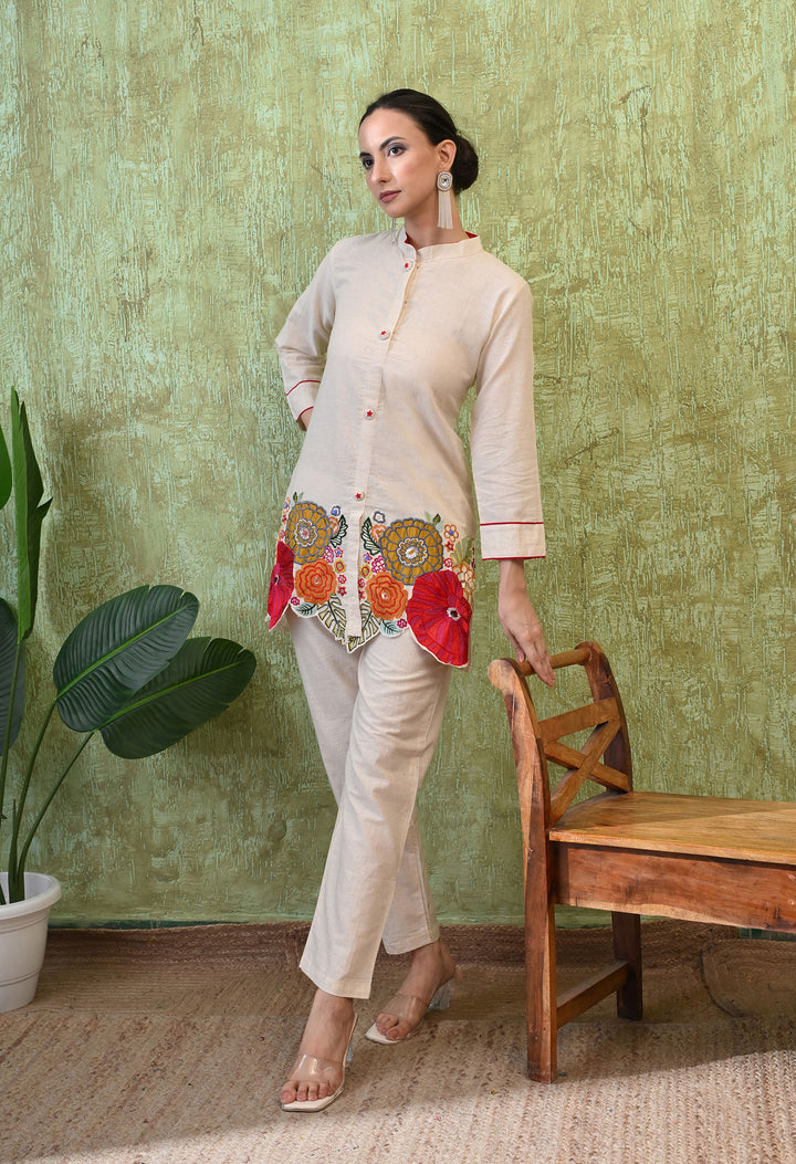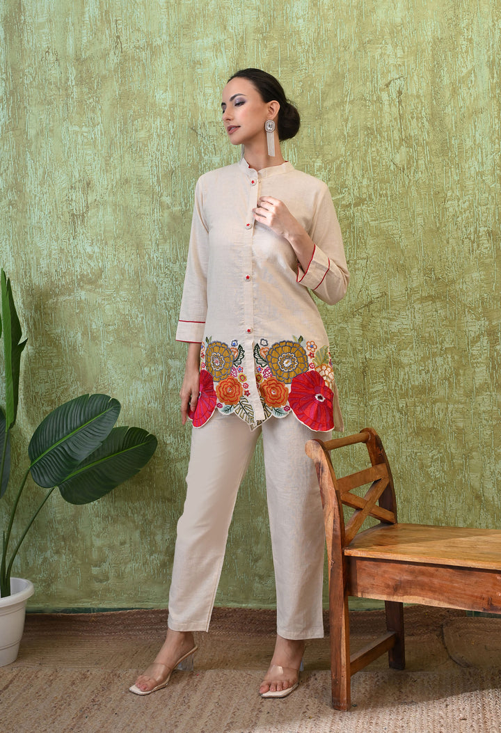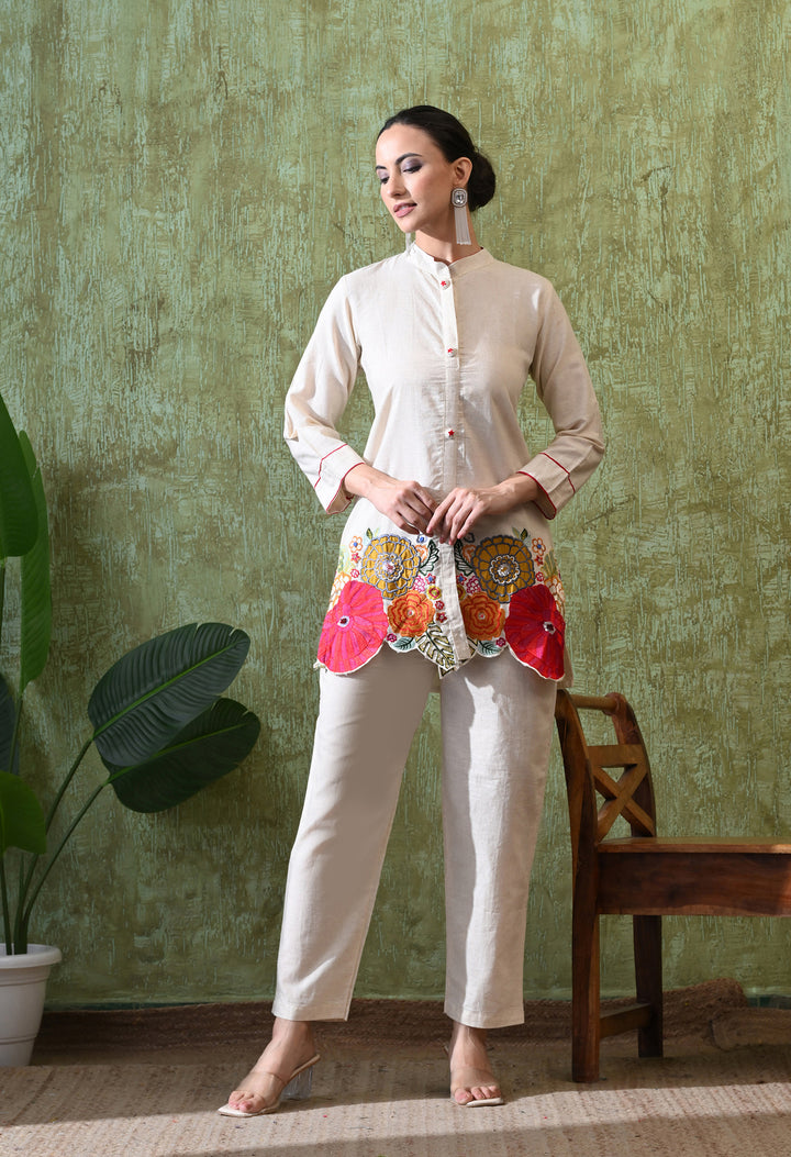 This Pearl Shine Cream Co-ord Set is the perfect mix of tradition and modern style. Made from soft khadi cotton, it keeps you cool and comfortable all day. The outfit is decorated with delicate thread work, shiny sequins, fine pearls, and cut dana that make it truly special. The collared top with full sleeves adds a touch of class, while the matching pants give it a stylish finish. With its beautiful cream shade, this outfit is ideal for festive gatherings, family functions, or even special outings. You’ll love how it makes you look graceful yet trendy. Don’t miss adding this to your wardrobe!