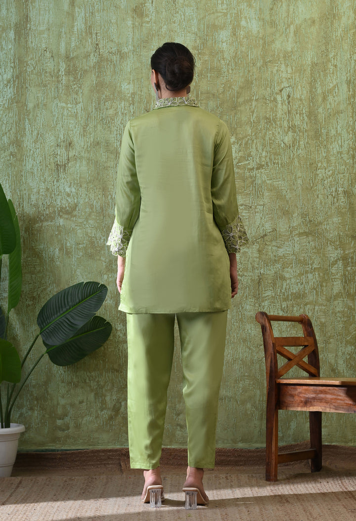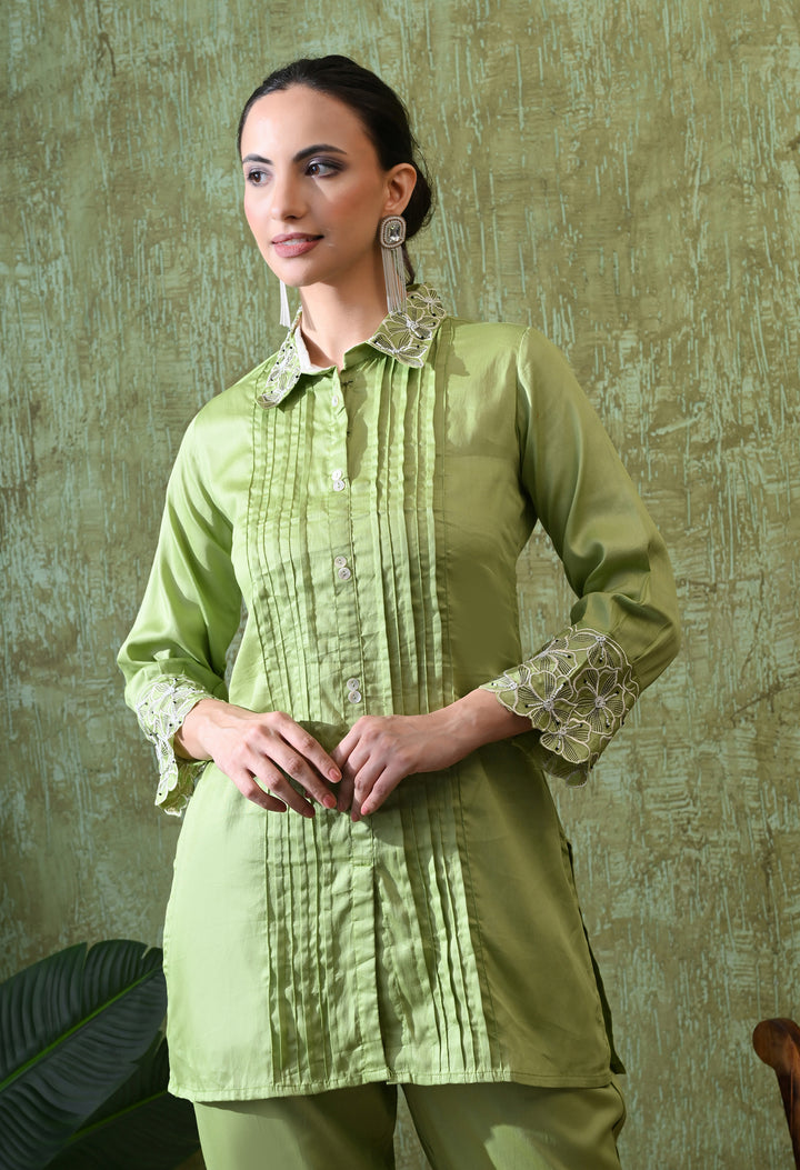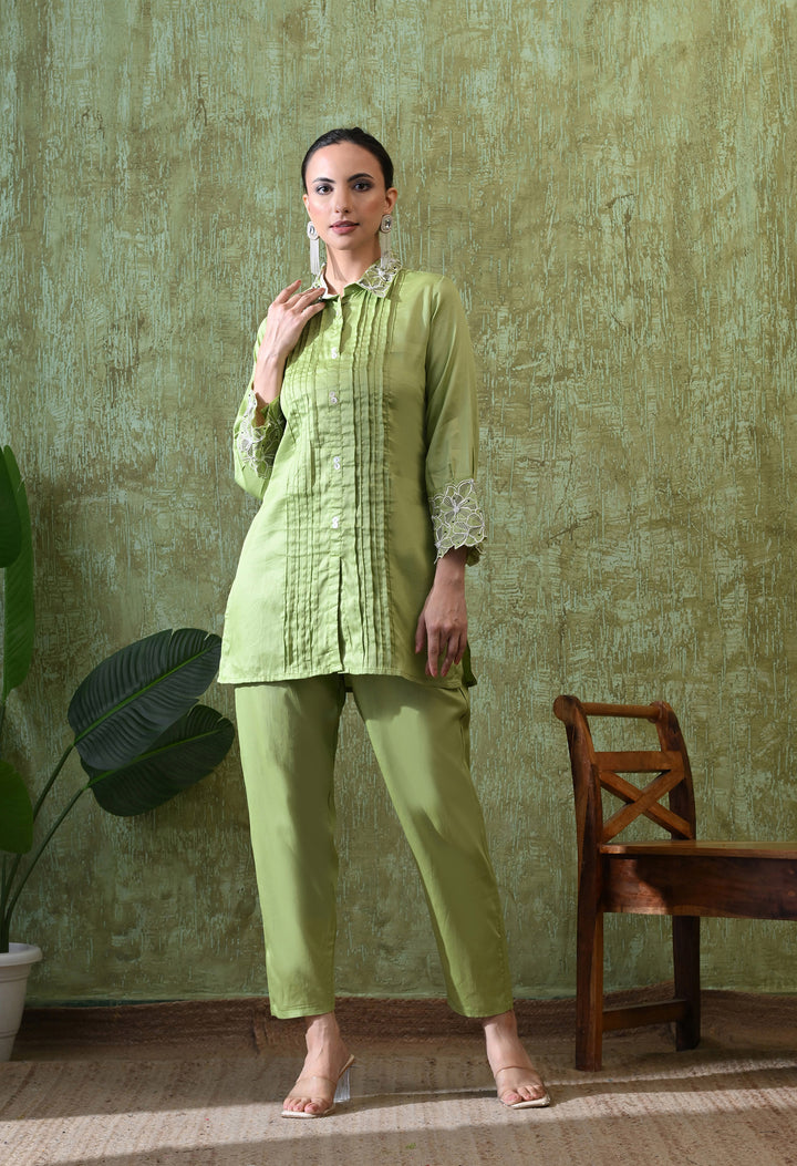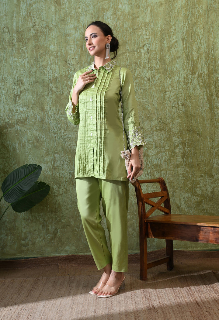 Add elegance to your wardrobe with this Graceful Green Thread Work Co-Ord. Made with soft cotton, this stylish outfit is light and comfortable for any occasion. The light green shade gives a fresh and soothing look, while the beautiful thread work and cut dana details make it eye-catching and classy. The full sleeves and smart collar neck add a touch of sophistication. The matching pant comes with a side zip for a perfect fit, making it both practical and stylish. With no lining, the set feels light and easy to wear. A perfect choice for modern festive and casual looks!