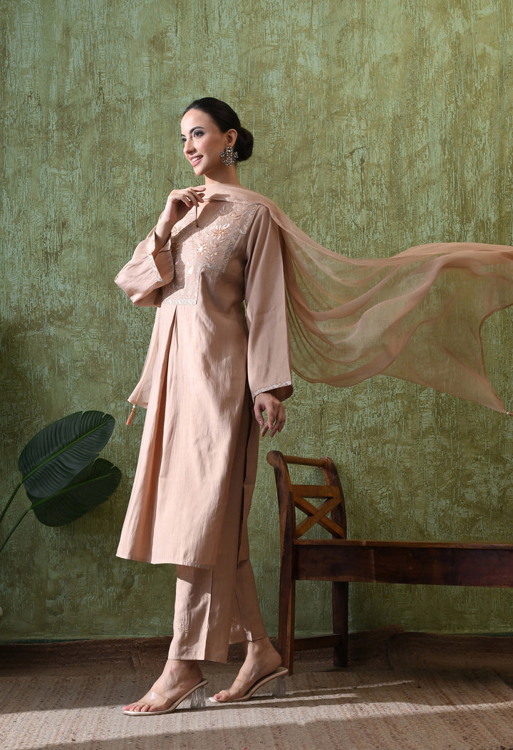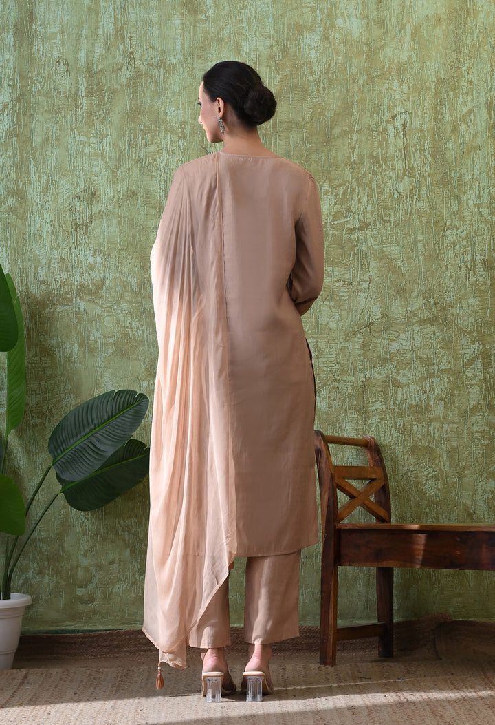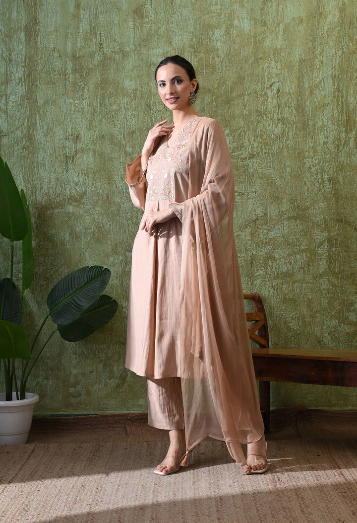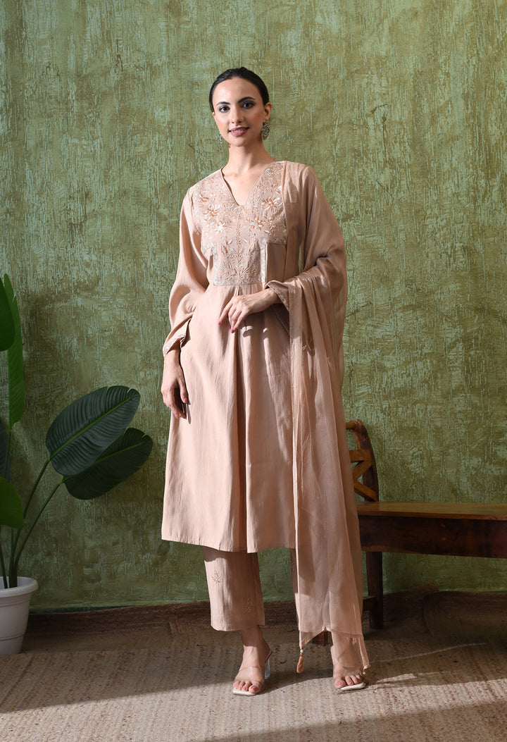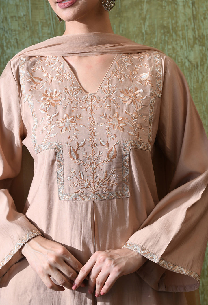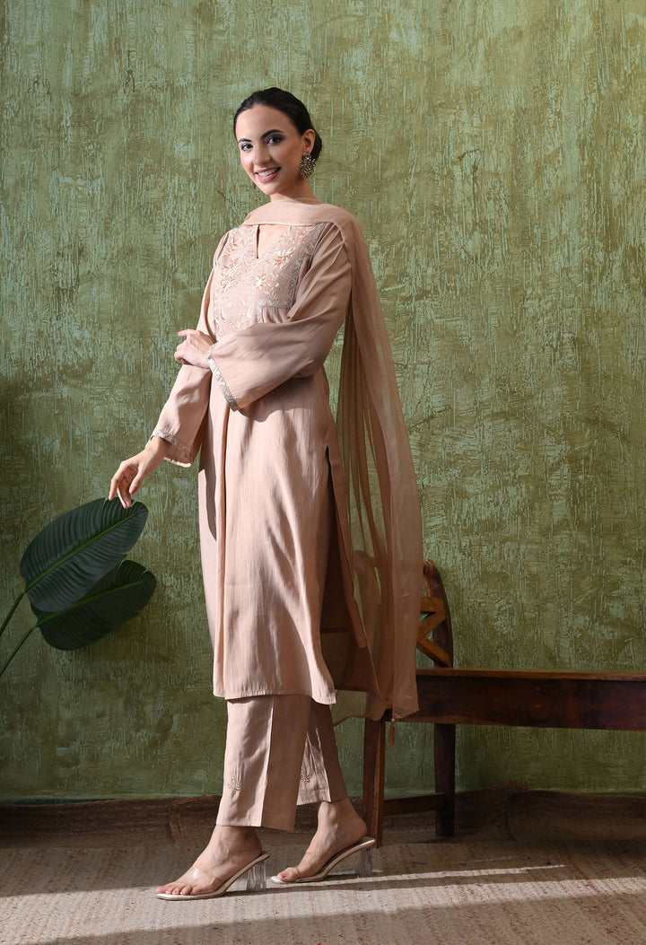 Step into timeless beauty with this Graceful Light Brown Pakistani Suit. Made from soft cotton fabric, this outfit brings comfort and style together. The delicate thread and zari work shine beautifully on the light brown color, making it perfect for festive and casual wear. Its V-neck and umbrella sleeves add a modern charm, while the pant with one-side pocket and all-over butti design gives a trendy touch. The chiffon dupatta with 4-side tassels completes the outfit with elegance. With lining for extra comfort, this suit is a must-have piece for anyone who loves grace and tradition in one.