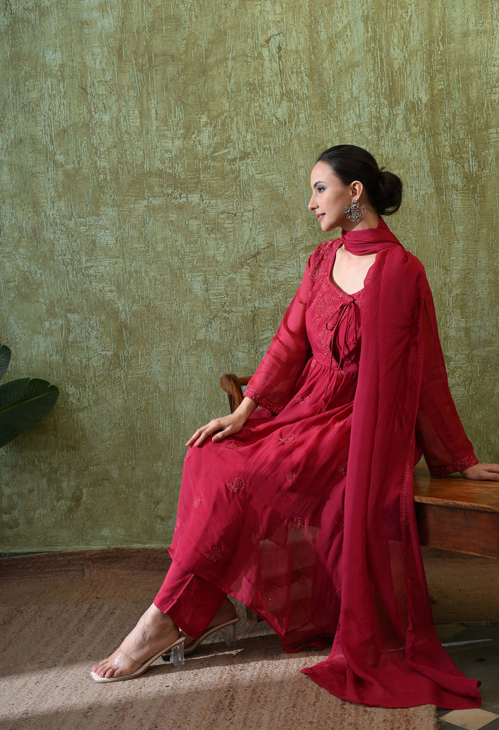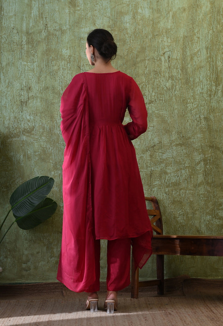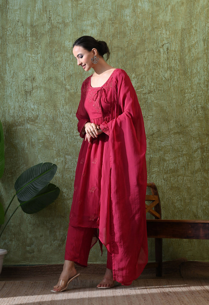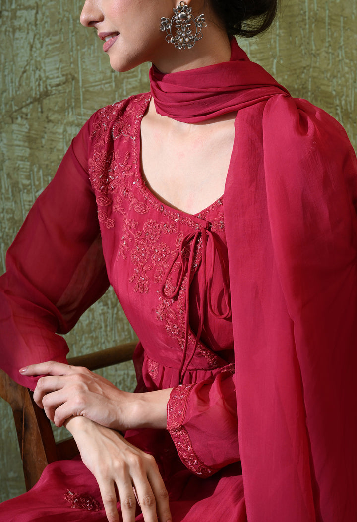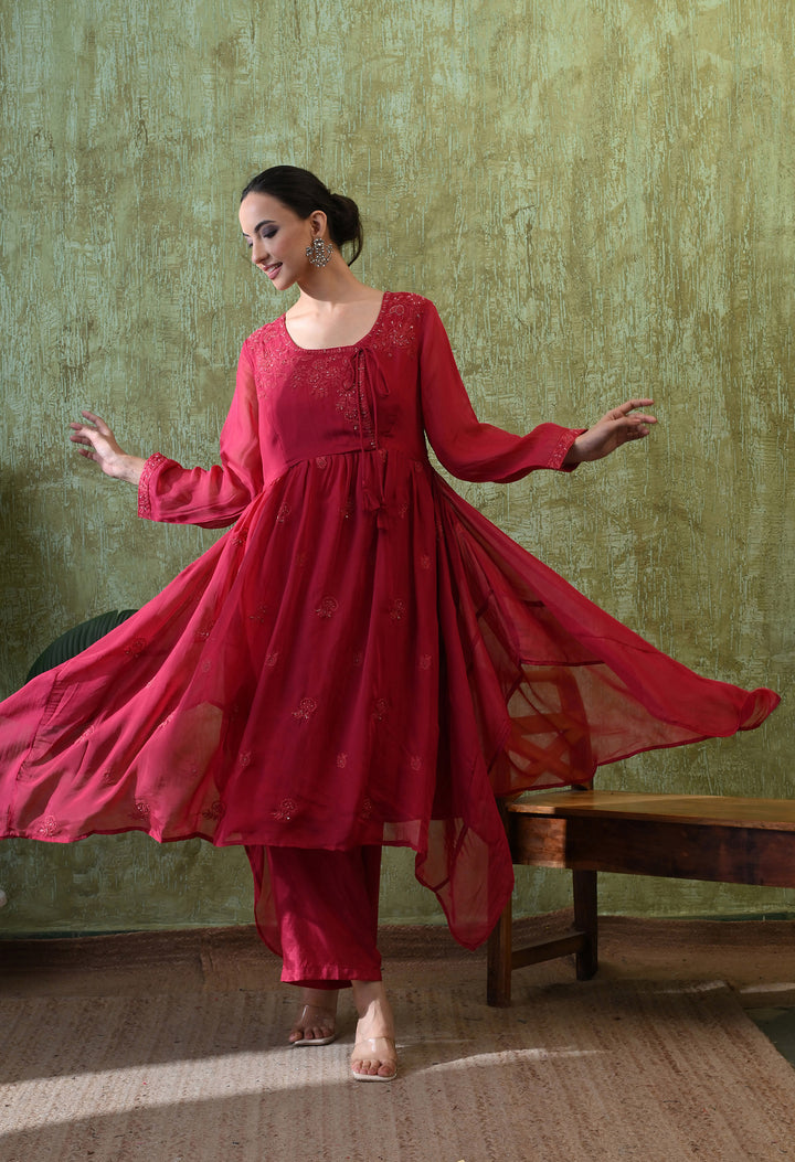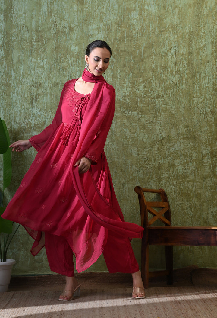 Bring home elegance with this Graceful Pink Angrakha Palazzo Set. Designed in a high-low Angrakha style, it blends tradition with a modern touch. Made from soft organza crepe, the outfit is beautifully decorated with thread, sequins, and cut dana work for a festive glow. The round neck and full sleeves add a graceful look, while the flowy palazzo pant with one side pocket ensures both style and comfort. The dupatta, crafted in organza crepe with a four-side thread border, completes the set perfectly. With lining for added comfort, this outfit is perfect for weddings, festive occasions, or special celebrations.