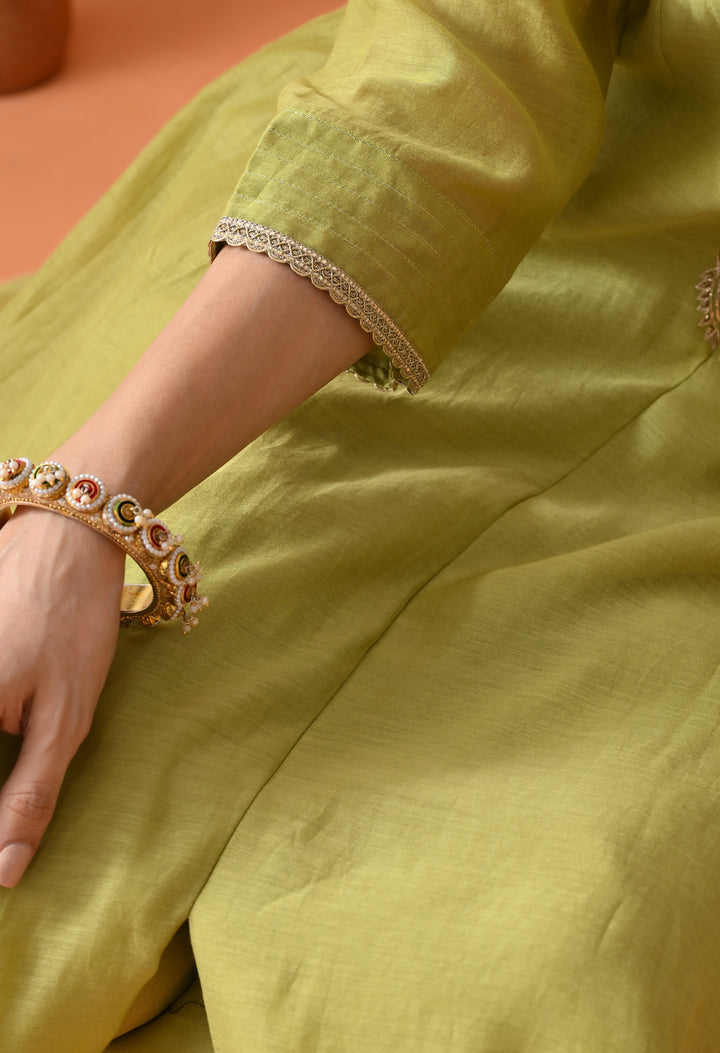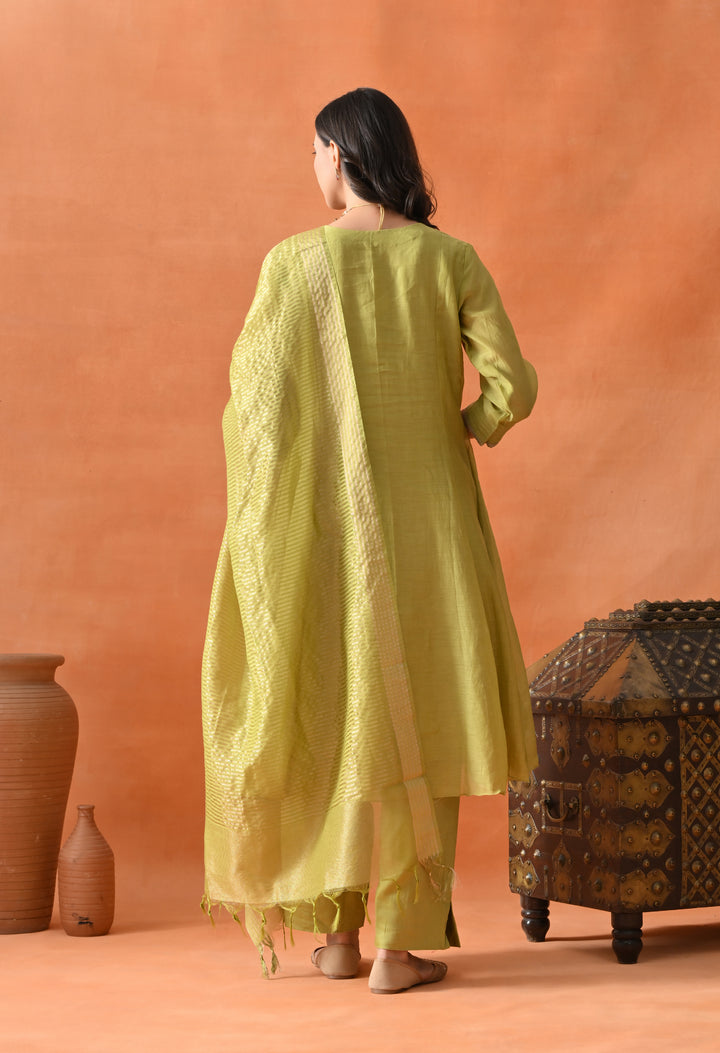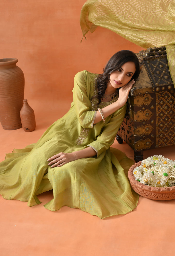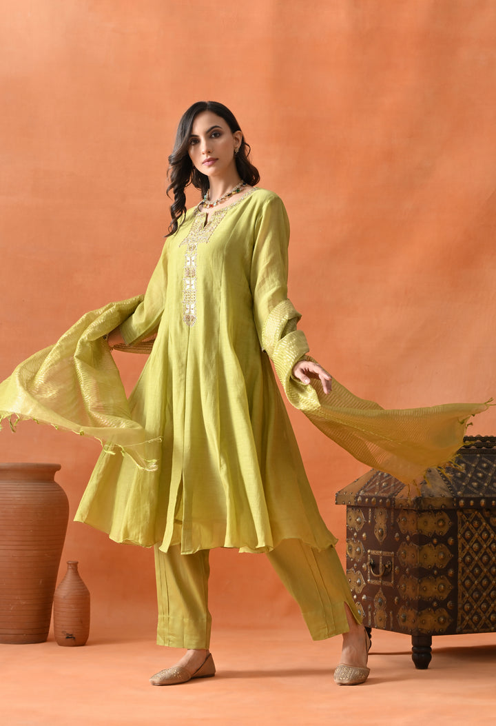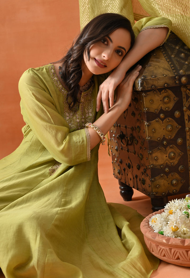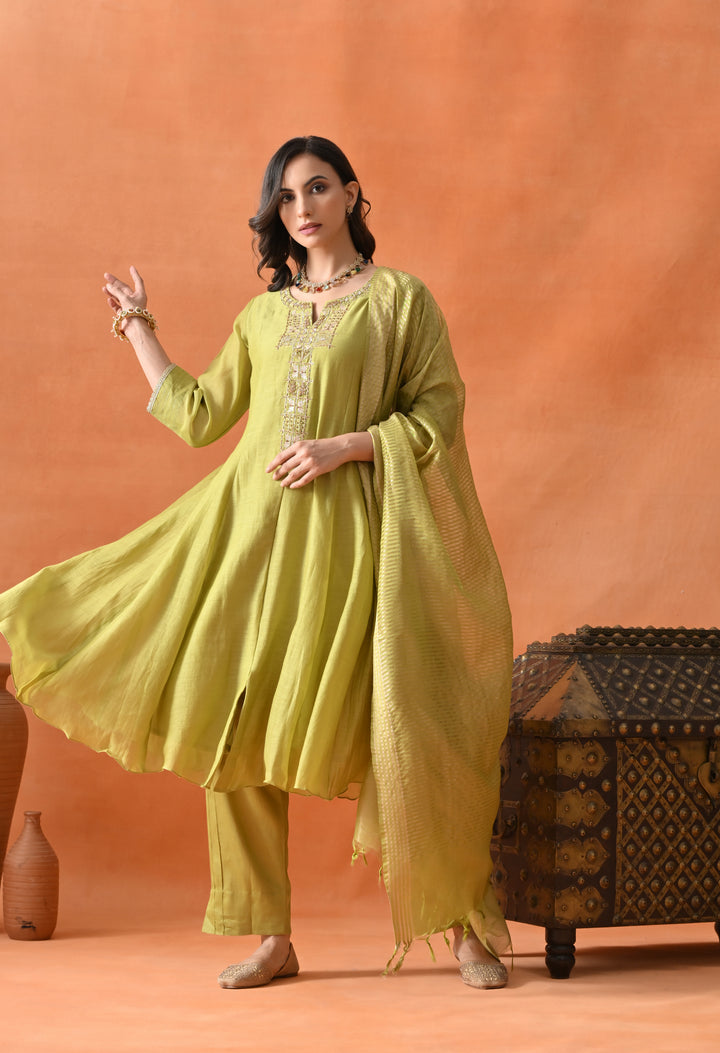 Look dazzling at any party with this Stunning Green Umbrella Suit. Crafted from soft chanderi silk, it feels light and comfortable. The umbrella-cut design gives it a beautiful flowy shape that makes you stand out. The suit is decorated with shiny dabka, cut dana, pearl work, and elegant zari that sparkle perfectly. The 3/4 sleeves and round neck with V cut add style and grace. Paired with smooth pants and a rich brocket silk (banarasi) dupatta, this suit is perfect for special occasions when you want to look your best and feel confident.