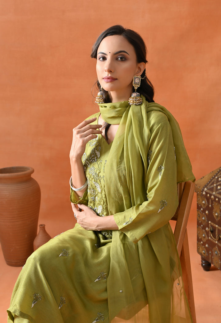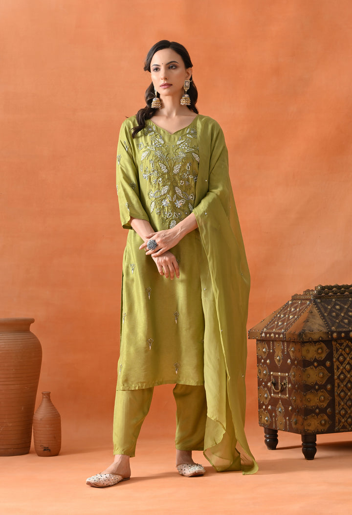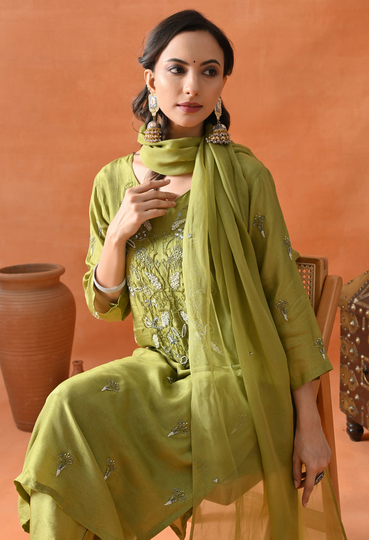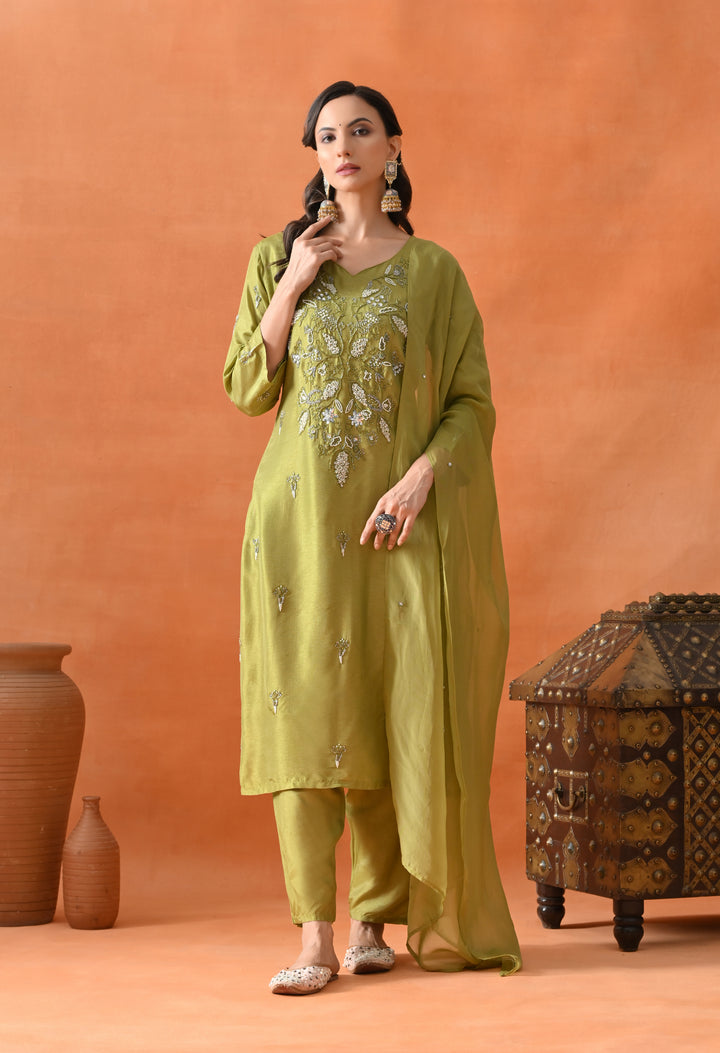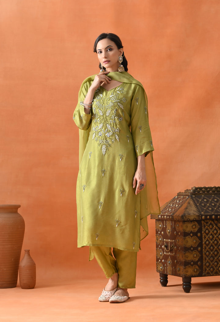 This beautiful green straight suit is perfect for parties. Made from soft silk fabric, it shines with cut dana, pearl, and sequins work that adds a sparkling touch. The round neck with a V-cut and 3/4 sleeves make it stylish and comfortable to wear. The matching pants complete the set, offering ease and grace. The organza crepe dupatta, decorated with sequins buti, adds extra charm to your look. With its perfect blend of comfort and glamour, this suit is a must-have for your festive wardrobe. Buy it now and shine at every event!