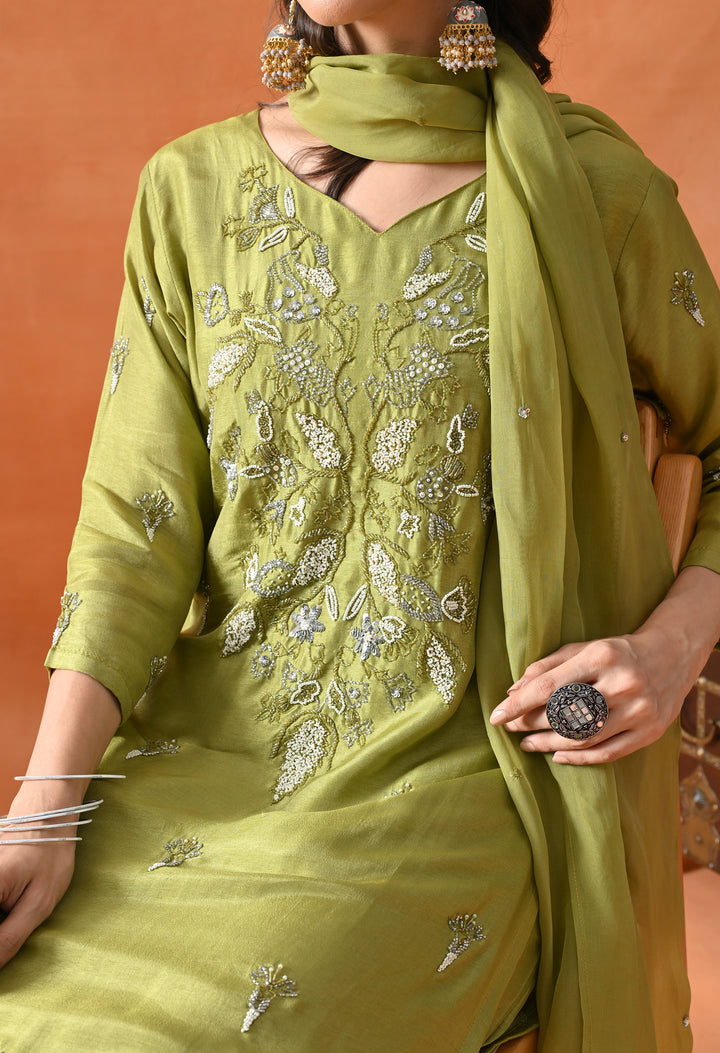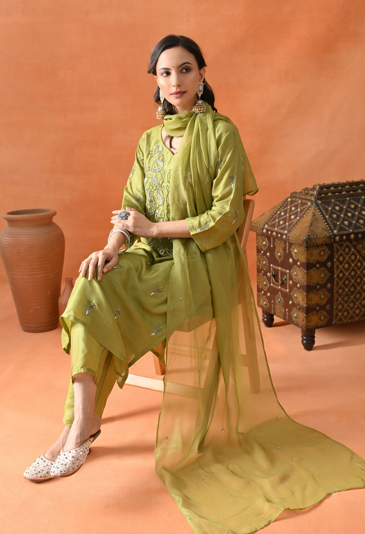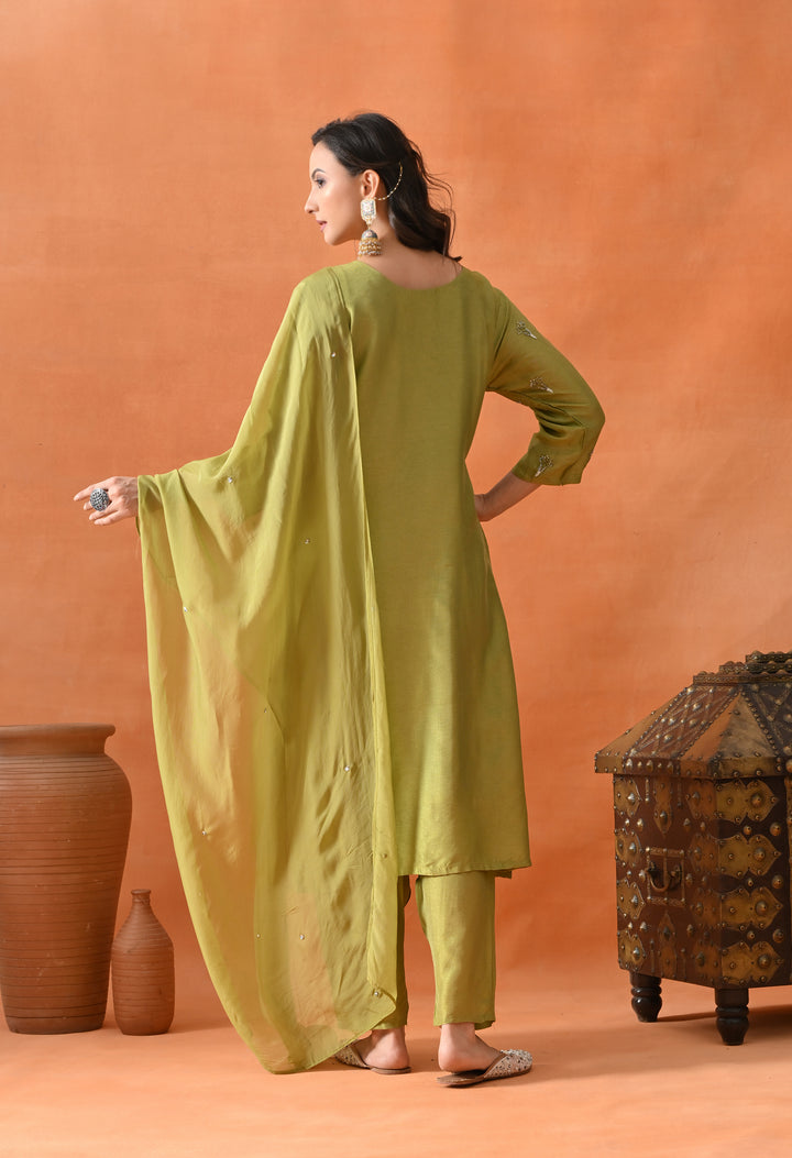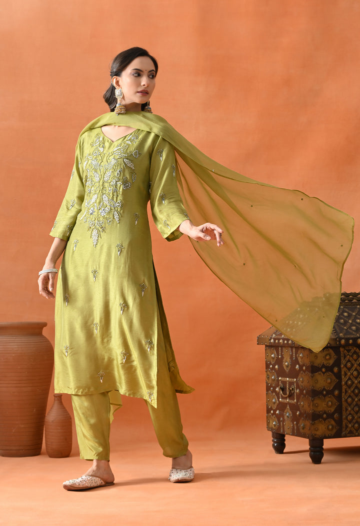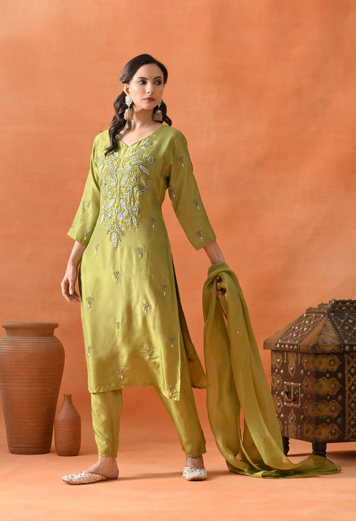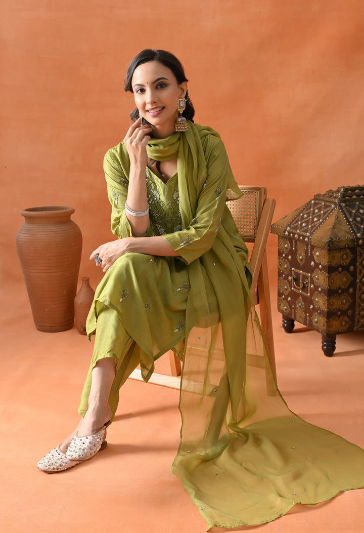This beautiful green straight suit is perfect for parties. Made from soft silk fabric, it shines with cut dana, pearl, and sequins work that adds a sparkling touch. The round neck with a V-cut and 3/4 sleeves make it stylish and comfortable to wear. The matching pants complete the set, offering ease and grace. The organza crepe dupatta, decorated with sequins buti, adds extra charm to your look. With its perfect blend of comfort and glamour, this suit is a must-have for your festive wardrobe. Buy it now and shine at every event!