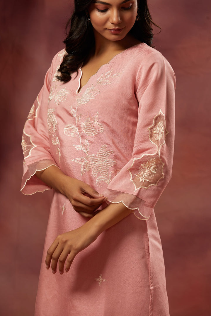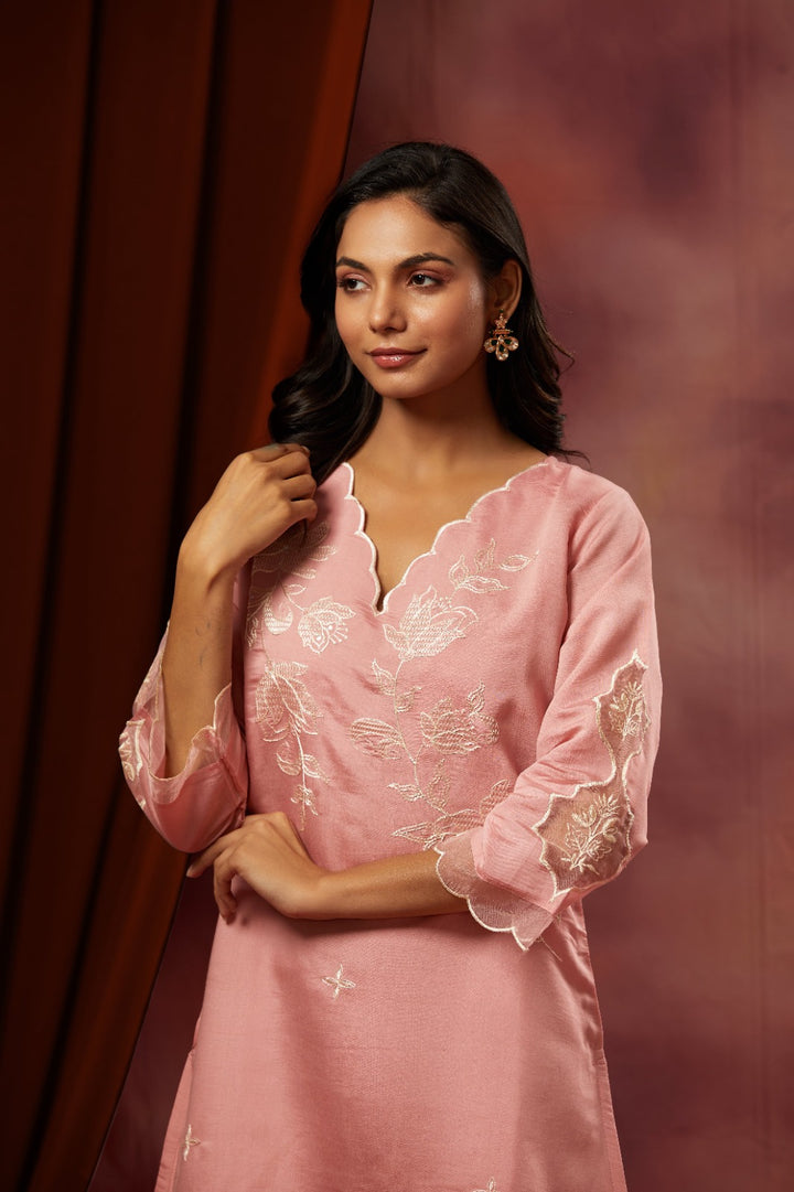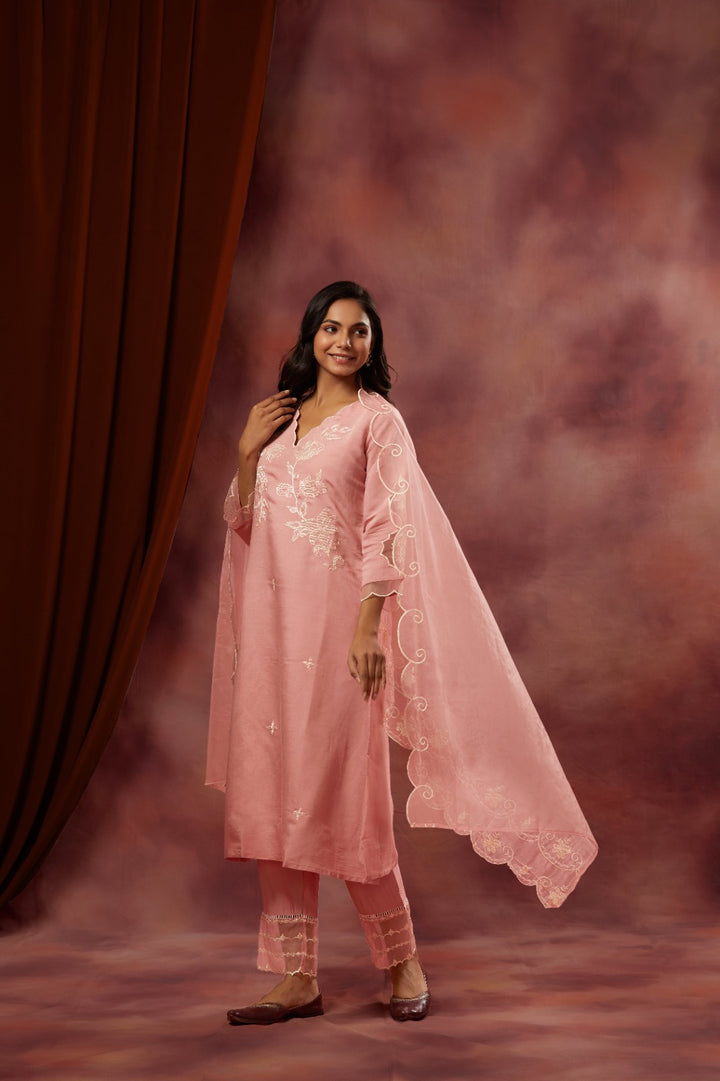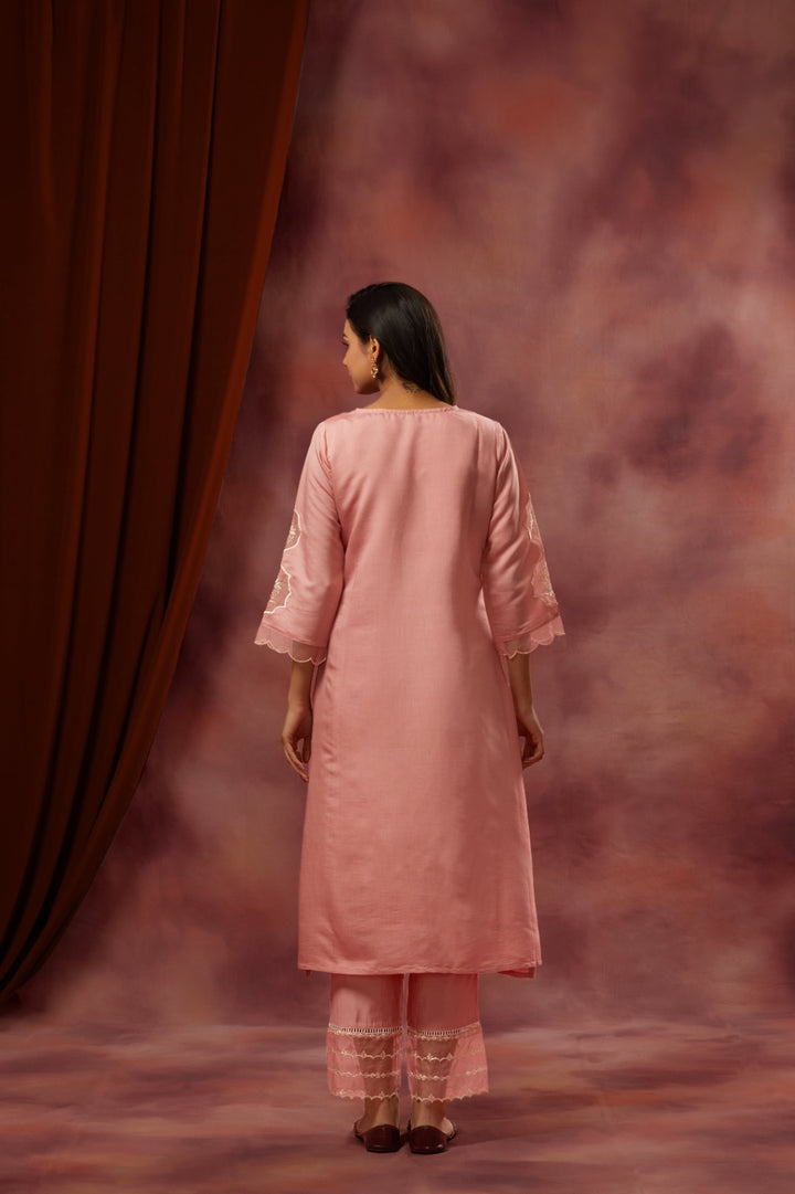 Colour: In a soothing peach pink hue, this suit exudes a sense of grace and femininity, making it a versatile choice for various events.