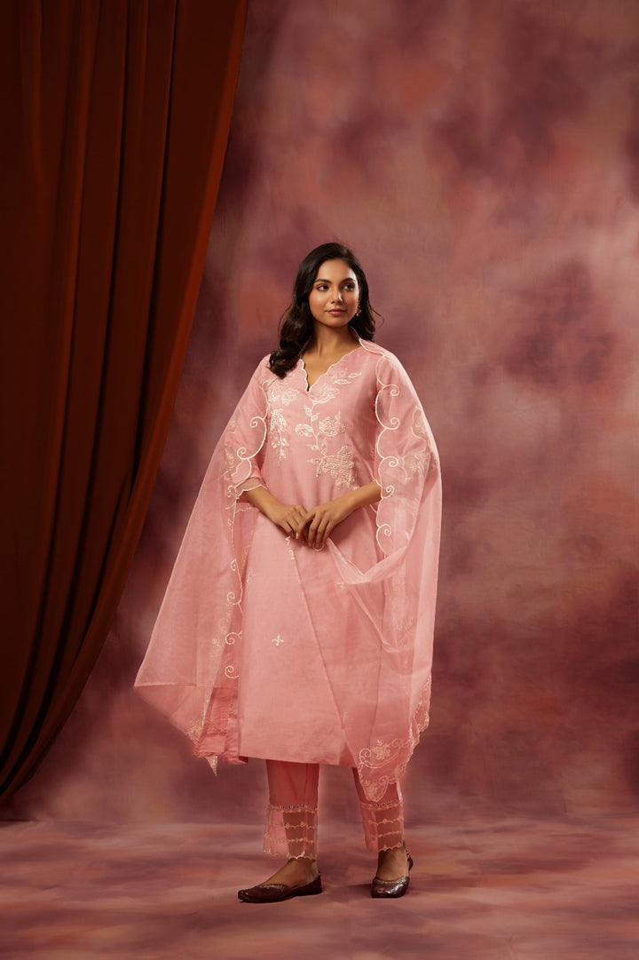 Dupatta: The peach pink organza dupatta adds a touch of delicate charm, enhancing the overall appeal of the outfit.