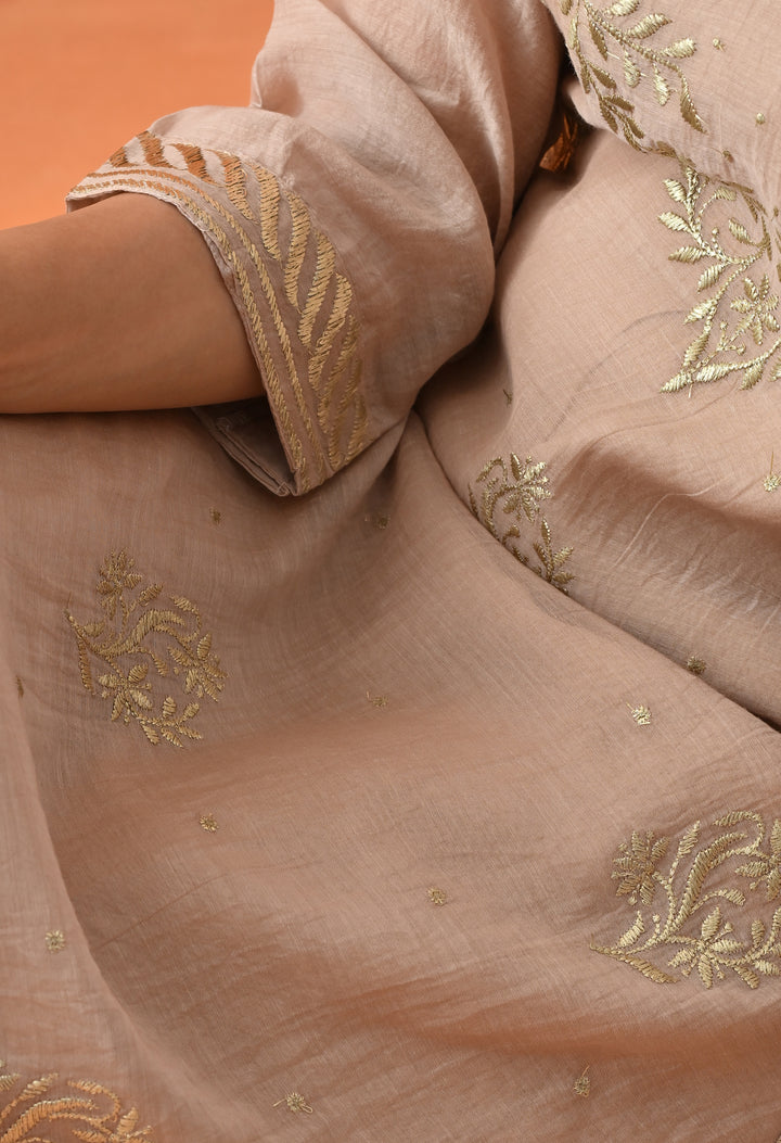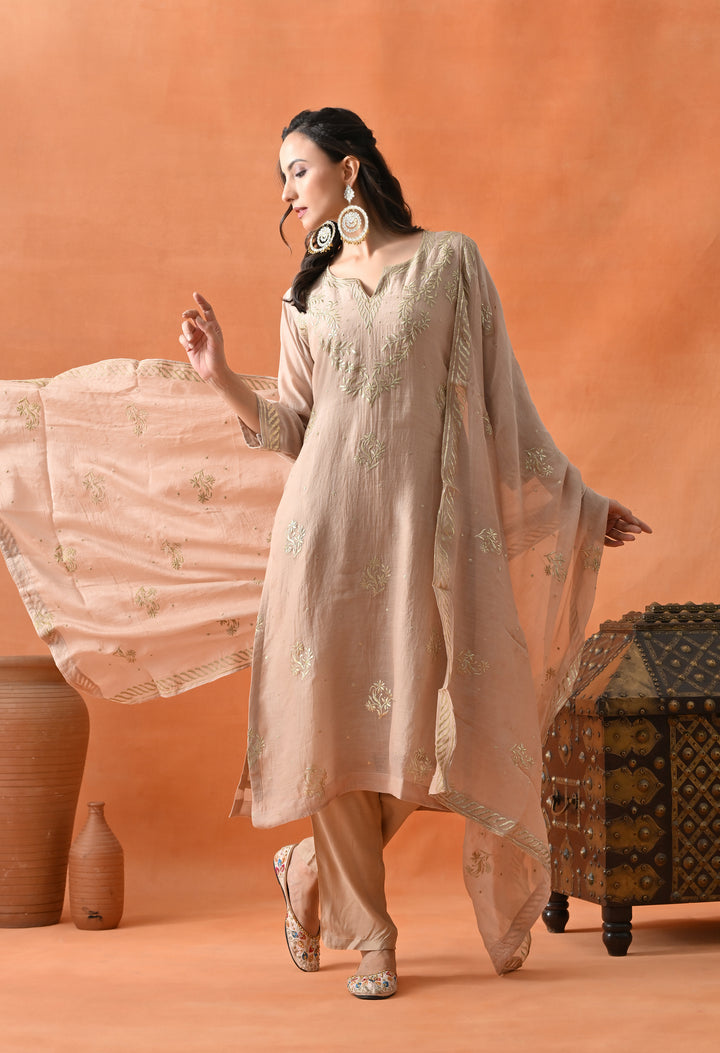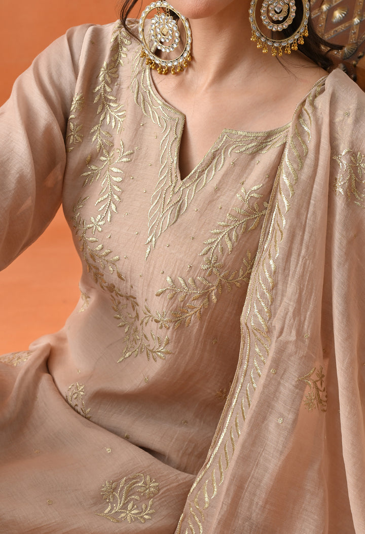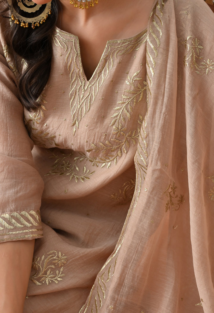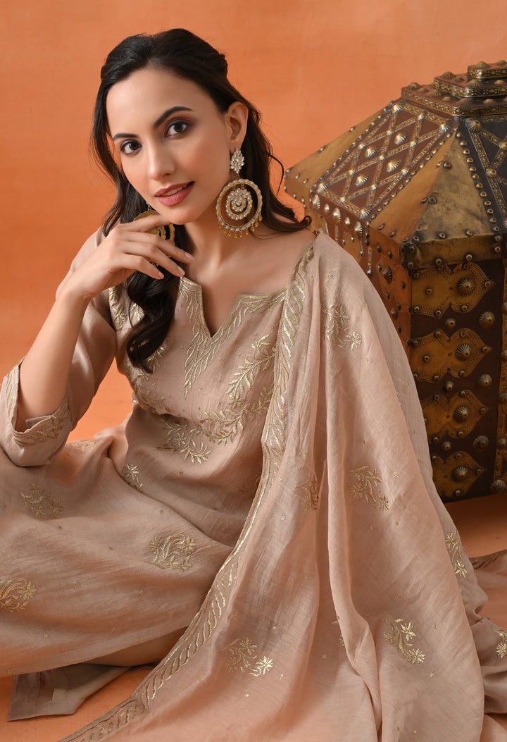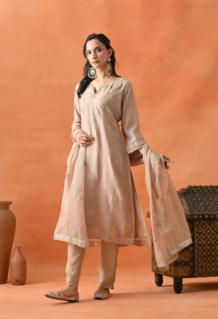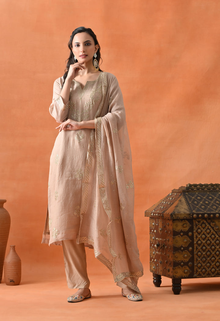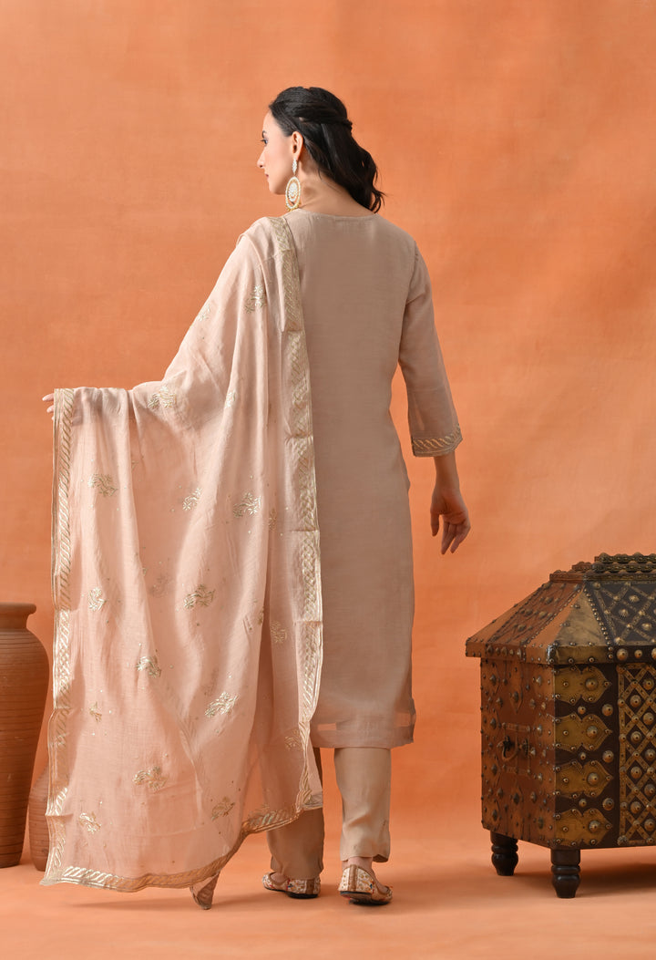 Add timeless charm to your wardrobe with this beautiful very light brown suit set. Made from soft chanderi cotton, this suit is decorated with delicate gotta work that shines just right. It features a classy round neck with a V cut and 3/4 sleeves for comfort and style. The matching pant is simple yet elegant, and the chanderi cotton dupatta with a four-side border, gotta detailing, and pretty butis completes the look. Fully lined for a neat finish, this outfit is perfect for festivals, small functions, or casual get-togethers.