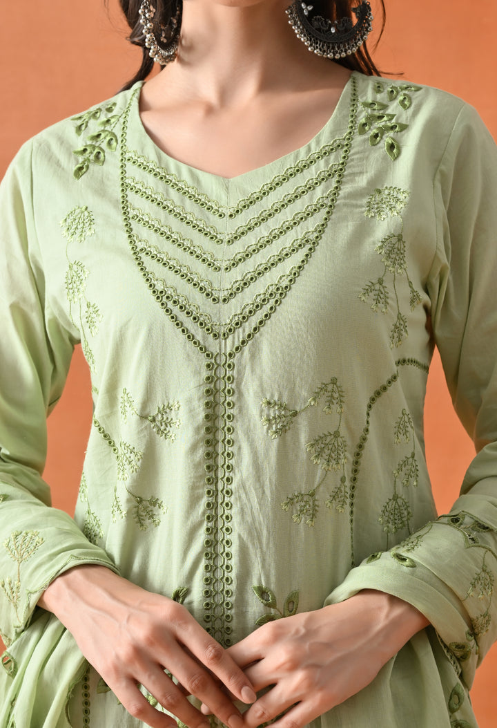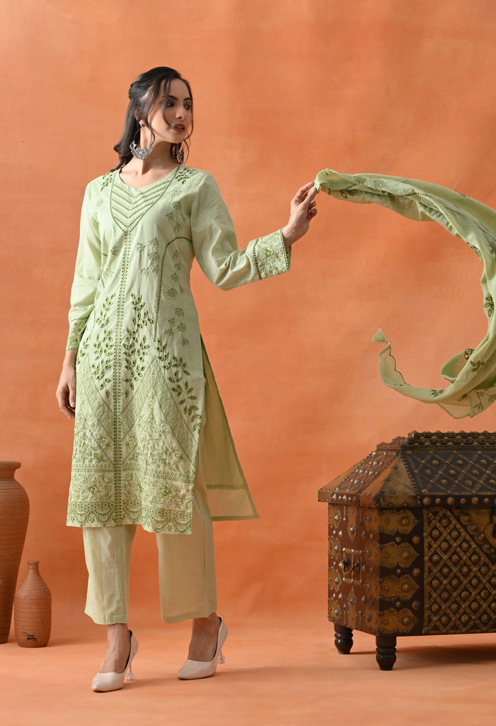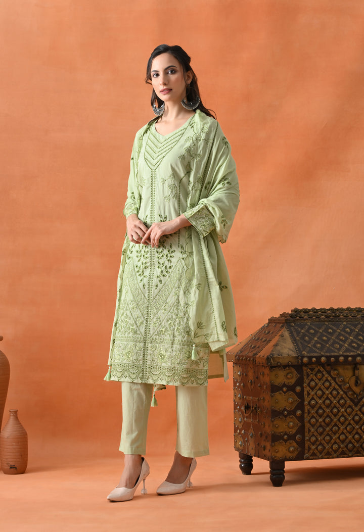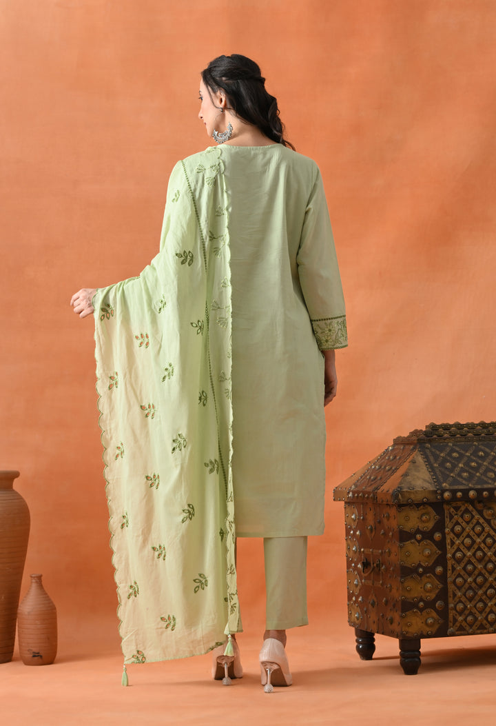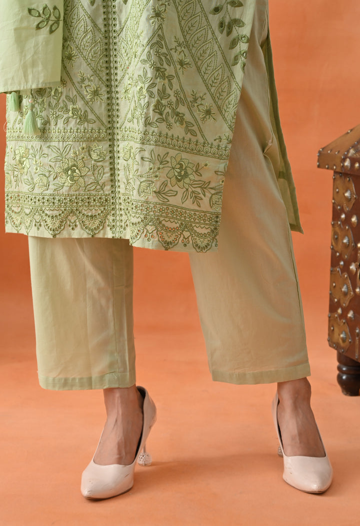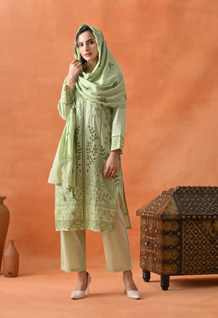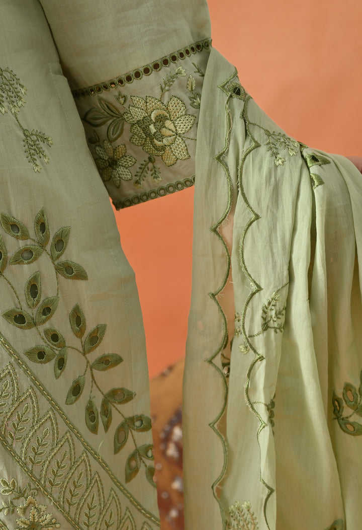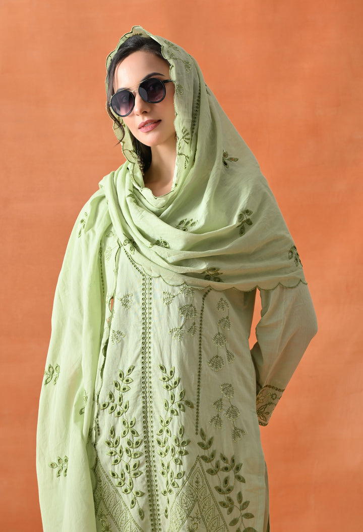 Step into grace with this stunning light green straight suit, made for anyone who loves classy fashion. The suit features beautiful siply and thread work that adds a lovely touch to the overall look. The round neck with a V-shape adds style and comfort. Full sleeves and soft lining keep you relaxed all day. The pant comes with a one-side pocket for added convenience. The cotton dupatta is the real starādecorated with siply and thread work, finished with 4-sided tassels and elegant scalping. Perfect for festive days, family events, or even casual gatherings!