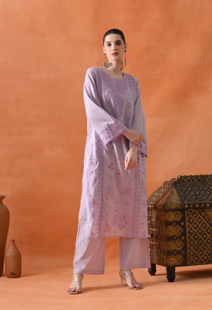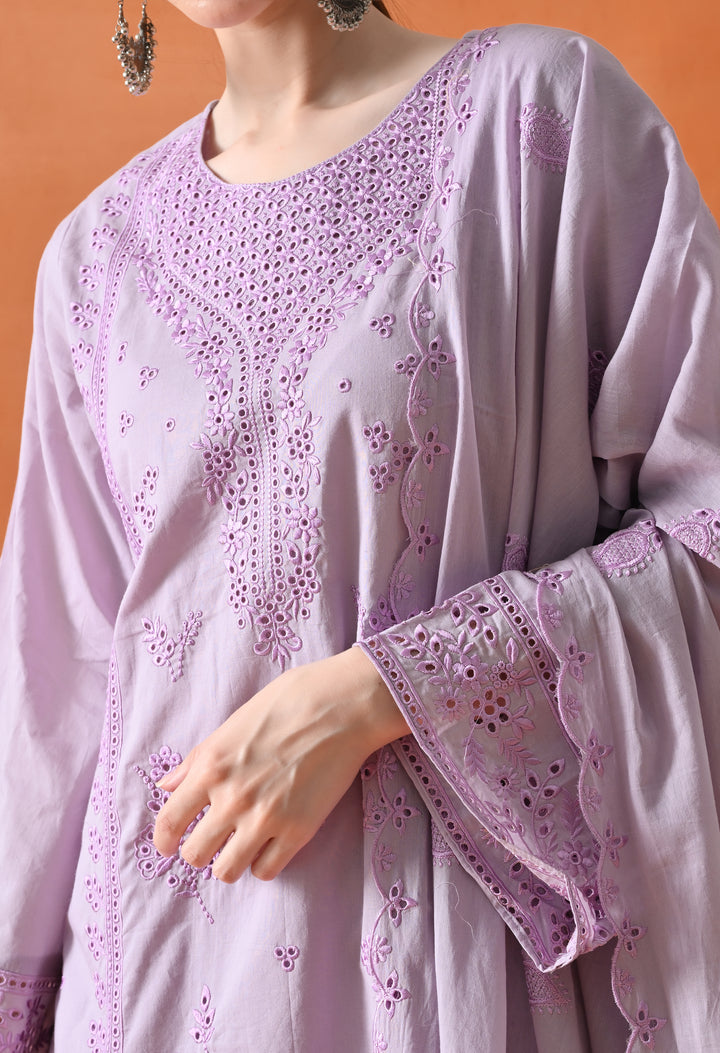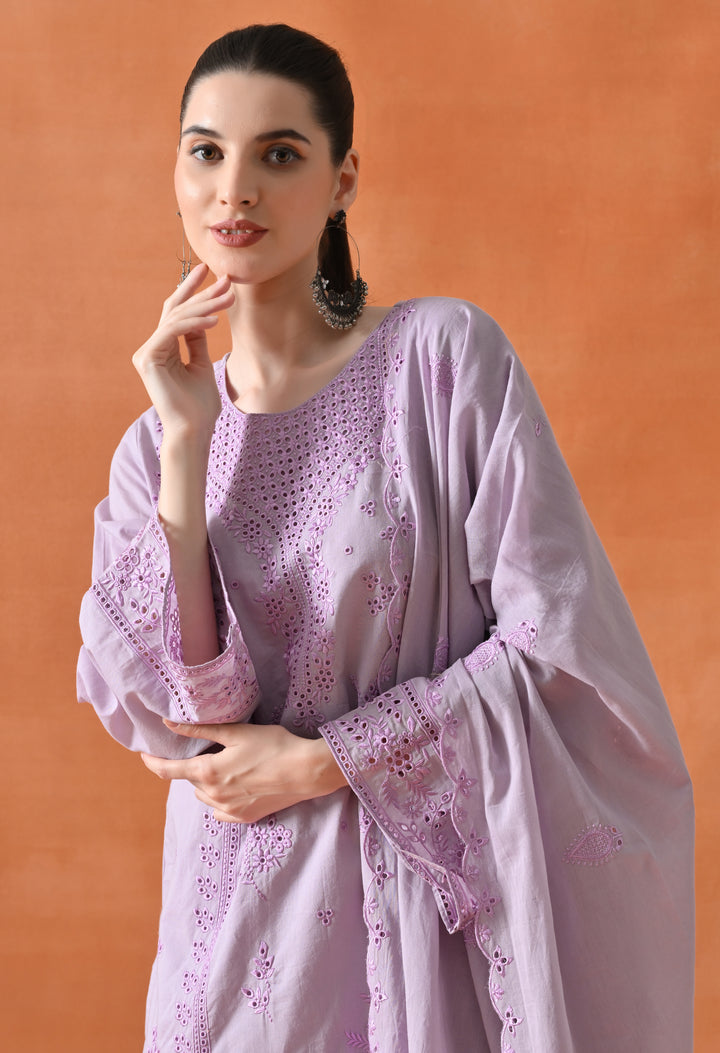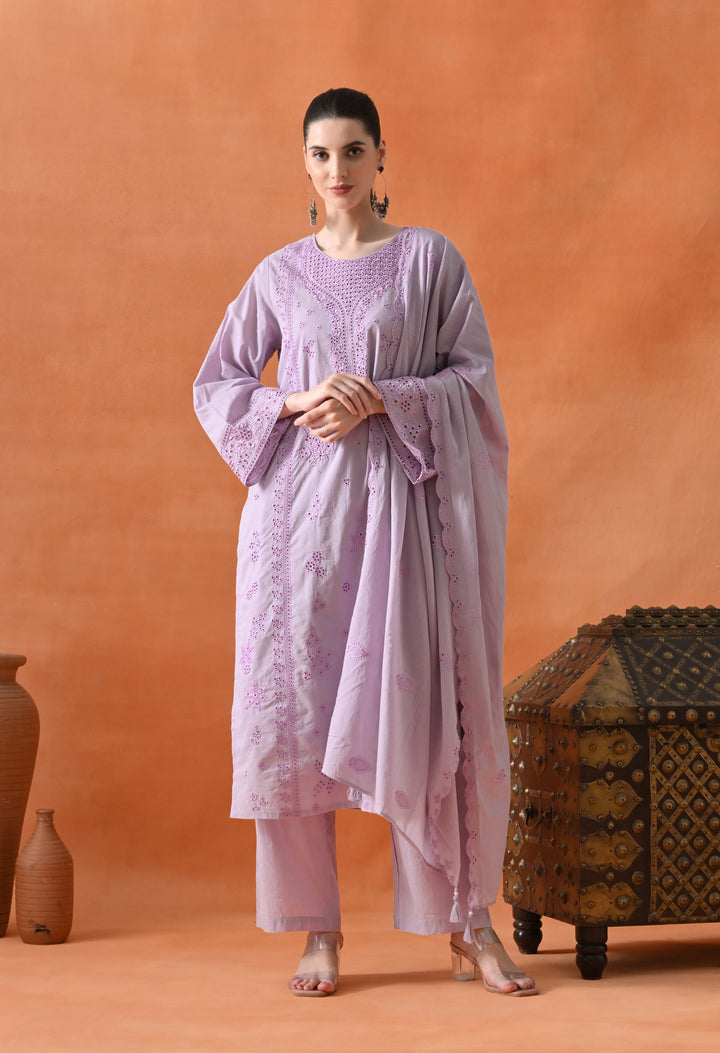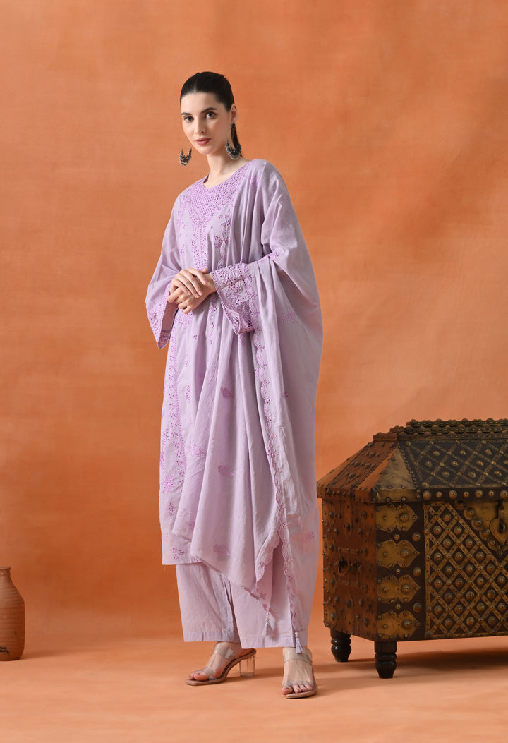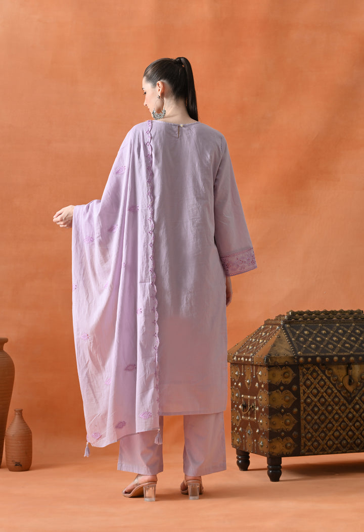 Step into elegance with this light purple straight cotton suit. Designed for comfort and grace, it features beautiful siply and thread work that adds a subtle charm. The soft cotton fabric is perfect for all-day wear, and the suit is fully lined for a smooth feel. The 3/4 sleeves and round neckline give a neat and stylish look. It comes with a palazzo that has a handy one-side pocket. The cotton dupatta is the highlight, detailed with thread work, 4-side tassels, and scalping that makes it truly eye-catching. Perfect for casual outings or family gatherings!