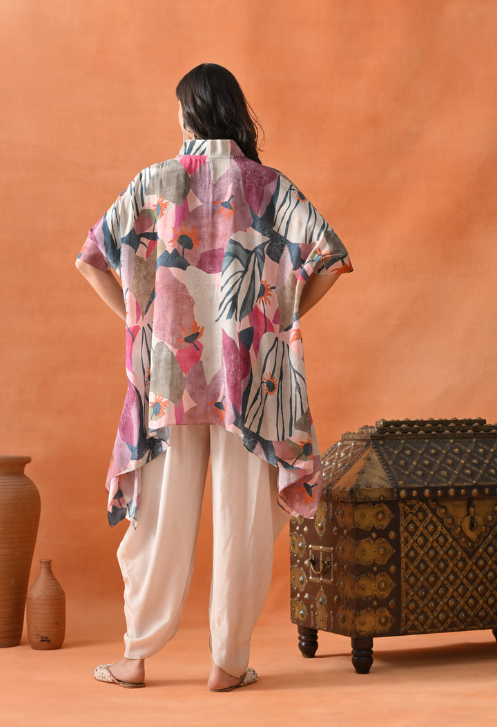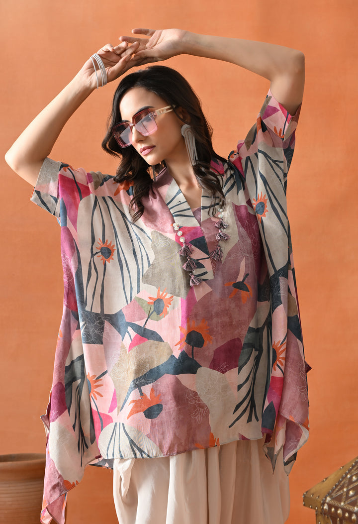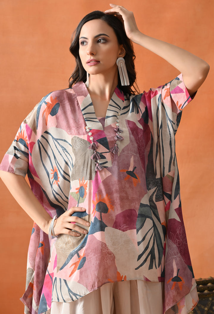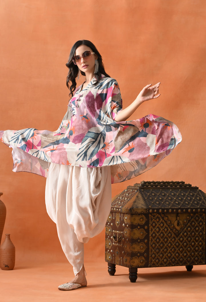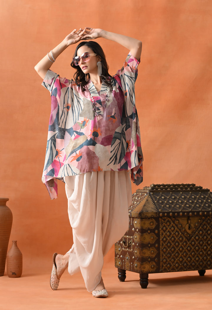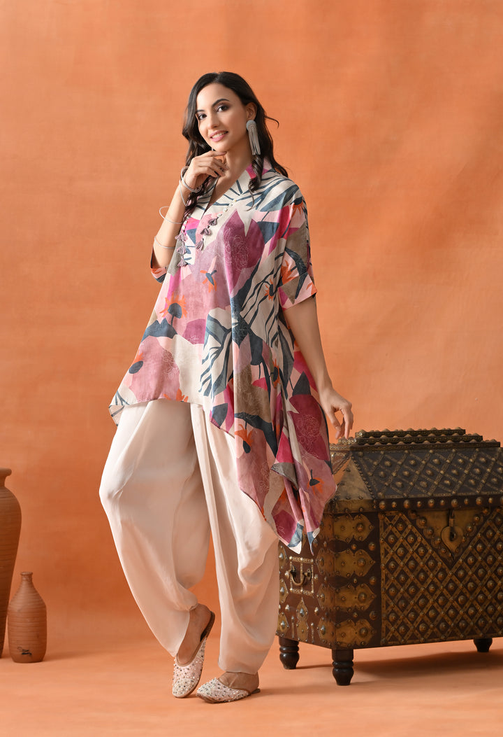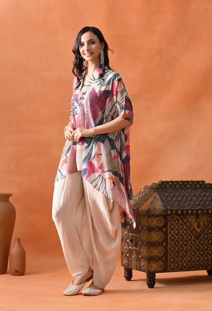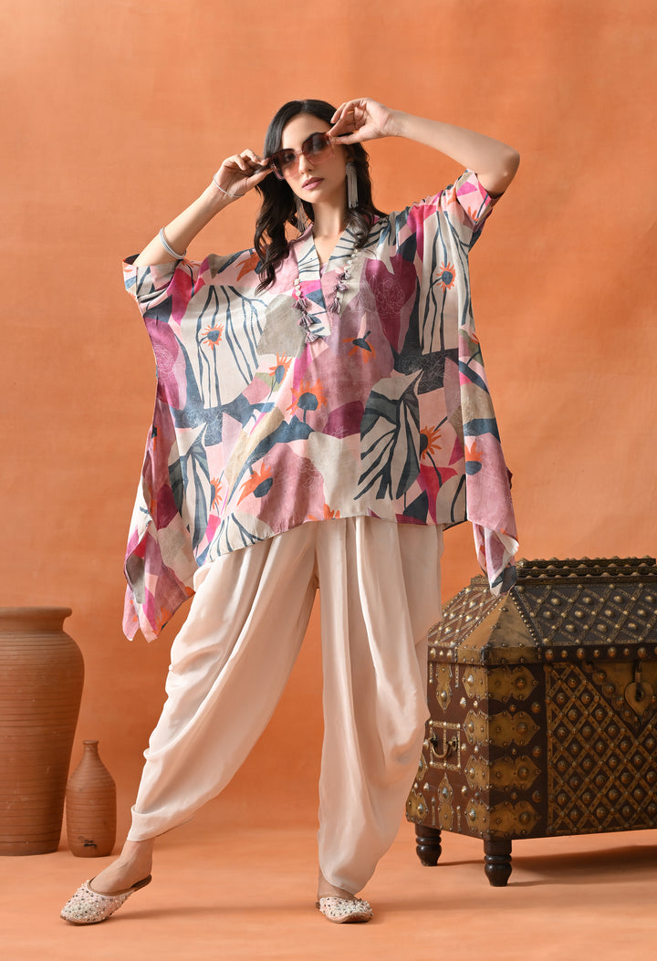Step into elegance with this pastel floral print kaftan-style co-ord set, perfect for festive vibes and celebrations! Made from soft crepe, the high-low top shines with sequins, pearls, and playful tassels, adding sparkle to your every move. The flowy V-neck top pairs beautifully with a stylish dhoti for a modern yet traditional twist. Half sleeves keep it breezy and fun. Whether it's a festive gathering or a special day out, this outfit is sure to make you feel confident and stylish. It’s trendy, unique, and absolutely stunning!