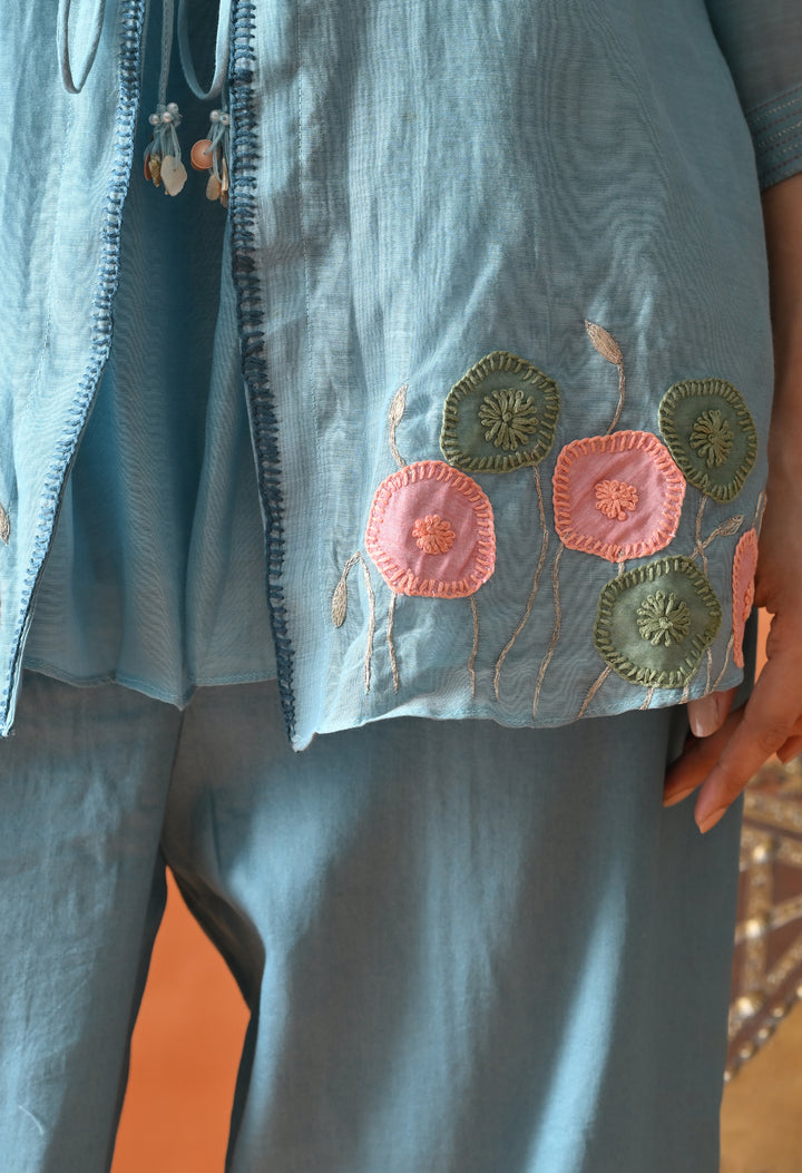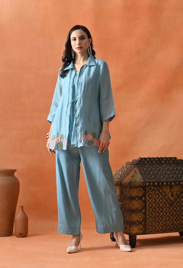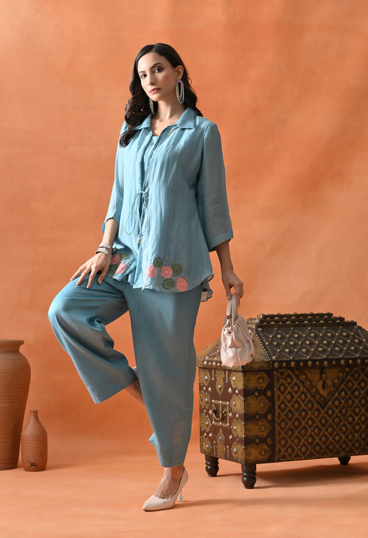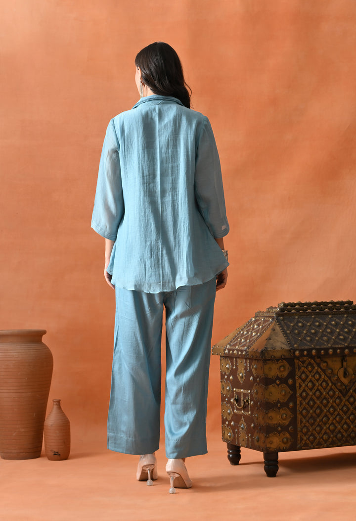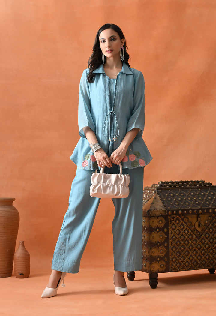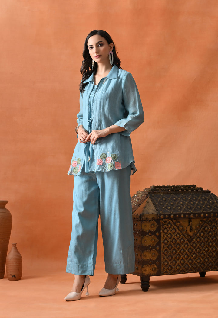 Step into elegance with this beautiful pastel blue co-ord set, made from soft and shiny chanderi silk. The outfit features graceful thread and zari work that adds a royal touch to your look. It has a round neck with a stylish collar and comfortable 3/4 sleeves for an elegant fit. The matching palazzo pants complete the outfit with ease and charm. With full lining, this set feels smooth and comfortable all day. Whether it’s a festive event or a casual celebration, this co-ord set is your go-to choice to look fabulous!