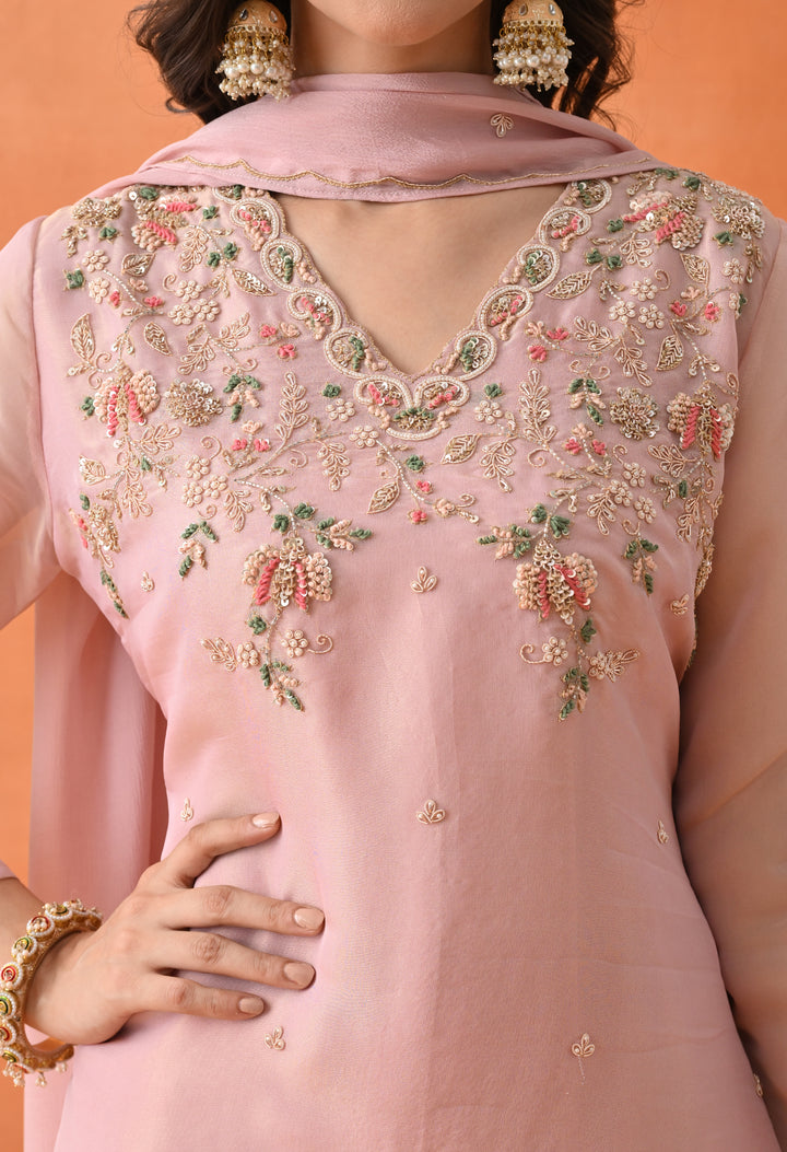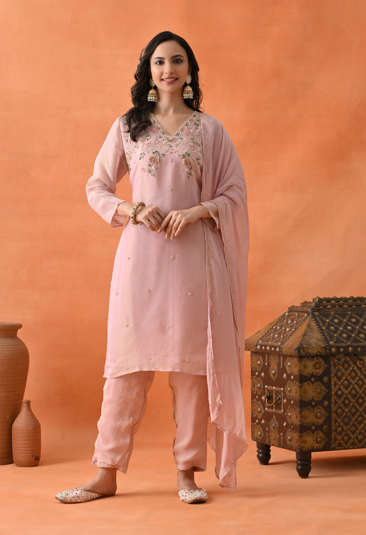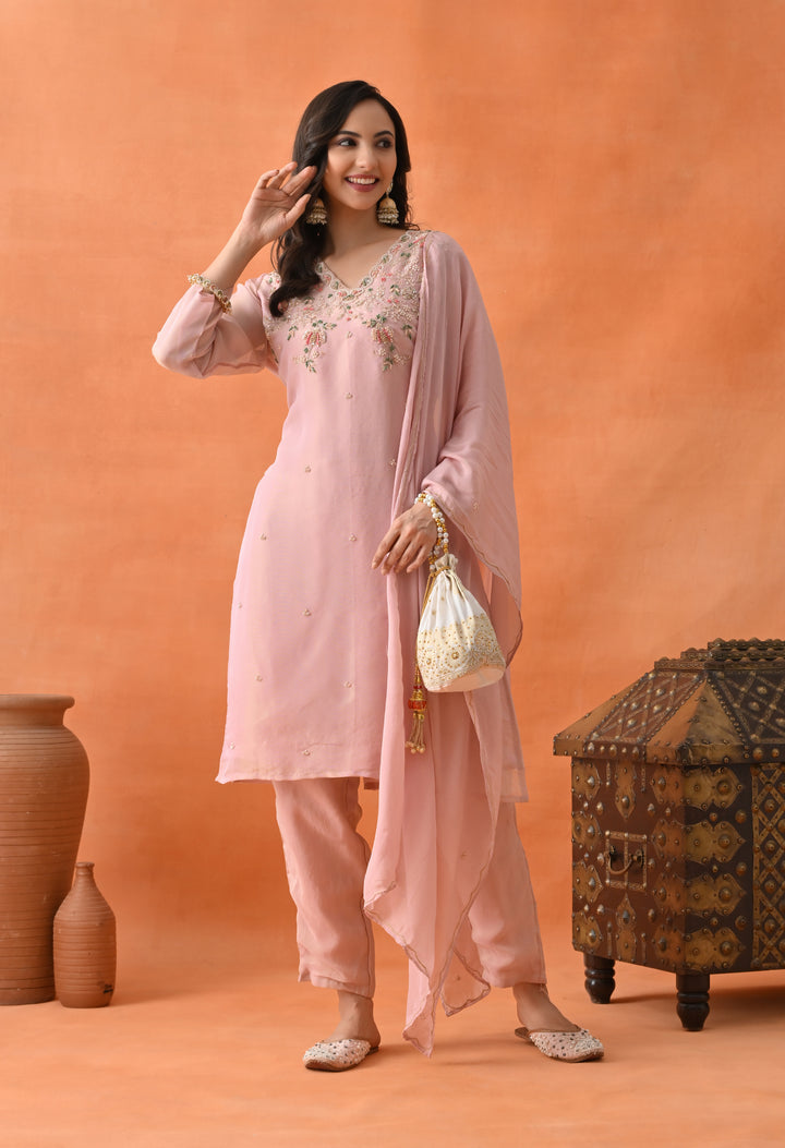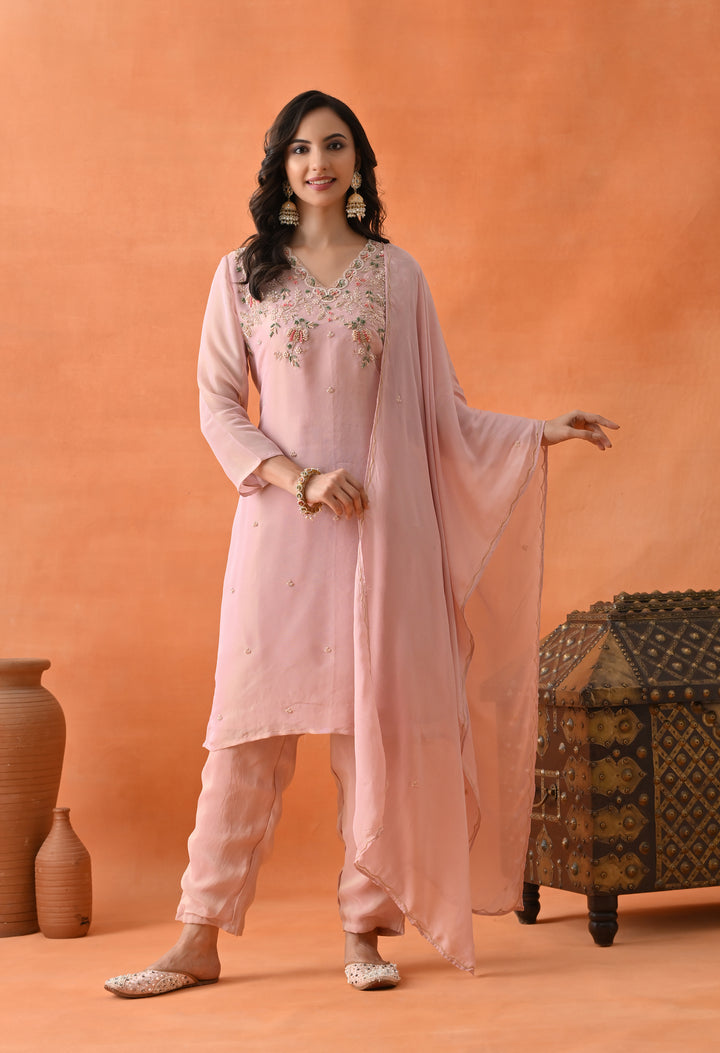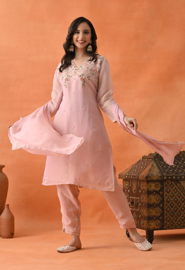 Get ready to dazzle in this stunning pastel pink party wear suit! Made with rich tissue fabric, it features beautiful dabka, sequins, cut dana, thread, and pearl work that sparkles with every move. The straight-fit style with a V-neck and 3/4 sleeves offers a classy and comfortable fit. Paired with sleek pants and a soft chinon crepe dupatta with zari and dabka detailing, this outfit is perfect for weddings, parties, and special days. Its soft pastel shade adds a royal charm. You’ll look gorgeous—and everyone will notice!