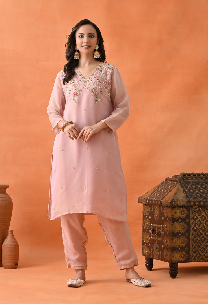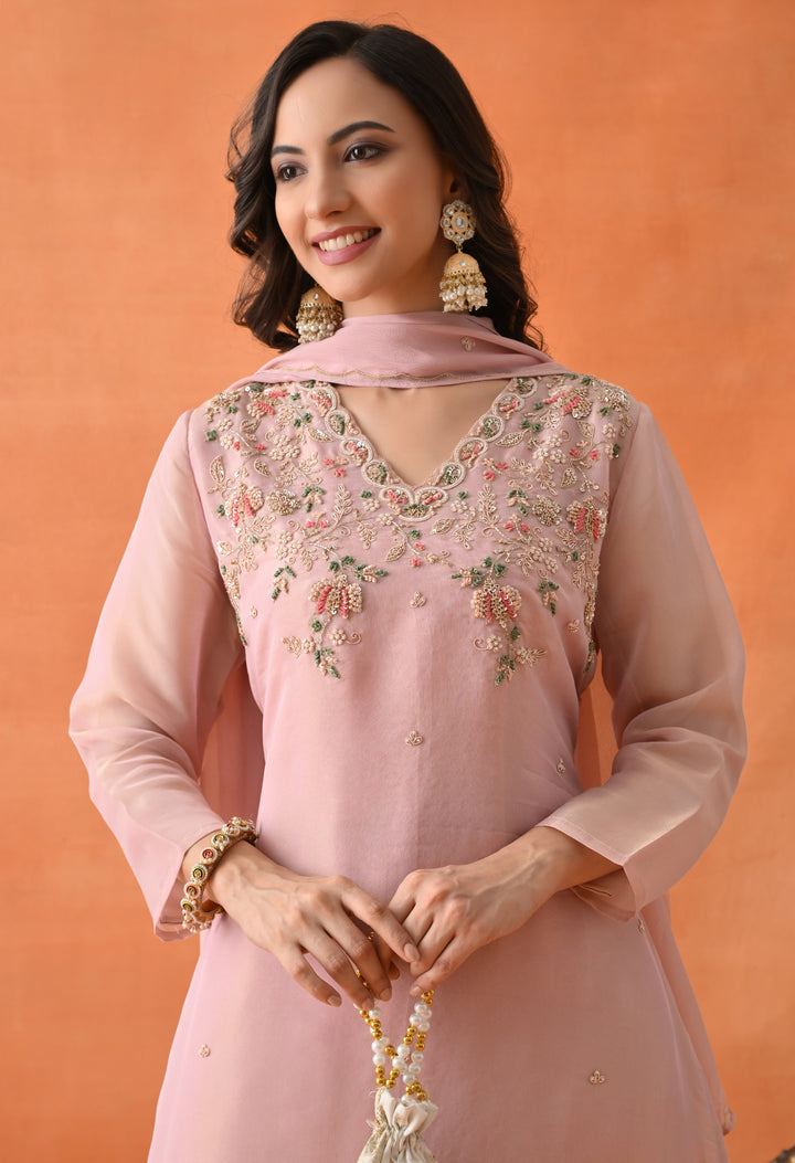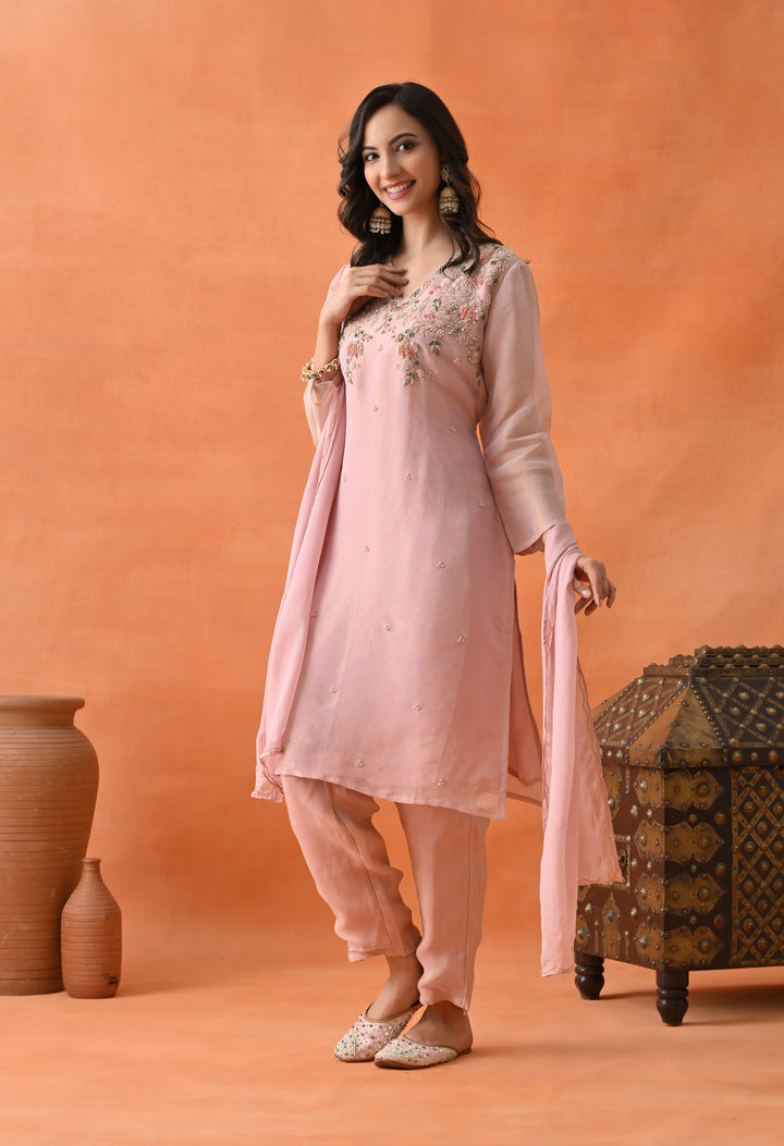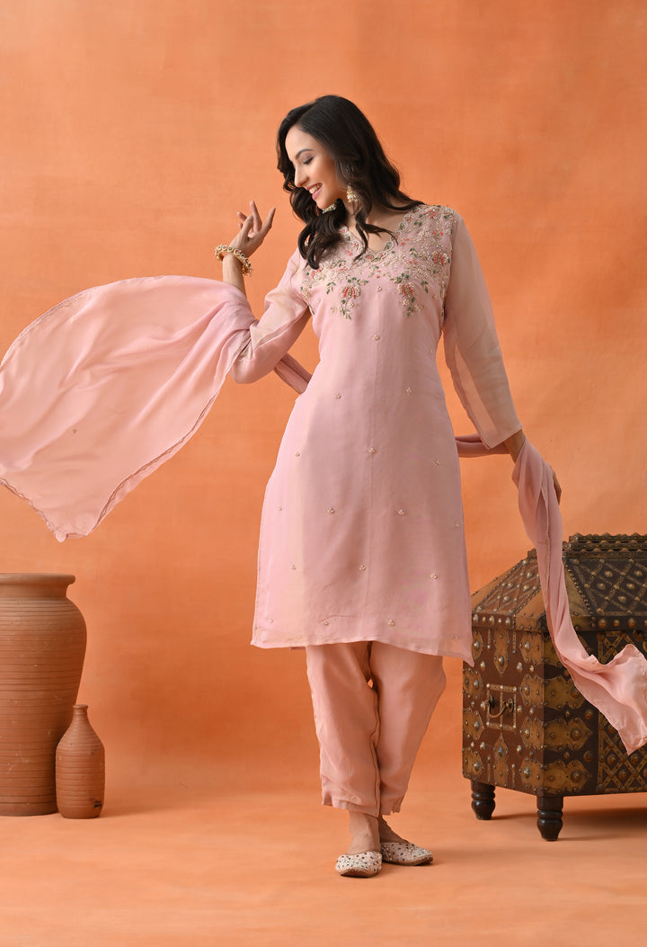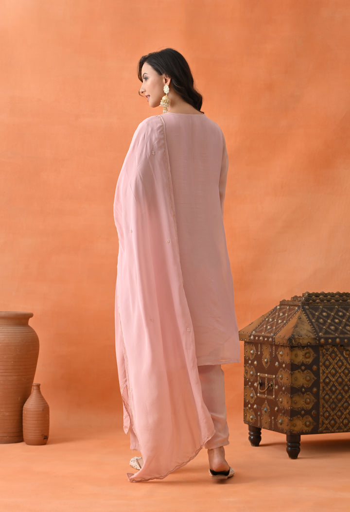 Get ready to dazzle in this stunning pastel pink party wear suit! Made with rich tissue fabric, it features beautiful dabka, sequins, cut dana, thread, and pearl work that sparkles with every move. The straight-fit style with a V-neck and 3/4 sleeves offers a classy and comfortable fit. Paired with sleek pants and a soft chinon crepe dupatta with zari and dabka detailing, this outfit is perfect for weddings, parties, and special days. Its soft pastel shade adds a royal charm. You’ll look gorgeous—and everyone will notice!