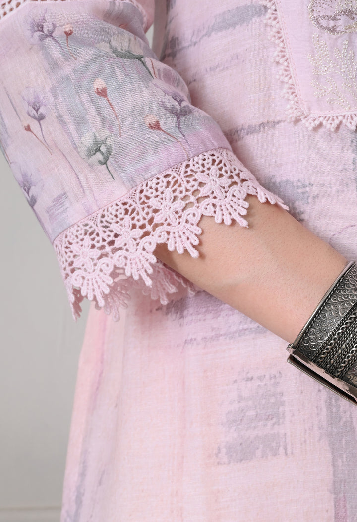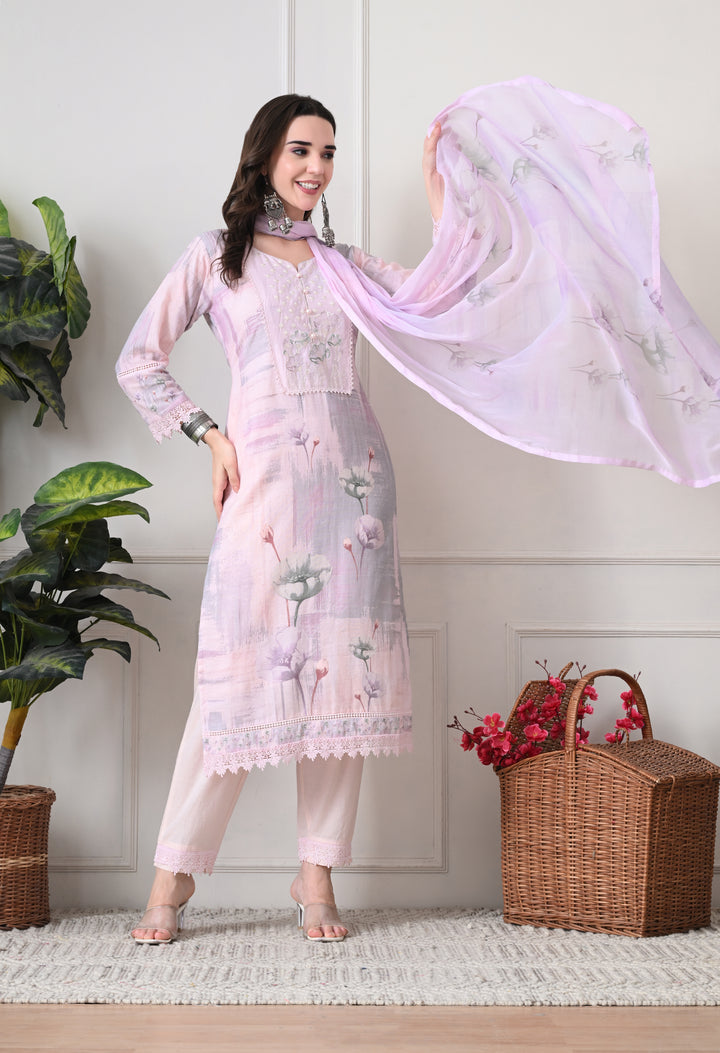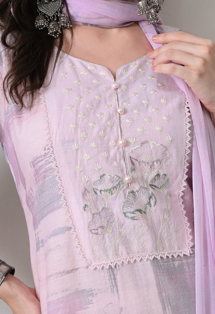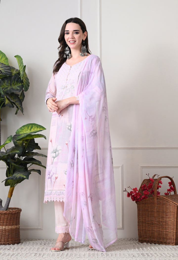 Step into elegance with this light pink straight cotton suit, adorned with delicate floral prints, intricate zari and thread work, pearls, and cutwork lace enhanced with schiffli embroidery. The set features 3/4th sleeves with a round V-neck, a matching pant with scalloped mohari, and a printed chiffon dupatta. Fully lined for comfort, this ensemble is perfect for casual outings or festive gatherings.