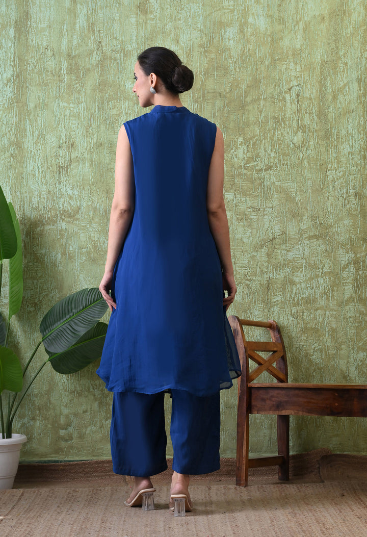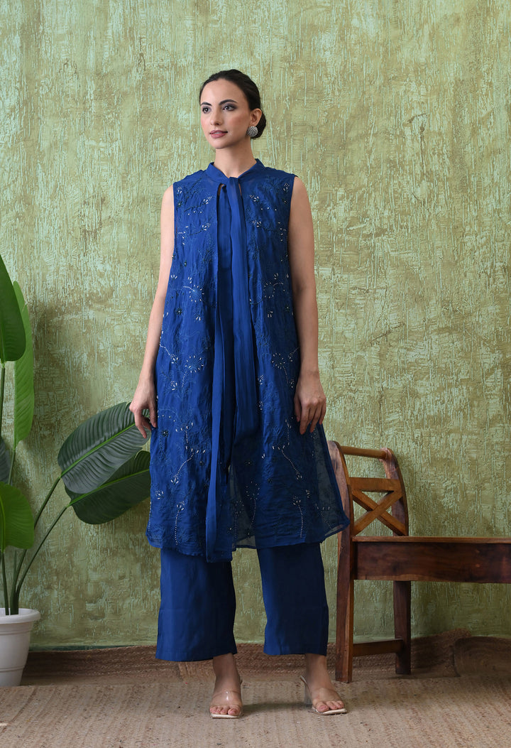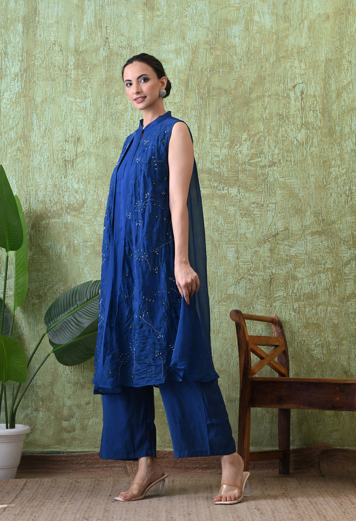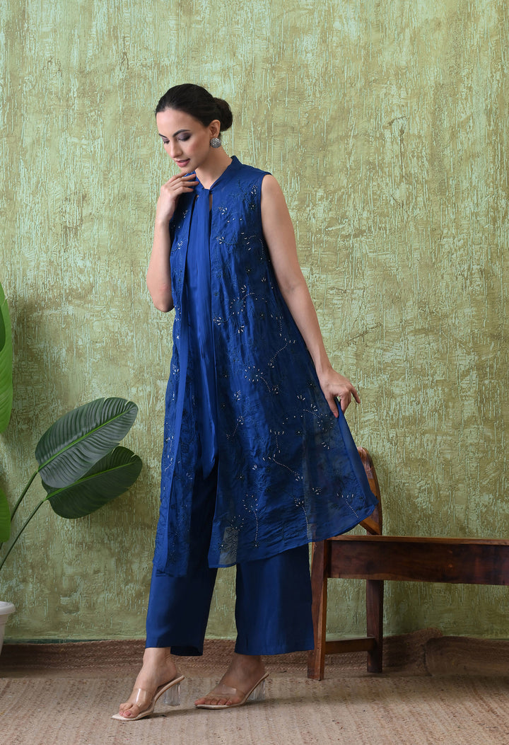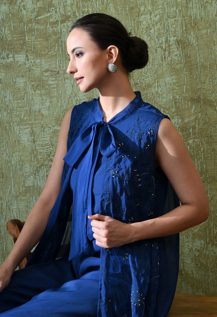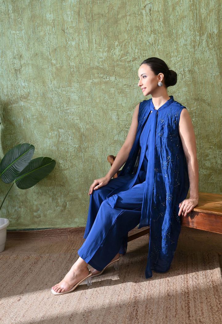 This Blue Pearl Shine Shrug Jumpsuit is the perfect mix of comfort and style. Made from soft cotton with lining, it feels light and easy to wear all day. The attached organza crepe shrug adds a touch of elegance, while the pearl and sequin work with fine thread embroidery makes it shine beautifully. The V-neck and cut sleeves give a modern look, and the front knot detail adds charm. Its soft blue color makes it perfect for parties, festive occasions, or even a stylish casual day out. This outfit will surely make you stand out everywhere you go.