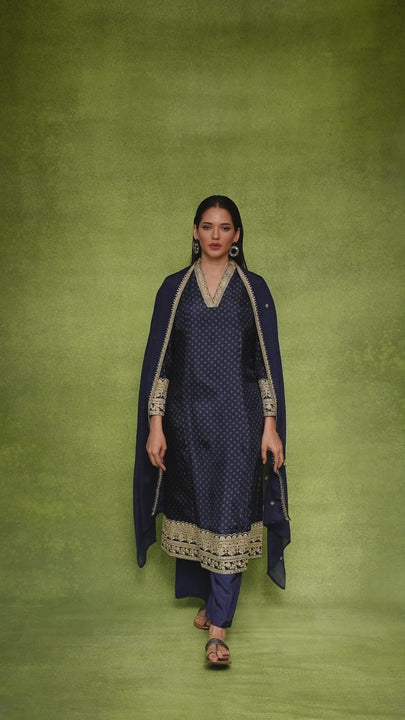 Step into elegance with this beautifully crafted A-line party wear suit set in a rich royal blue shade. Designed in luxurious silk fabric, this outfit blends traditional charm with graceful modern styling, making it perfect for festive gatherings, family functions, and special occasions.