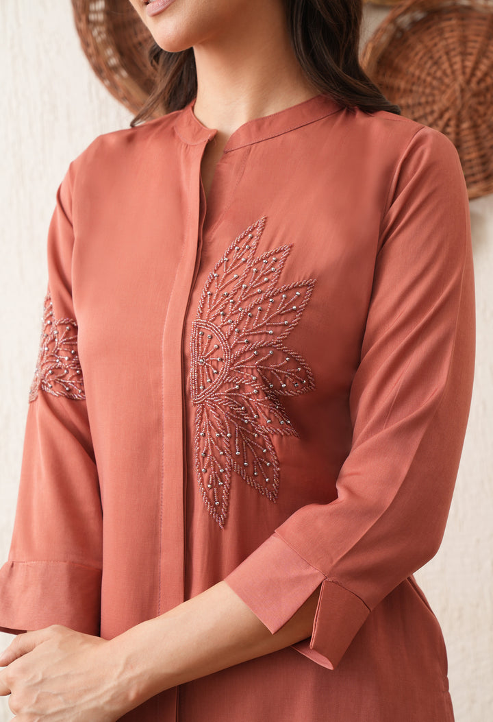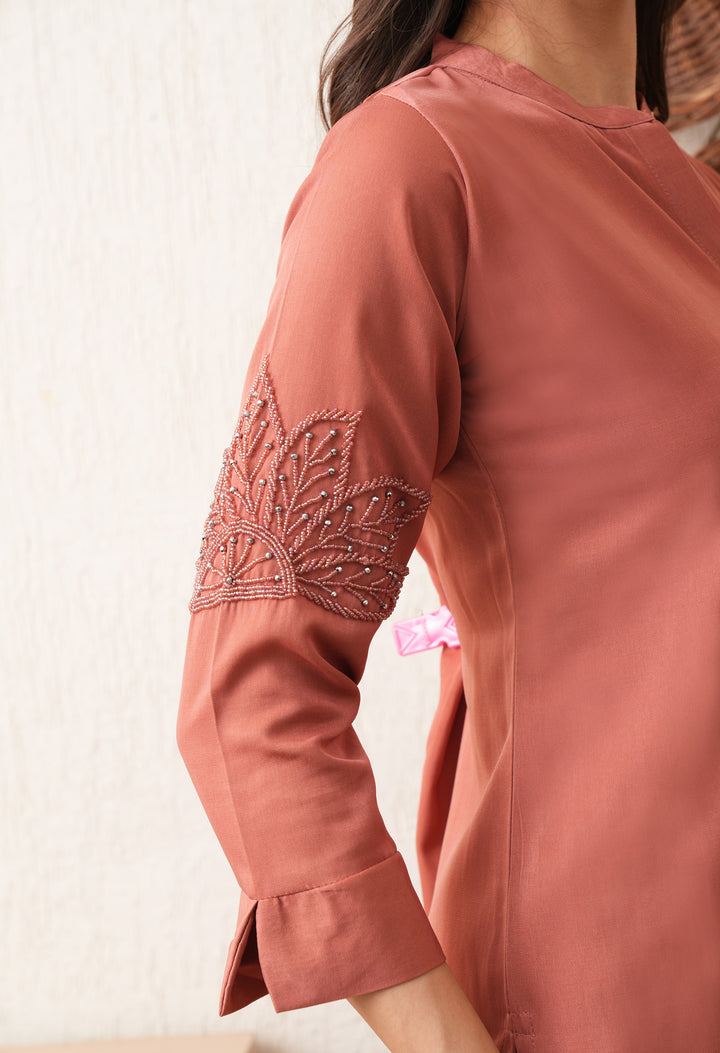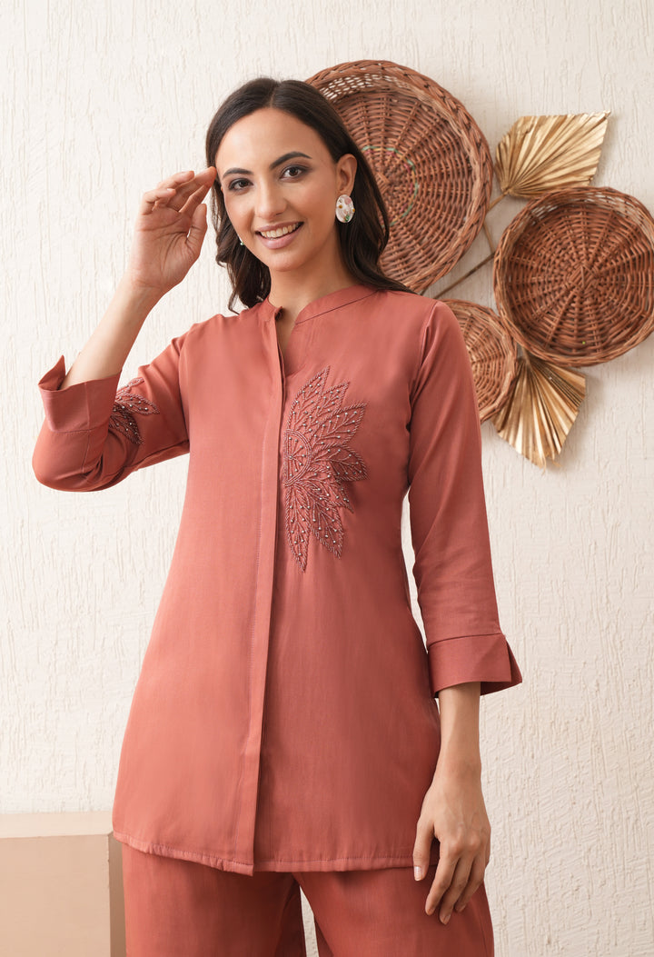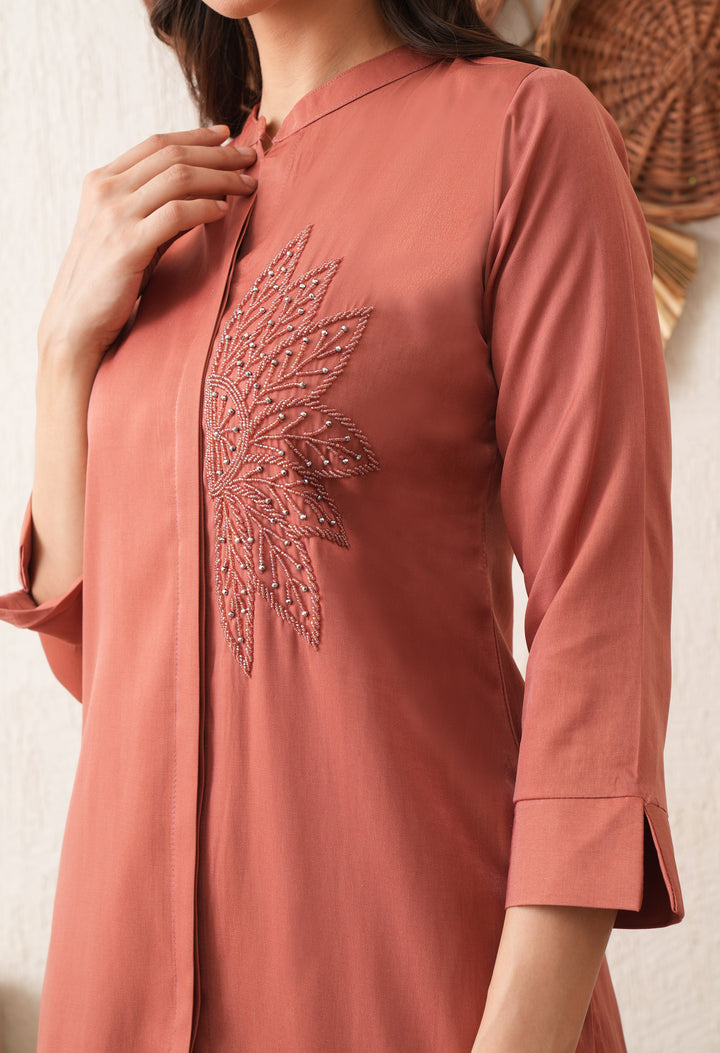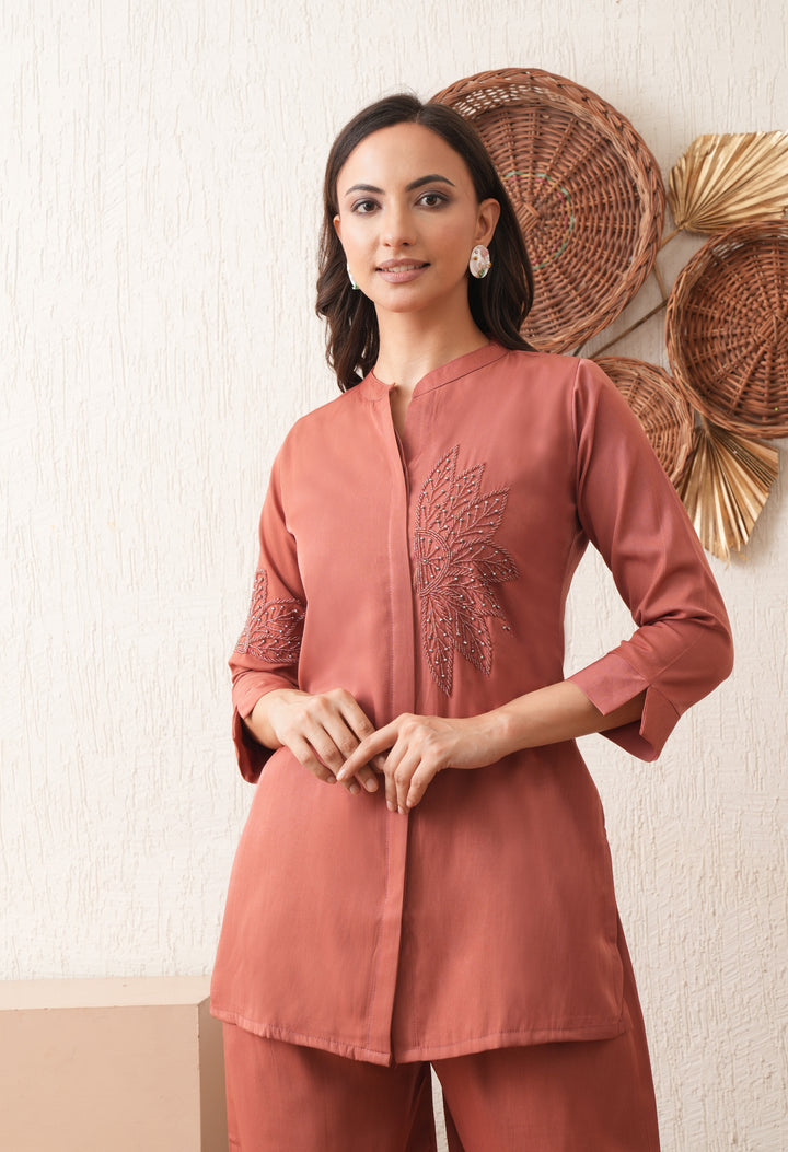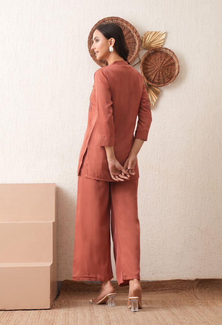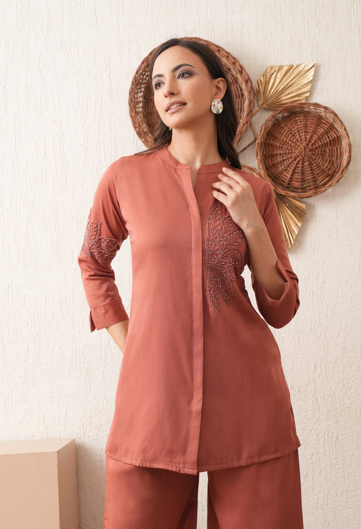 Elevate your elegance with this Pearl Mist Light Brown Co-ord Set, crafted from soft cotton crepe fabric for a breezy, comfortable fit. The outfit features pearl and siroski embellishments for a subtle shimmer, a Chinese collar neckline, and full sleeves for a classy finish. Paired with palazzo pants featuring a convenient side pocket, this co-ord set blends charm and practicality effortlessly - perfect for festive events, brunches, or evening gatherings.