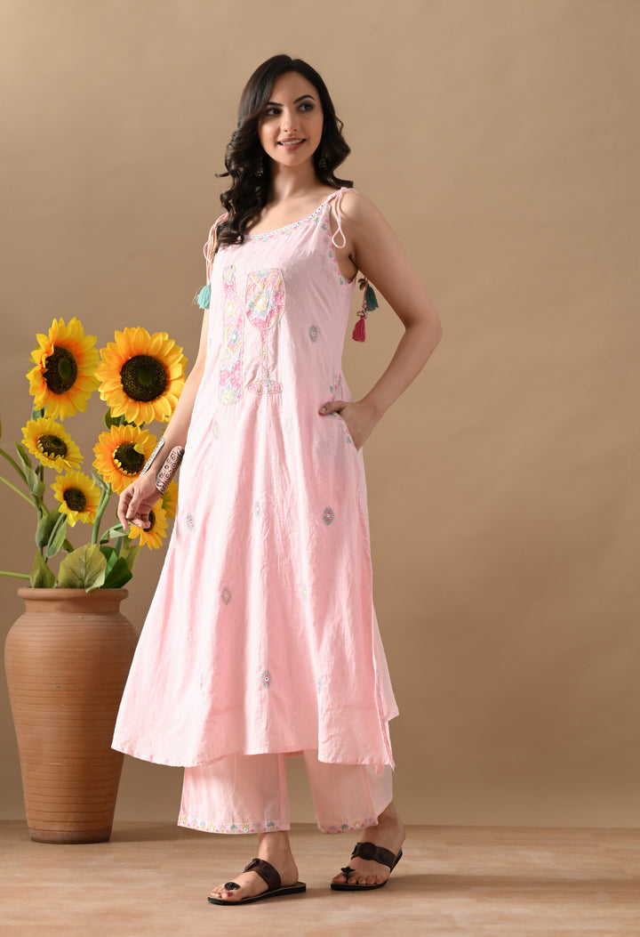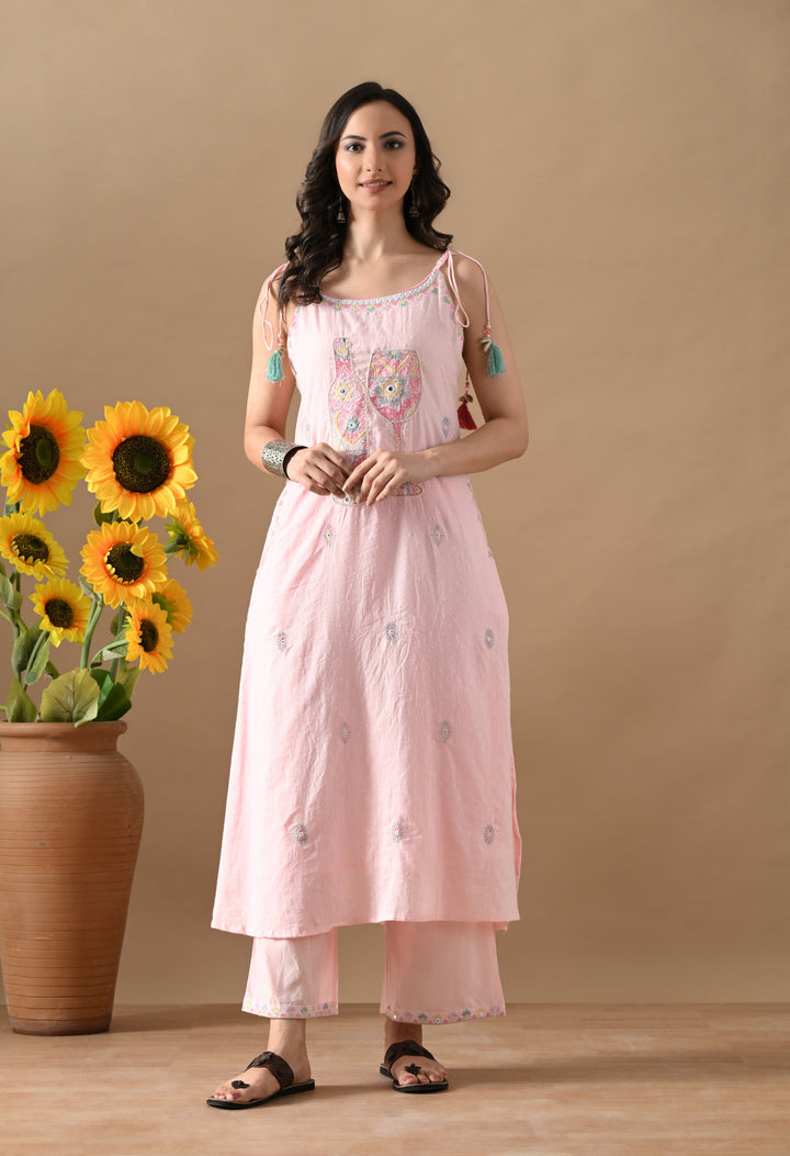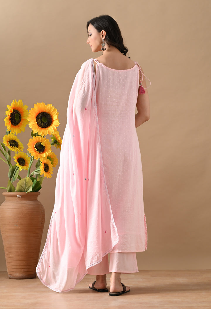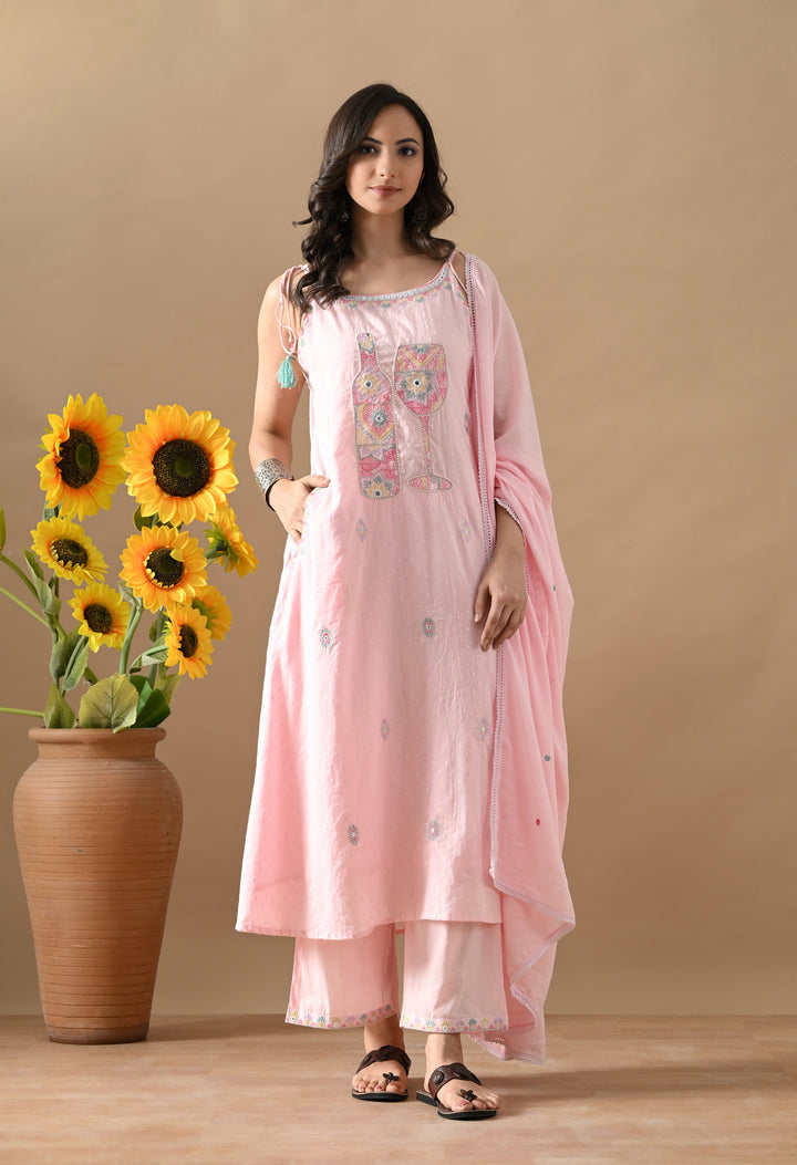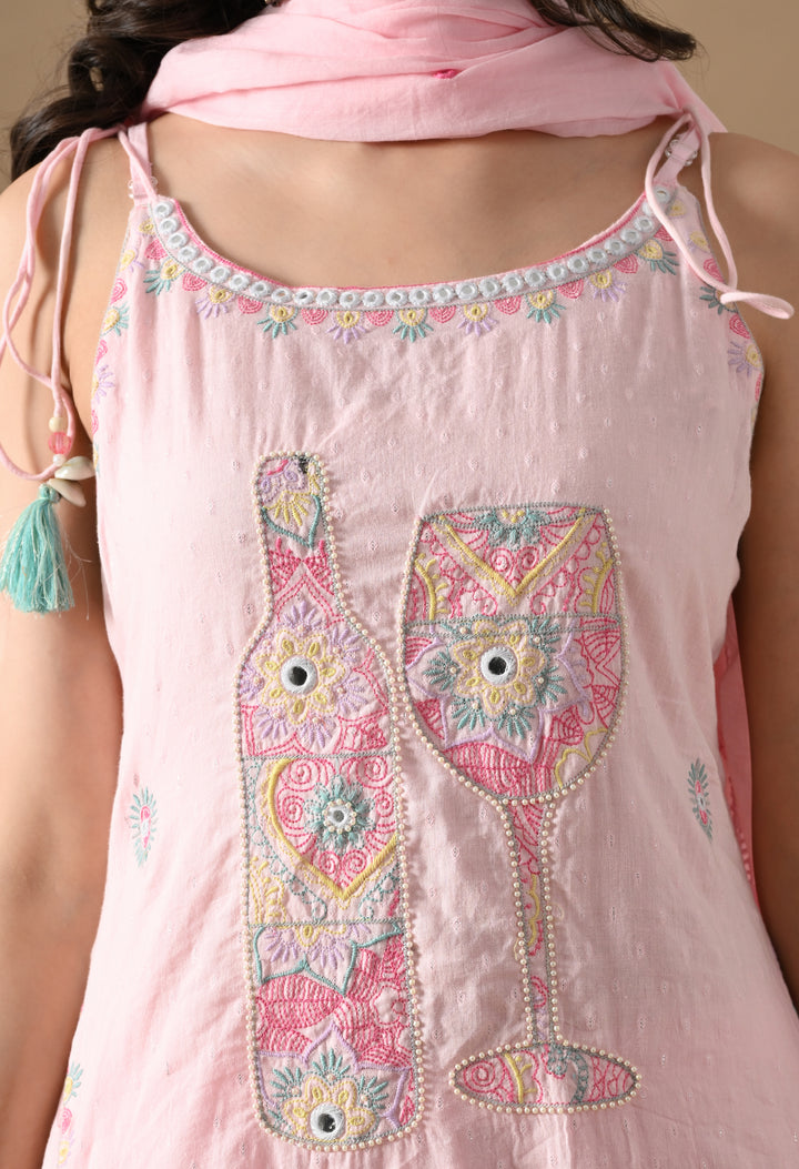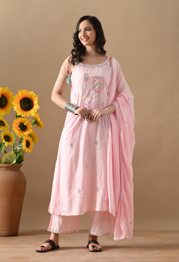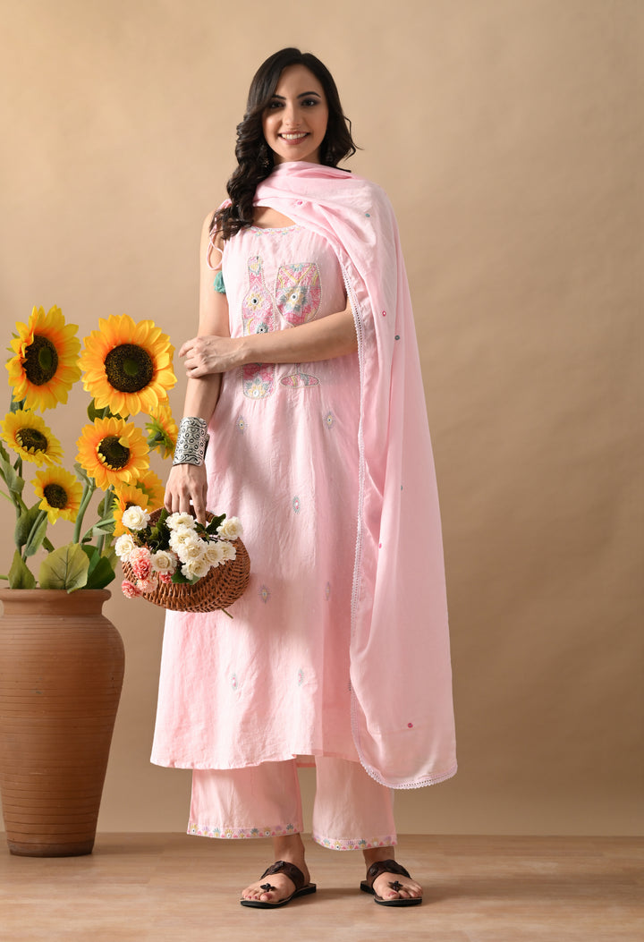 Turn heads with this charming Pink Mirror Threadwork Cotton Suit — a perfect blend of cuteness and class! The spaghetti-style kurta with boat neck and mirror-highlighted thread work brings a fun twist to your ethnic look. It also has two side pockets for extra comfort. The cotton dupatta is beautifully detailed with butti design and 4-side lace, making it stylish and elegant. Paired with straight pants, this outfit is ideal for festive gatherings, casual days, or small functions. Light, comfy, and oh-so-pretty — this suit is a must-add to your wardrobe!
