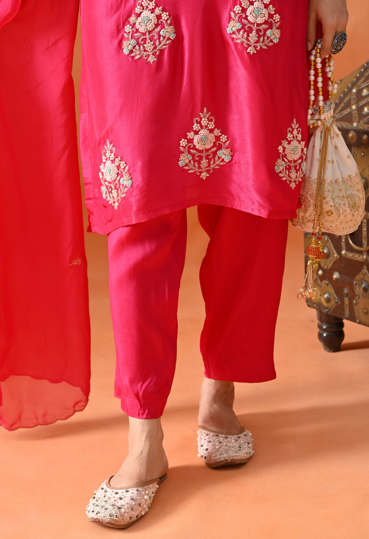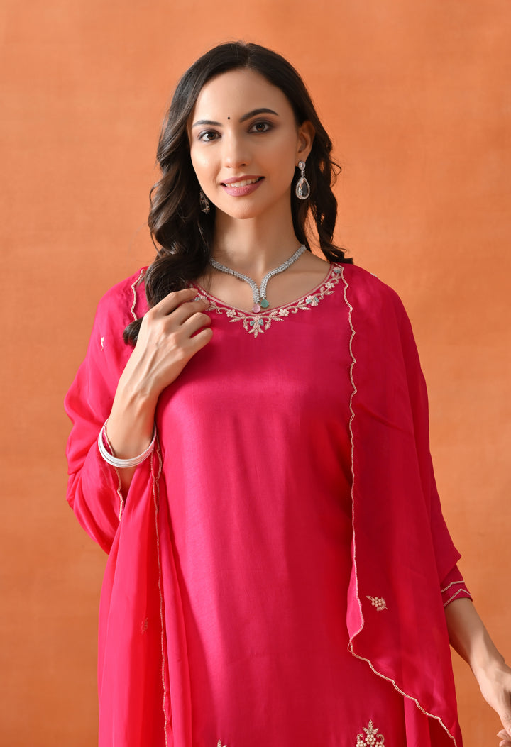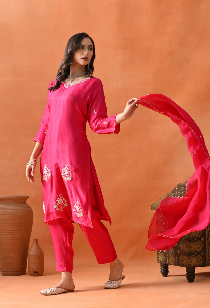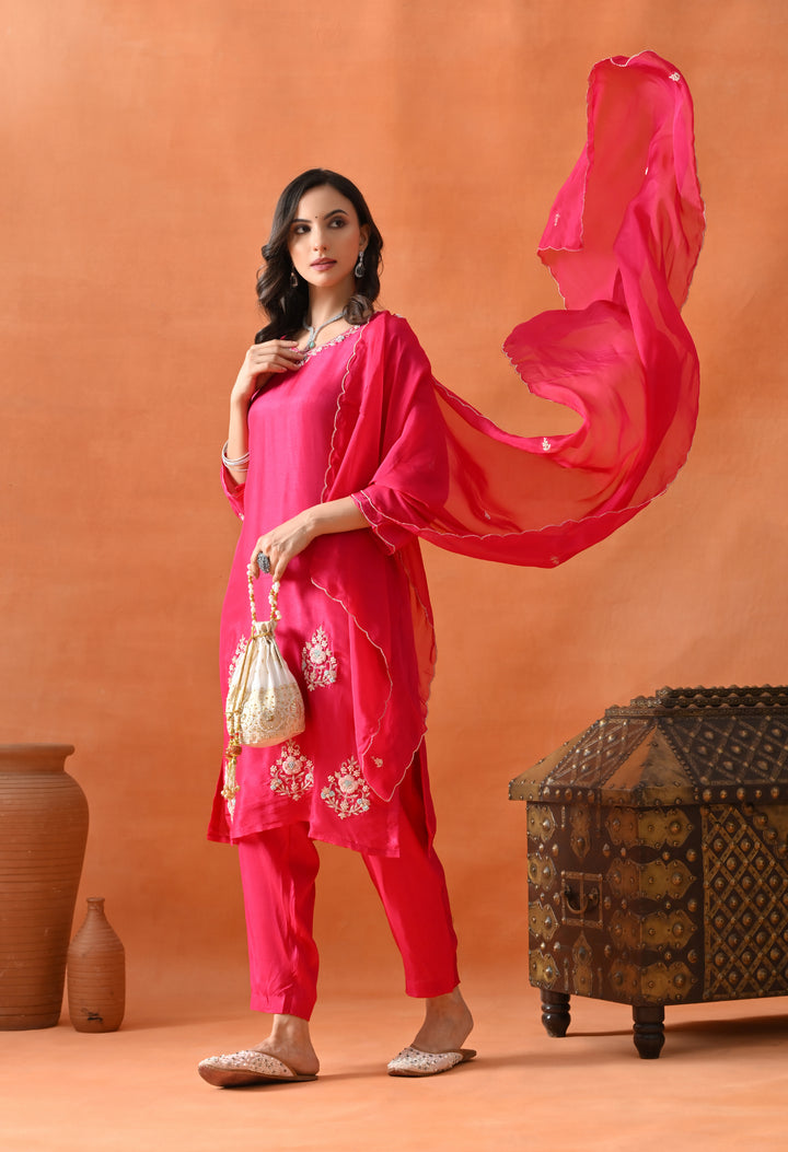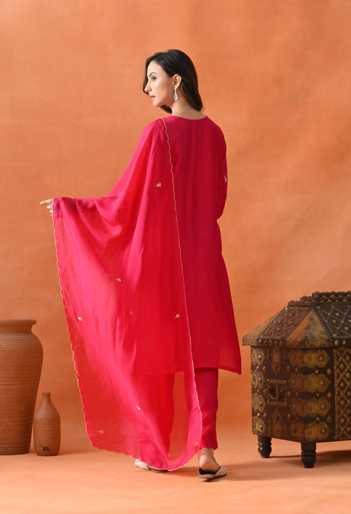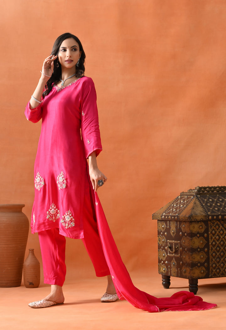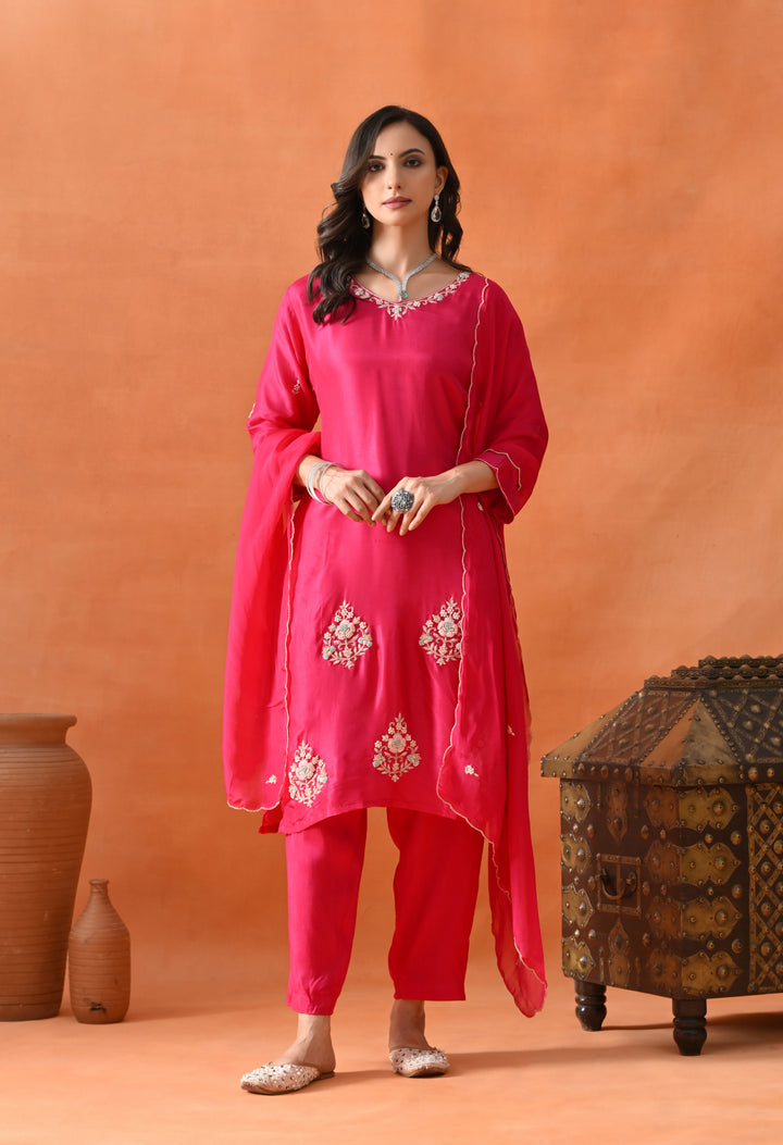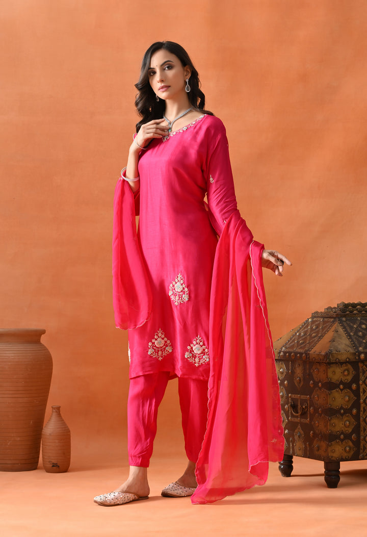 Step into elegance with this gorgeous pink party wear suit. Made from rich silk fabric, it features beautiful dabka, zari, thread, pearl, and cut dana work that sparkles with every move. The stylish V-neck and half sleeves give it a chic modern look, while the matching pants add extra comfort. The soft organza dupatta has delicate four-side scalloping and Buti work that completes the graceful outfit. Perfect for weddings, functions, or celebrations, this outfit will turn heads wherever you go. Everyone will love your stylish and classy look!