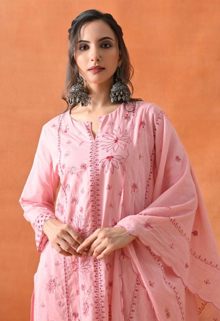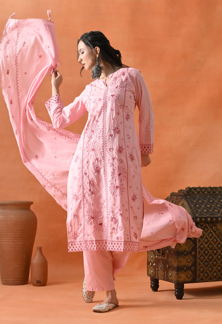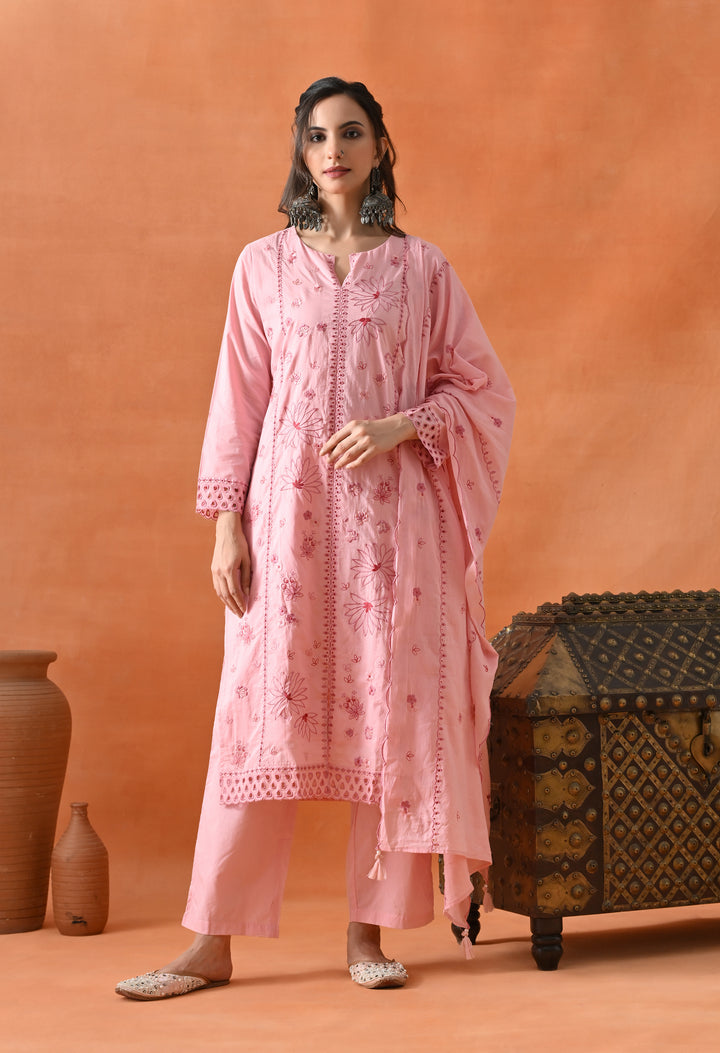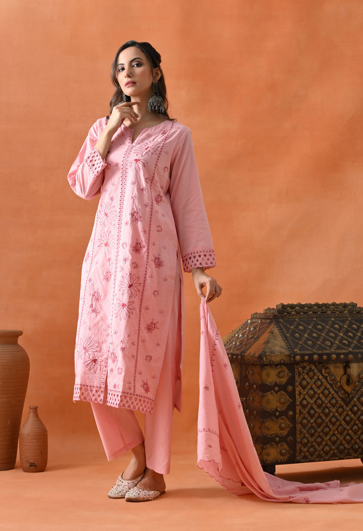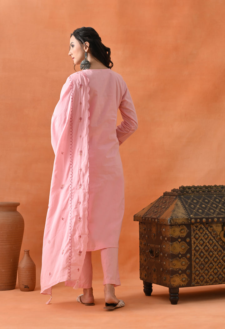 Step out in style with this beautiful Pakistani straight suit in soft pink cotton. The suit is decorated with simple thread work that gives it an elegant and classy look. It comes with a matching palazzo that has a useful one-side pocket for comfort and ease. The full sleeves and round neck with a V-cut make the outfit look graceful. The cotton dupatta features lovely thread work, Buti design, four-side tassels, and neat scalping that complete the look. This suit is perfect for festive days or casual outingsāeveryone will ask where you got it from!