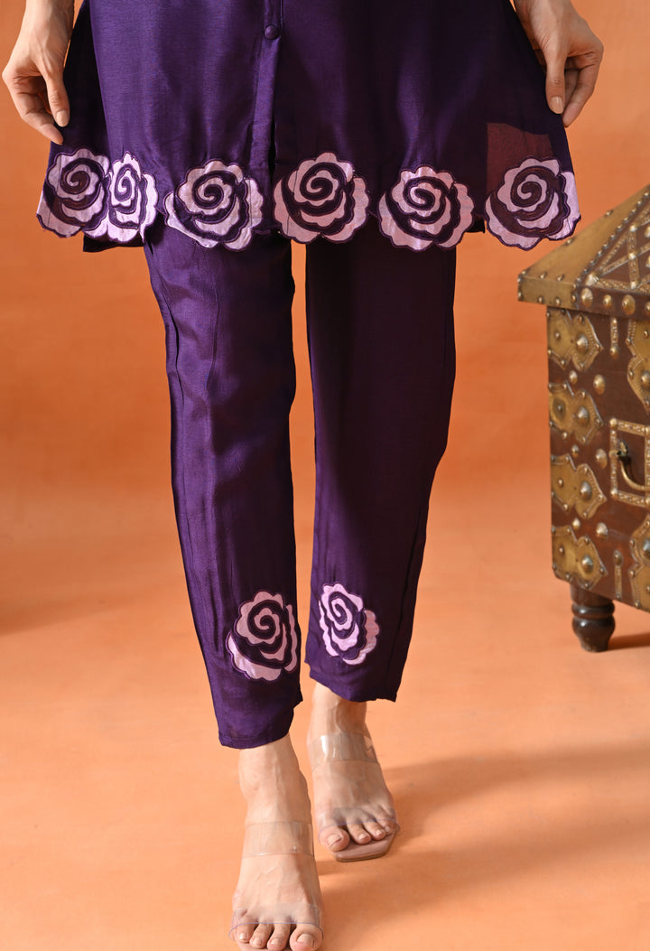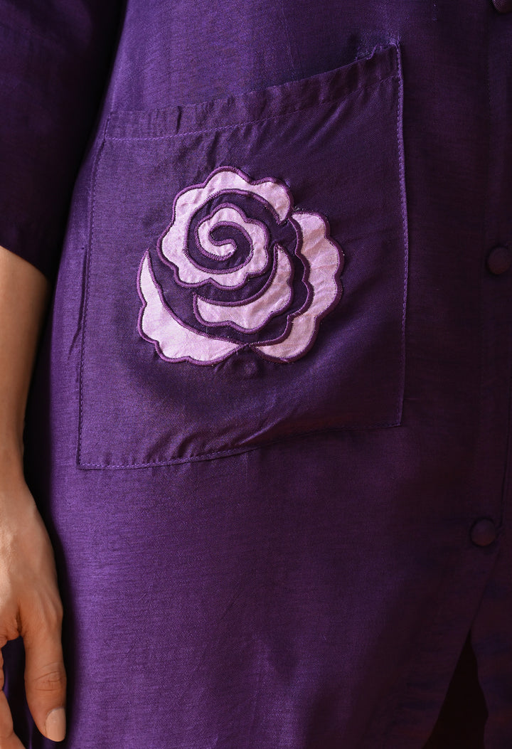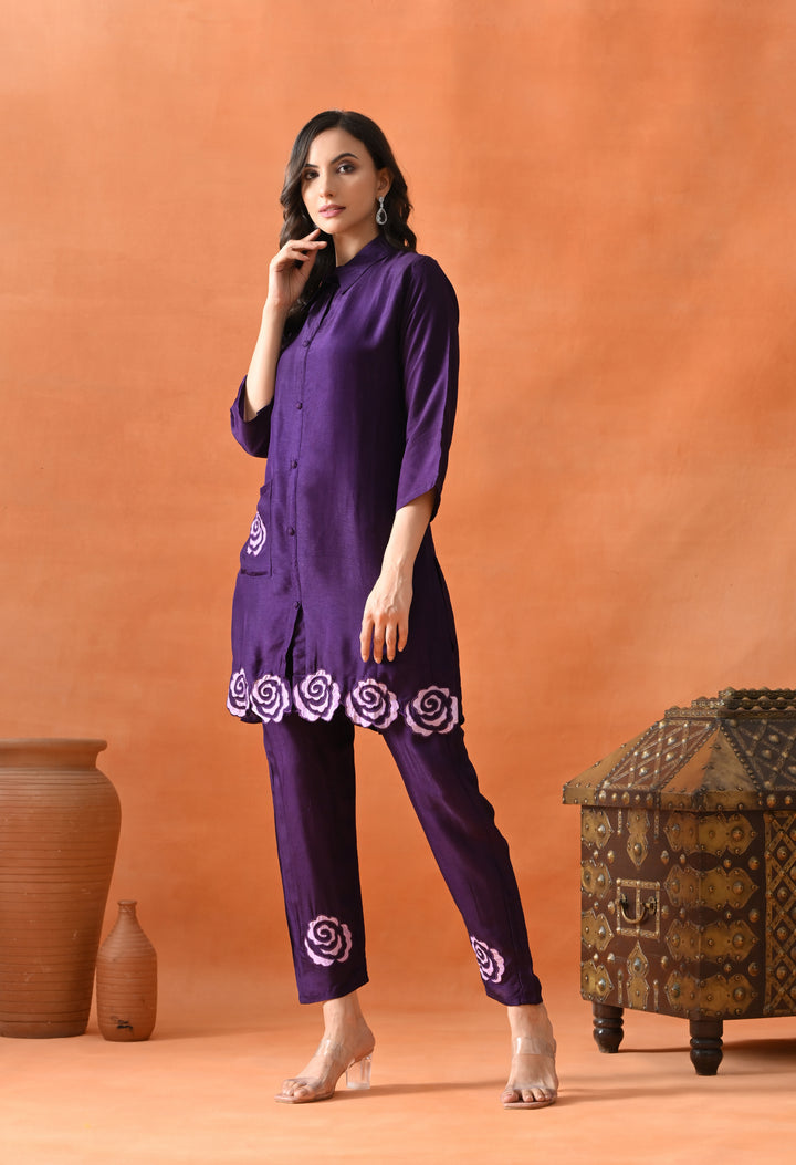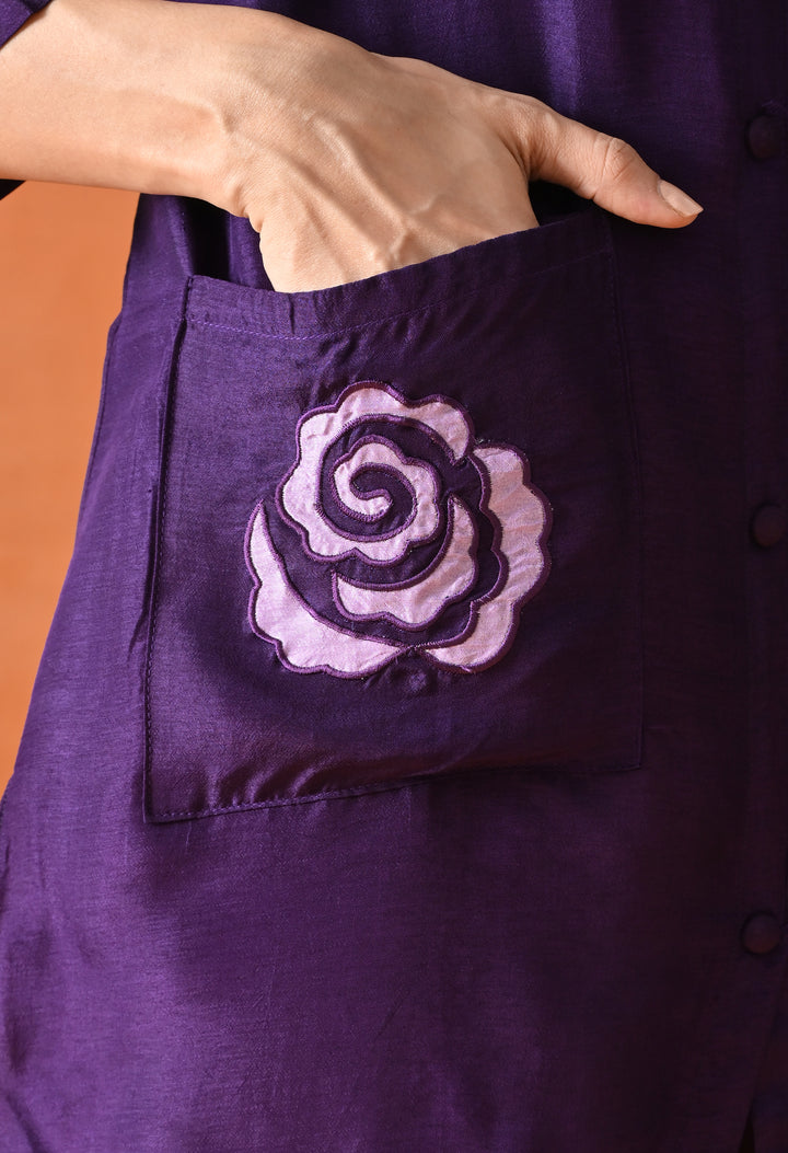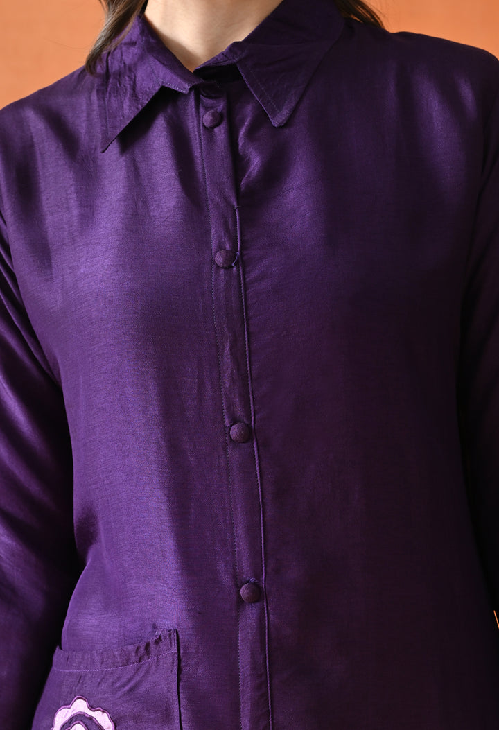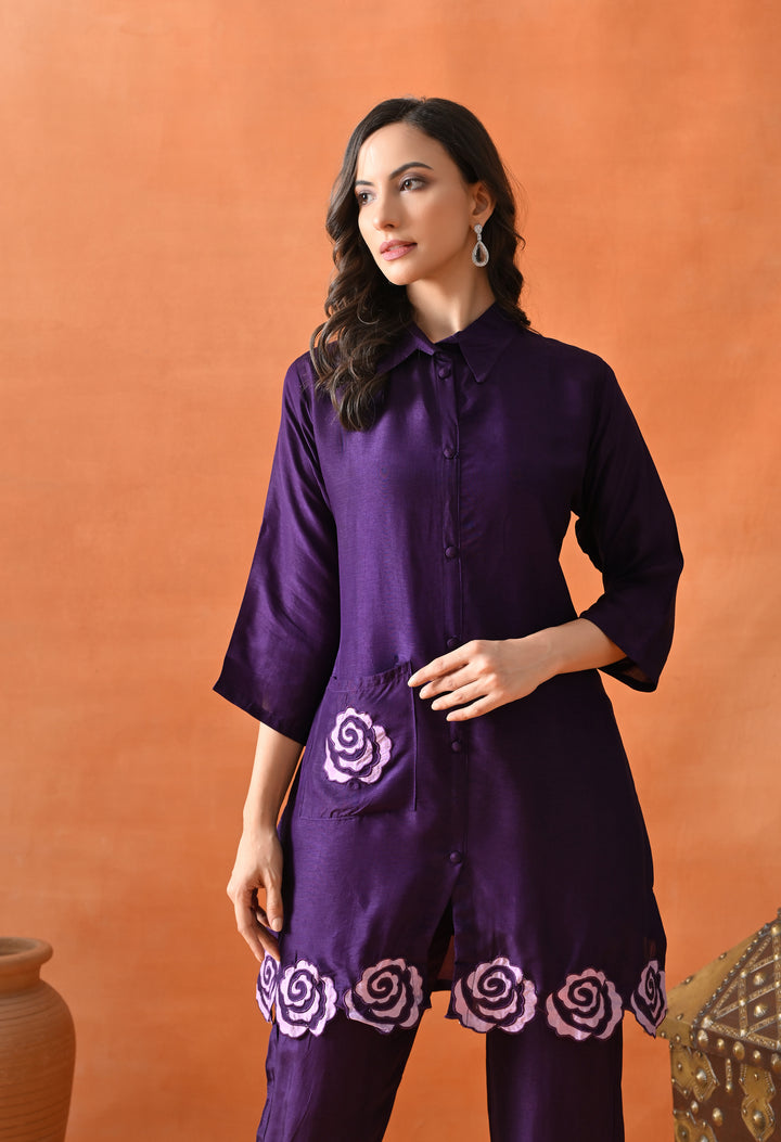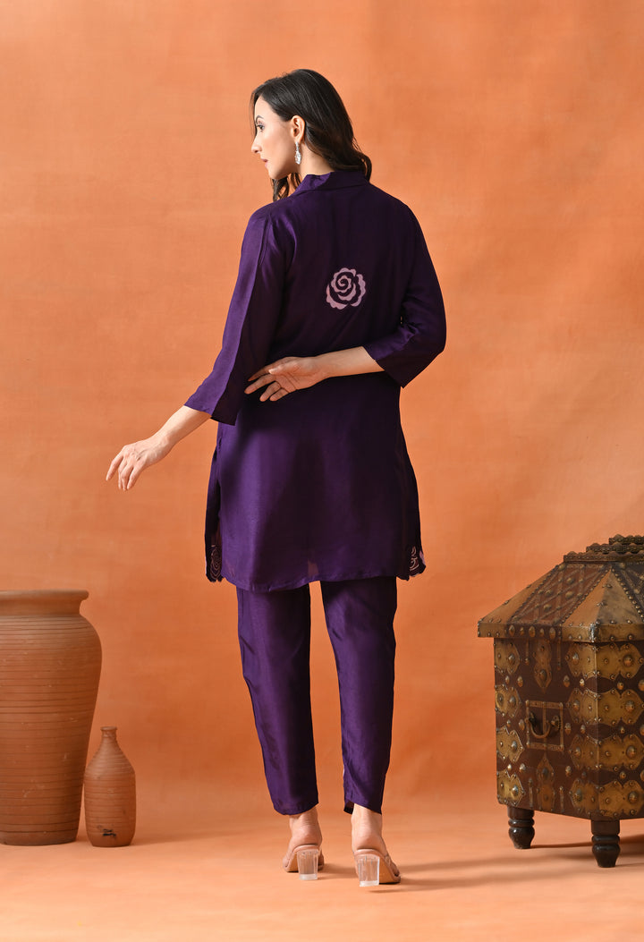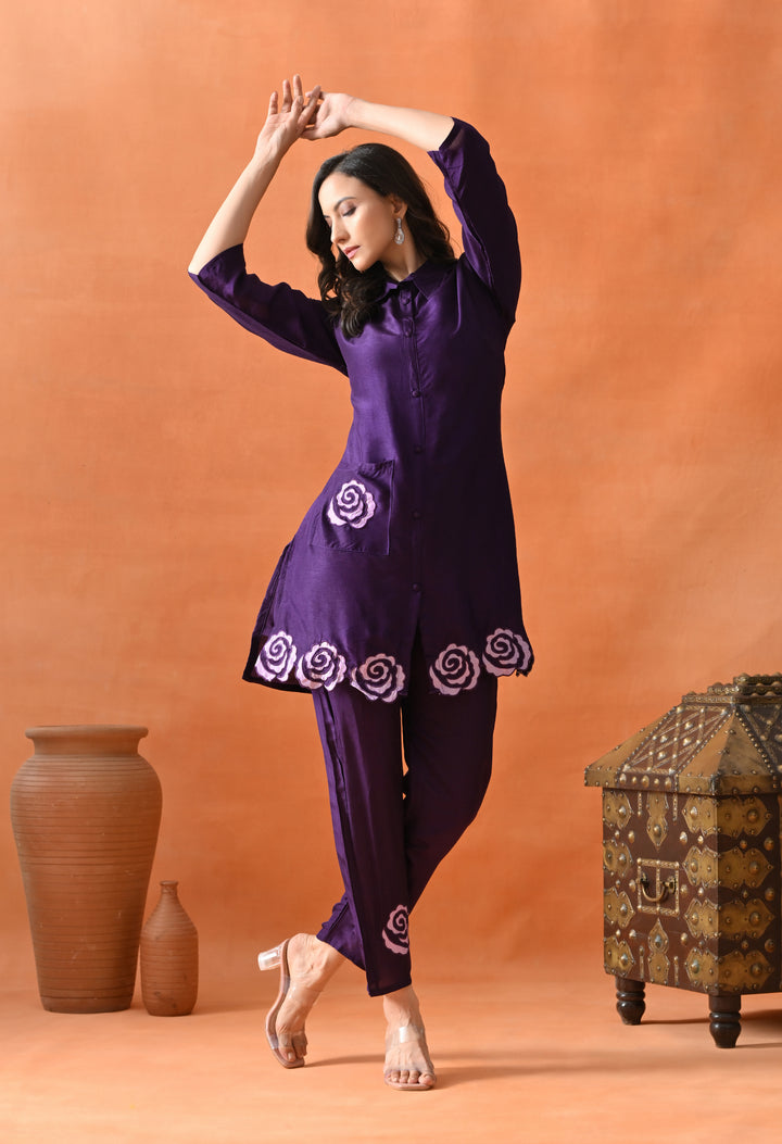 This dark purple co-ord set is all about comfort and style. Made from smooth silk fabric, the top has elegant thread work, a smart collar neck, and handy 3/4 sleeves. The beautiful scalping detail at the hem adds a trendy touch. It even comes with a pocket on the top—perfect for keeping little essentials. The matching pants are comfy and easy to wear, making this outfit great for any outing or celebration. Its rich color and chic look will make you stand out. Everyone will ask where you got it from!