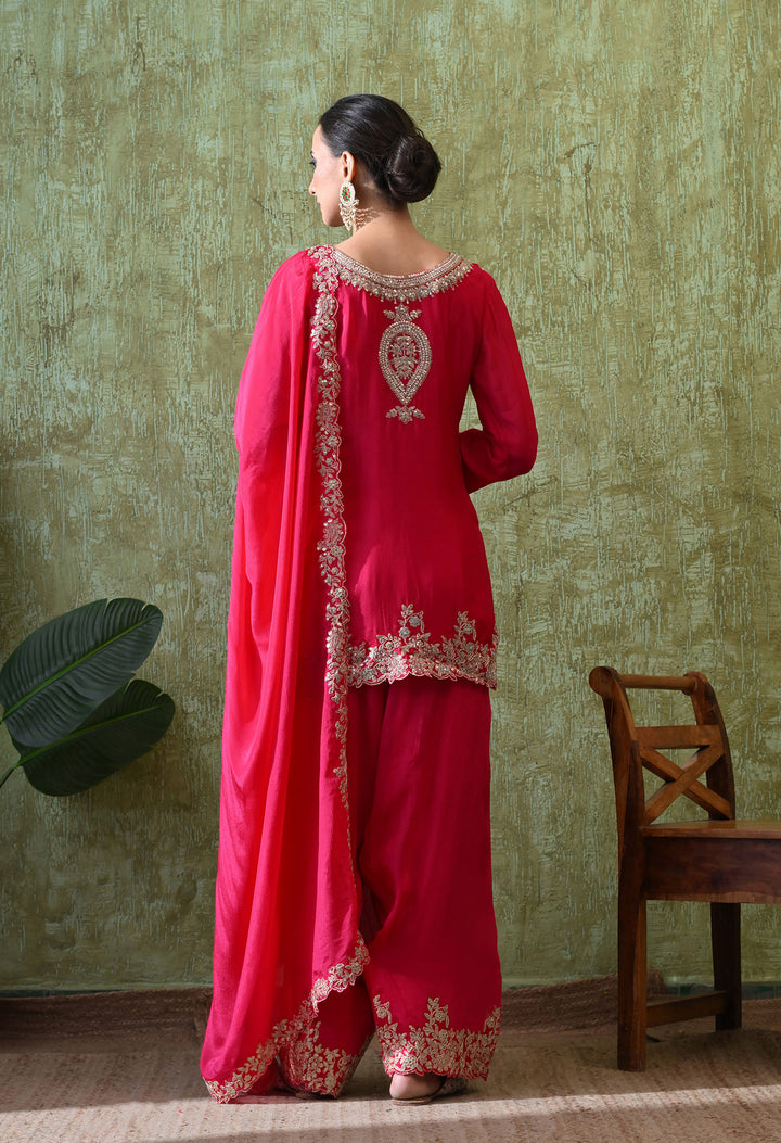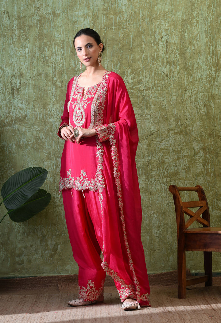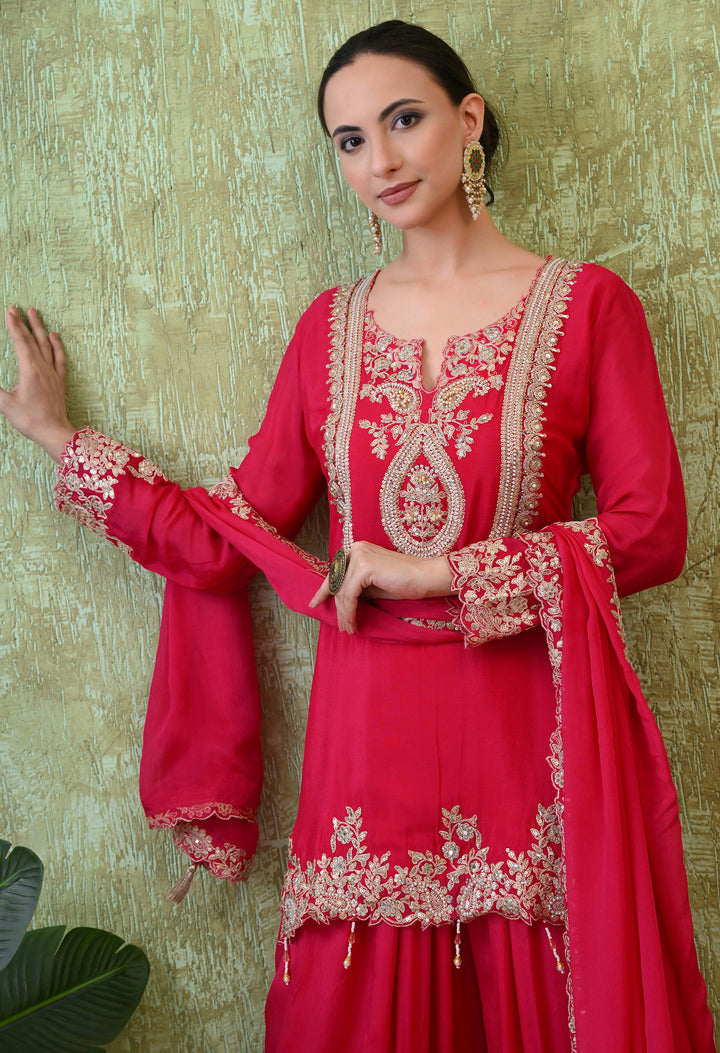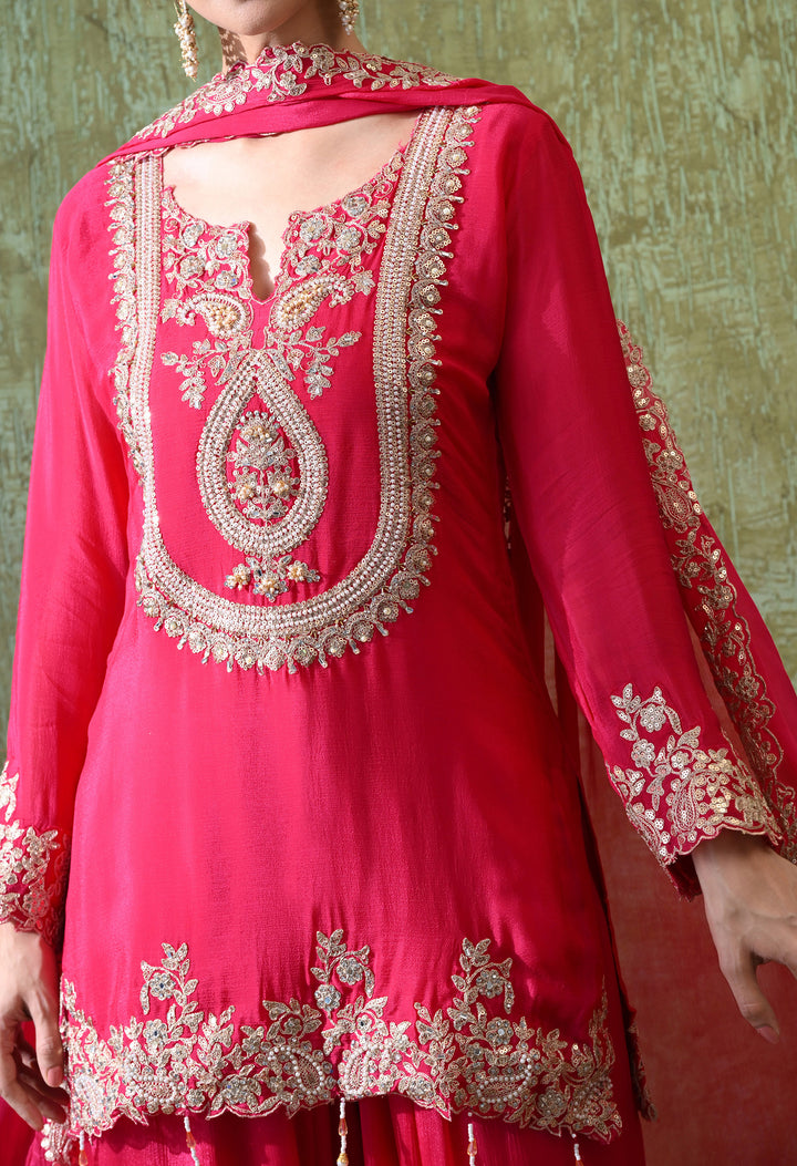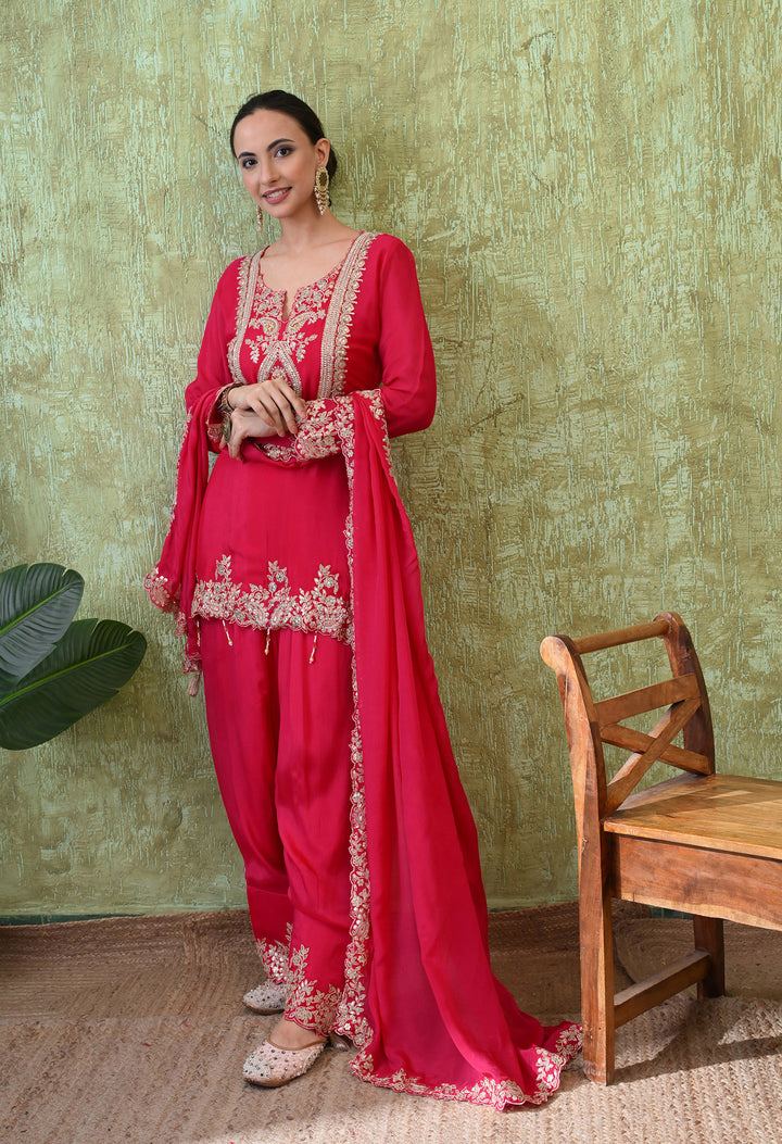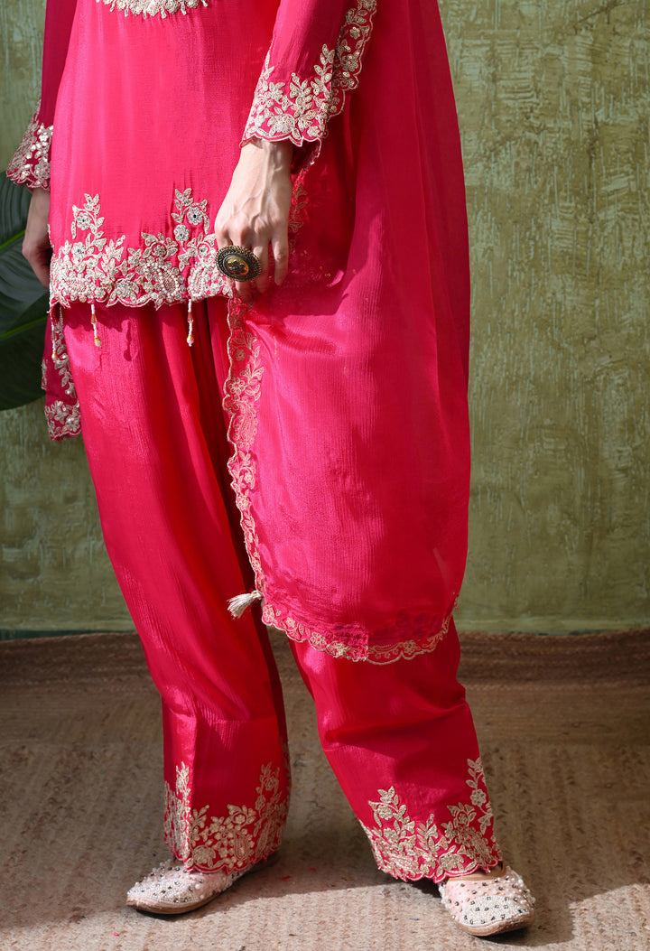 Shine bright at every party with this Radiant Magenta Sequin Party Suit. Designed in premium chinon crepe, this outfit features a short kurti with stunning sequins, pearls, cut dana, and zari work, giving it a rich festive look. The stylish parsi salwar comes with delicate zari and sequin work at the mori, adding charm to the entire outfit. With a flattering round neck and elegant V-cut, plus 3/4th sleeves, it offers both comfort and grace. The matching dupatta with four-side borders and tassels completes the look beautifully. Perfect for weddings, festive evenings, or special celebrations—this suit is made to impress.