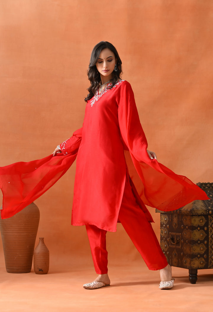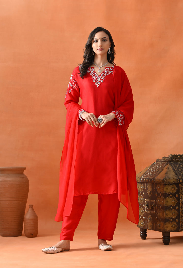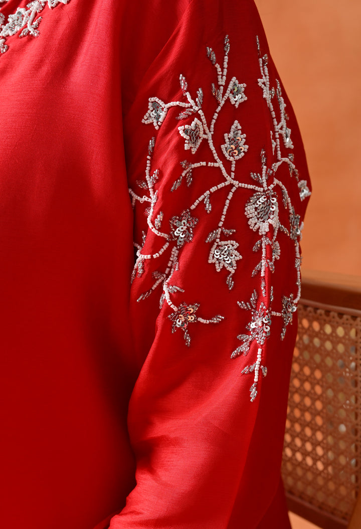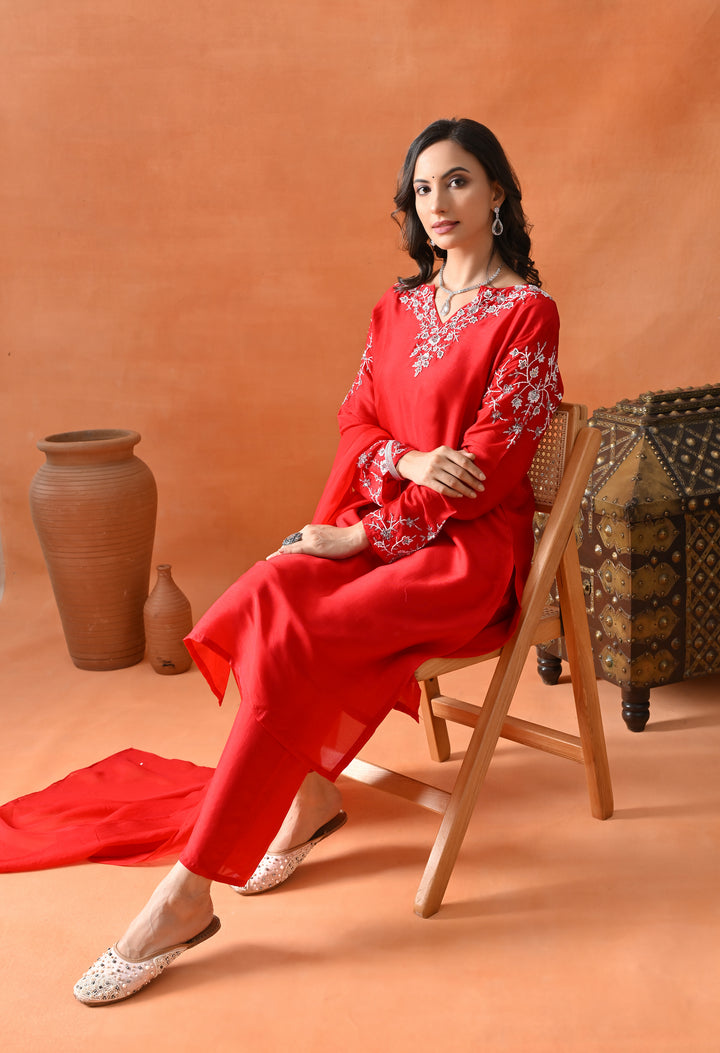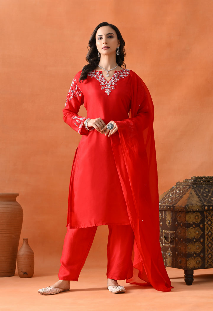 Turn heads with this stunning red Pakistani-style straight suit, made from rich silk fabric. The top features dazzling cut dana, sequins, and pearl work, adding a beautiful sparkle perfect for any celebration. With full sleeves, a stylish split neck, and a comfortable fit, this suit brings elegance and charm together. It comes with plain pants and a graceful organza dupatta that adds a festive finish to your look. Whether itās a wedding or party, this outfit will make you shine. Donāt waitāthis beauty is calling your name!