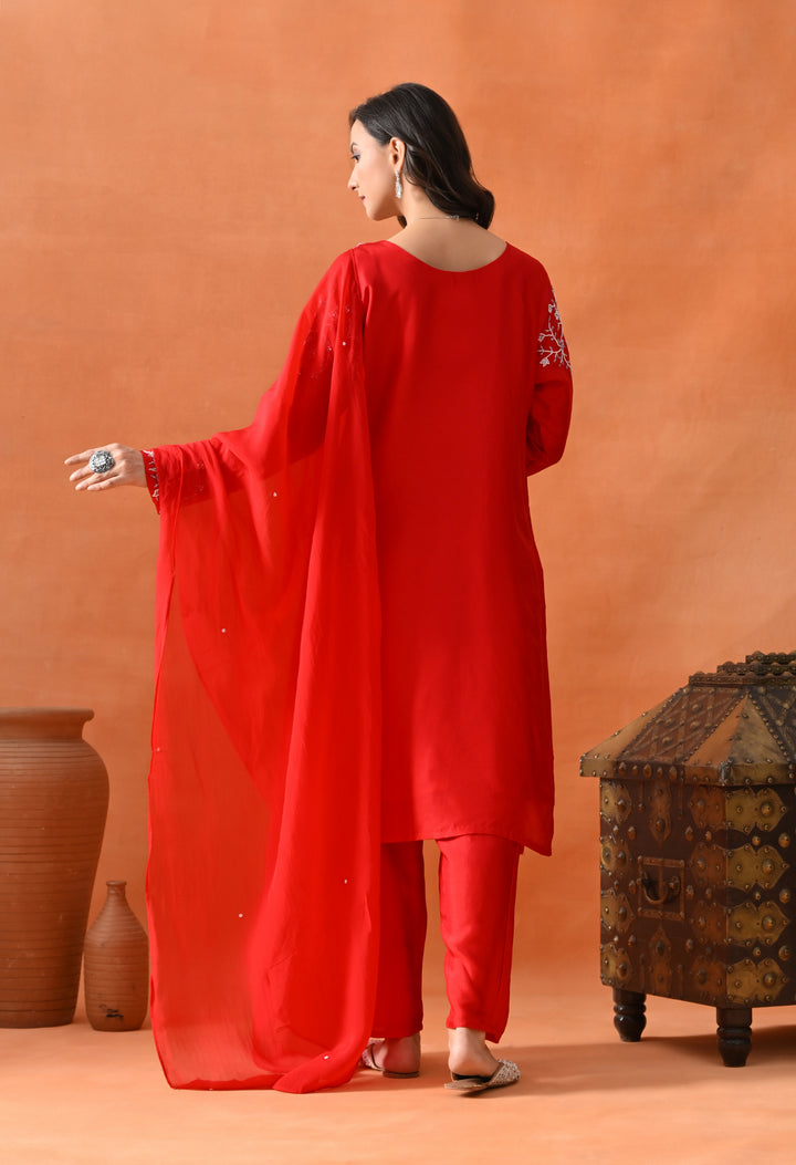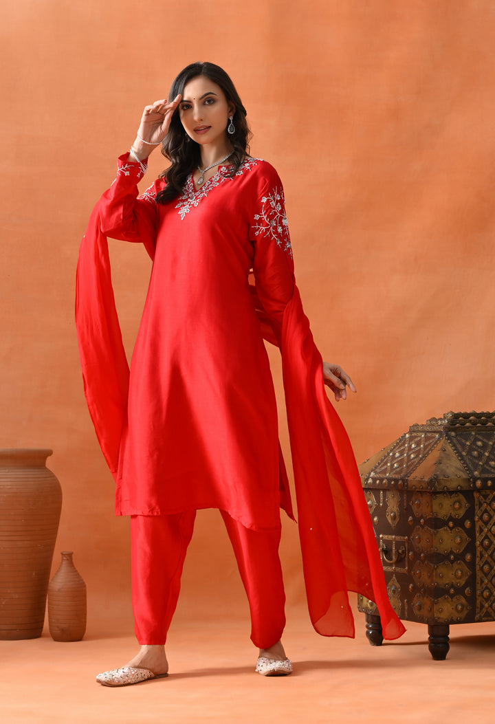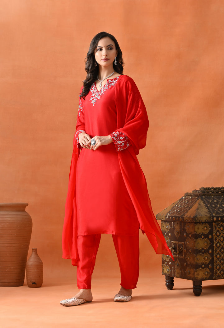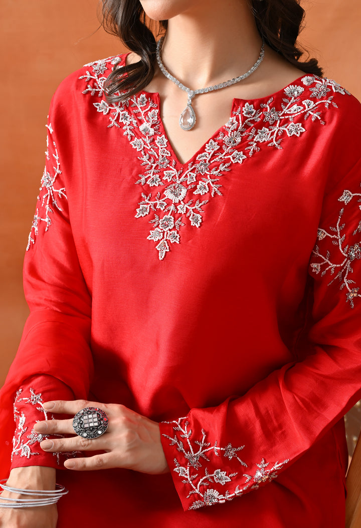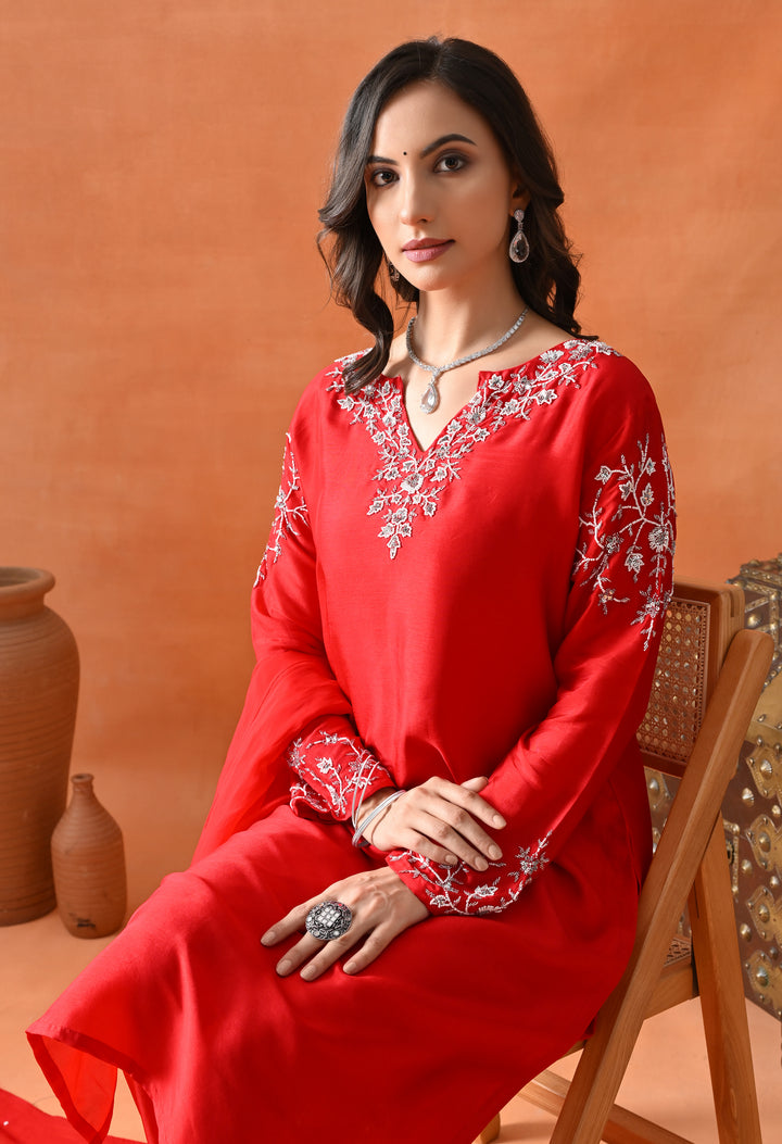 Turn heads with this stunning red Pakistani-style straight suit, made from rich silk fabric. The top features dazzling cut dana, sequins, and pearl work, adding a beautiful sparkle perfect for any celebration. With full sleeves, a stylish split neck, and a comfortable fit, this suit brings elegance and charm together. It comes with plain pants and a graceful organza dupatta that adds a festive finish to your look. Whether itās a wedding or party, this outfit will make you shine. Donāt waitāthis beauty is calling your name!