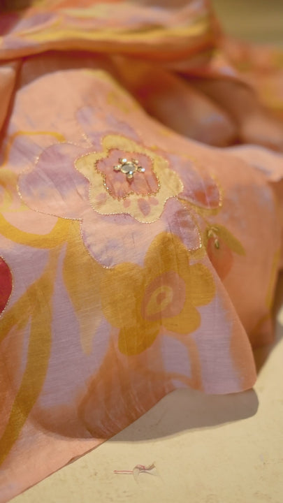The soothing pink base is adorned with vibrant floral prints in warm yellow and deeper pink tones, creating a fresh and lively look. The V-neckline adds a refined touch, while delicate pearl, mirror, and sequence work enhances the floral motifs with subtle sparkle. Designed with 3/4th umbrella sleeves finished with elegant gota work, the sleeves add a stylish flare and festive charm to the overall silhouette.