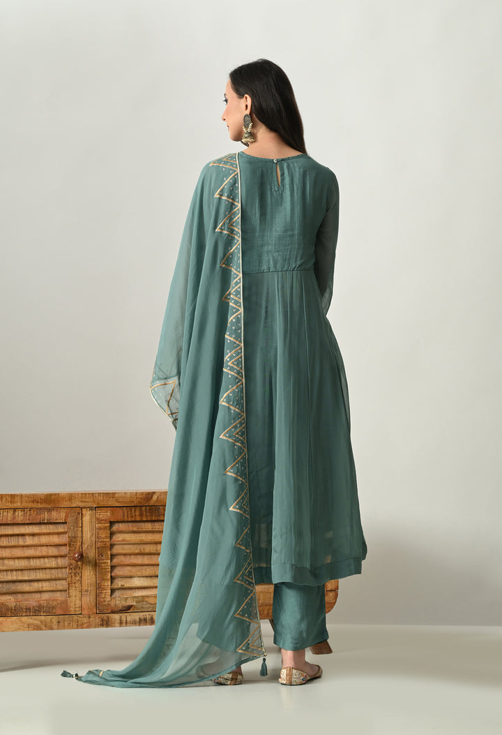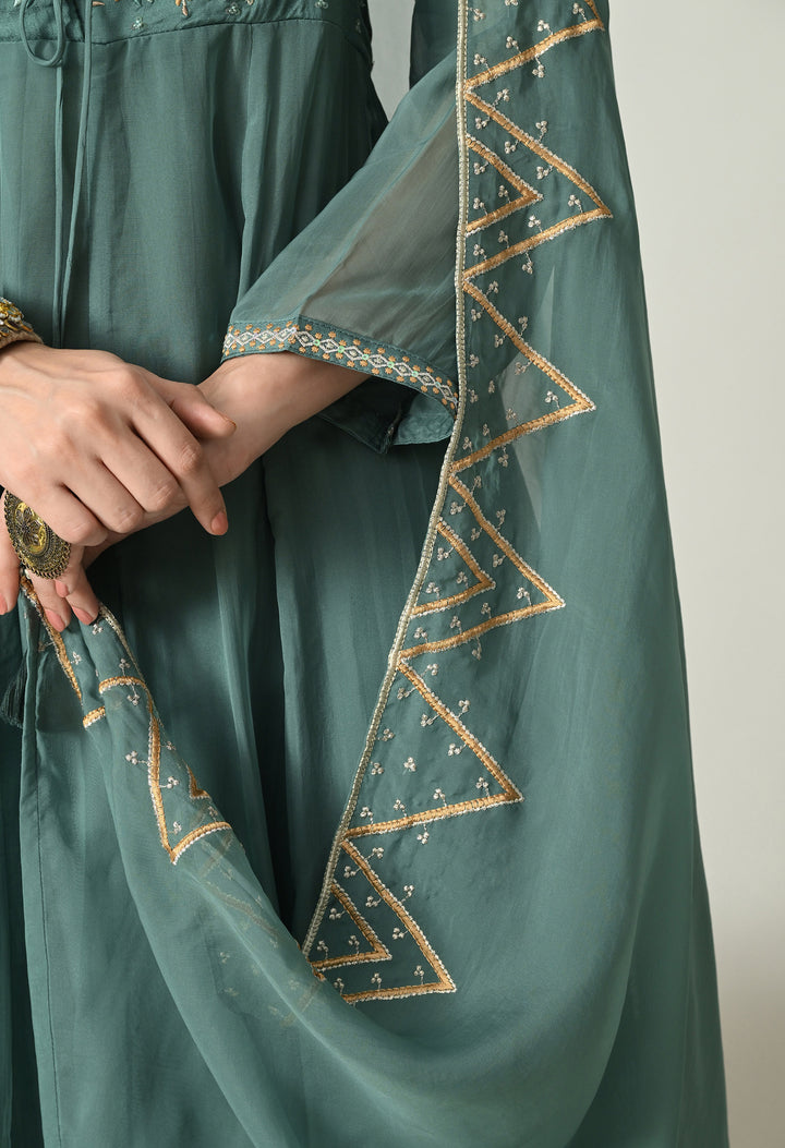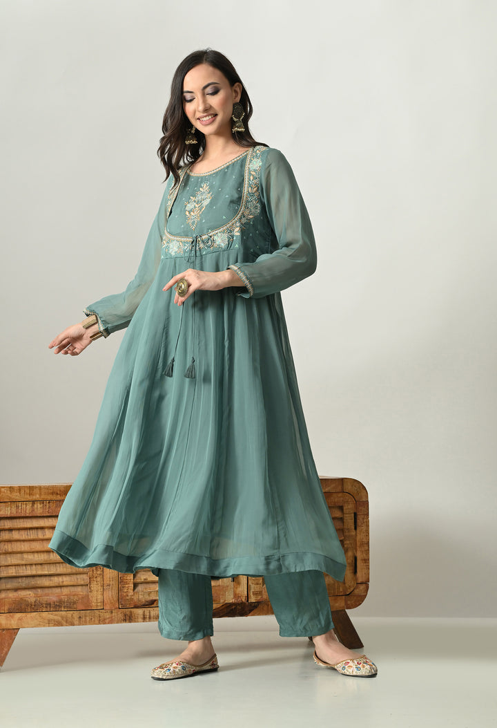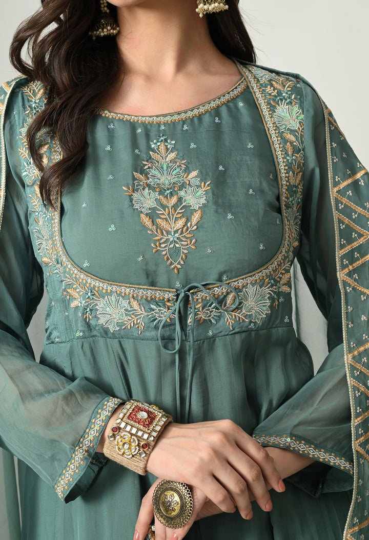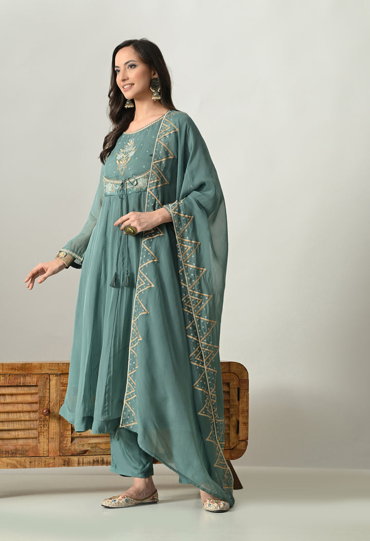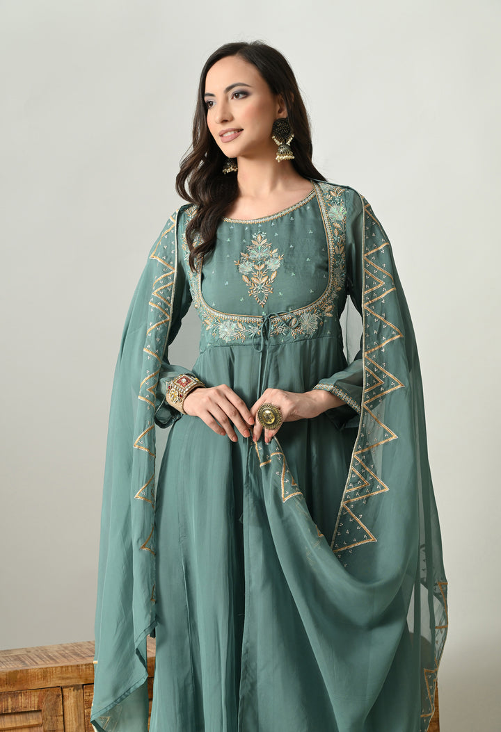 Bring grace and charm to your wardrobe with this Elegant Pastel Green Umbrella Suit. Crafted in soft organza crepe, it features beautiful thread and sequin work that adds a touch of sparkle without being too heavy. The round neck and full sleeves give it a classic look, while the flowing umbrella style keeps it trendy and elegant. The matching palazzo comes with a side pocket for comfort and practicality. Completing the outfit, the organza crepe dupatta with a four-side border and delicate tassels makes it perfect for festive occasions, parties, or family gatherings. A must-have for effortless style.
