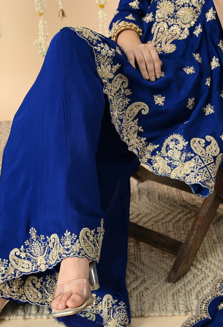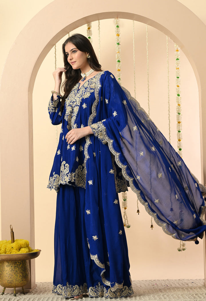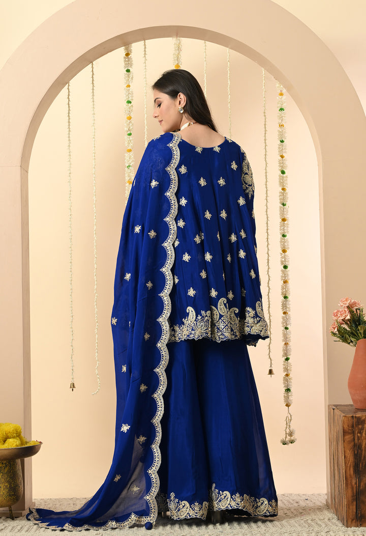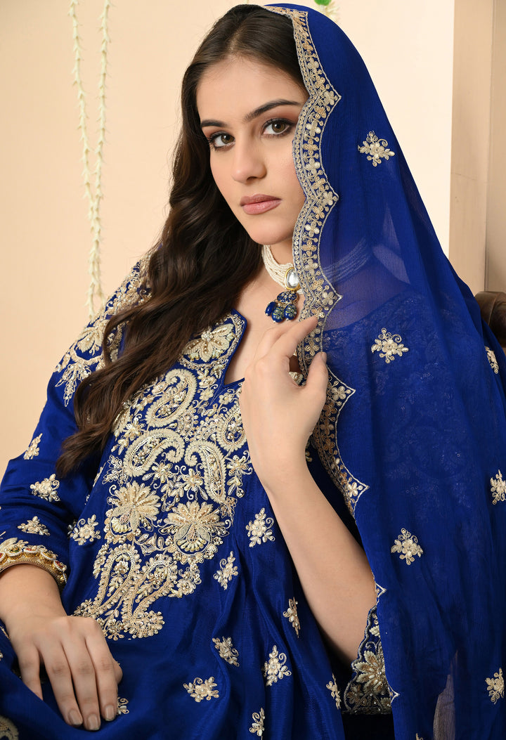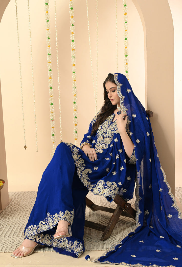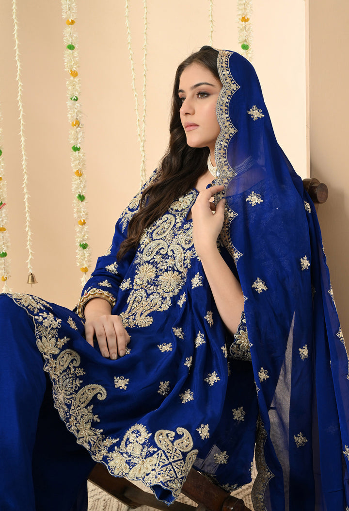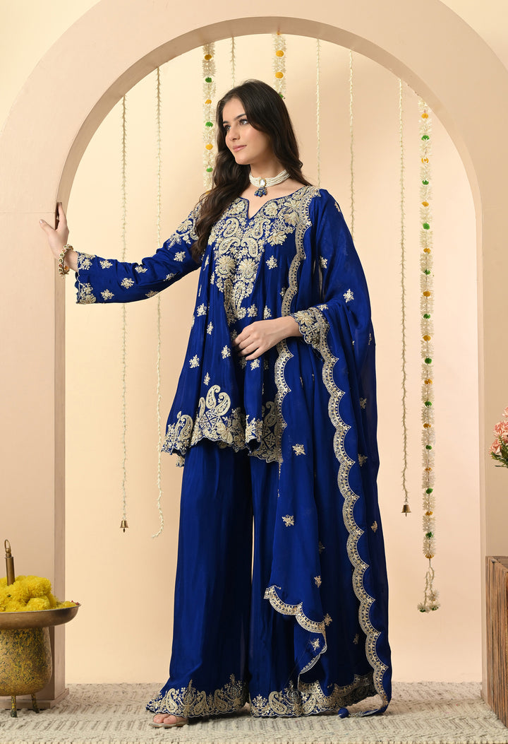 Get ready to shine in this stunning royal blue frock-style partywear suit, crafted from soft chinon crepe fabric. The outfit is beautifully decorated with sequins, zari, thread, pearls, and Swarovski work, giving it a royal and glamorous touch. The frock-style kurti comes with full sleeves and a stylish round neck with a V-cut. Paired with a comfortable plazoo, it blends elegance with ease. The matching chinon crepe dupatta features delicate butti work, sequins, zari, scalloped edges, and tassels on all sides. With full lining, this outfit ensures comfort while making you look dazzling at every occasion.