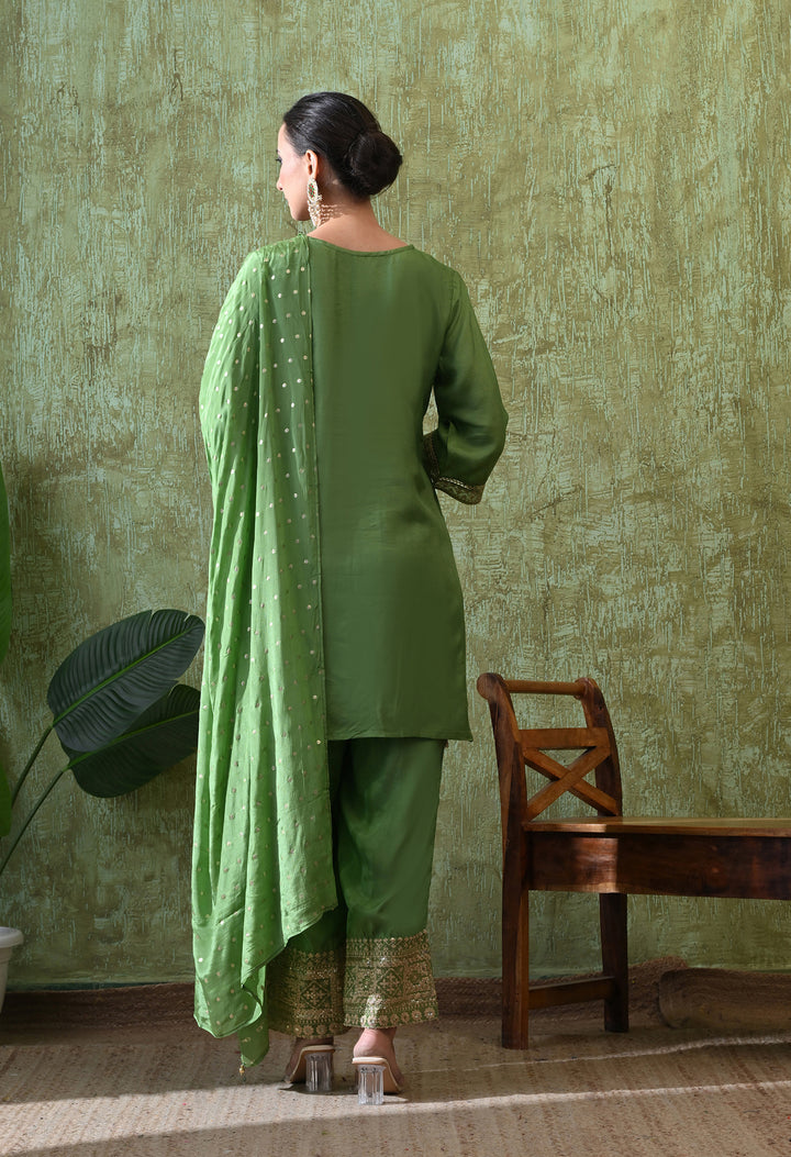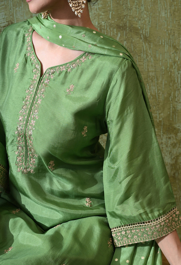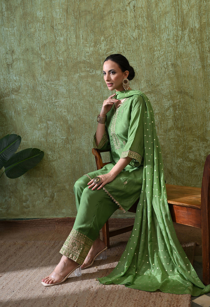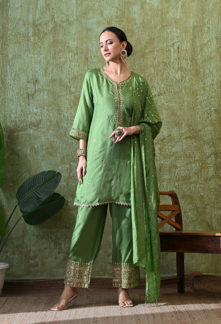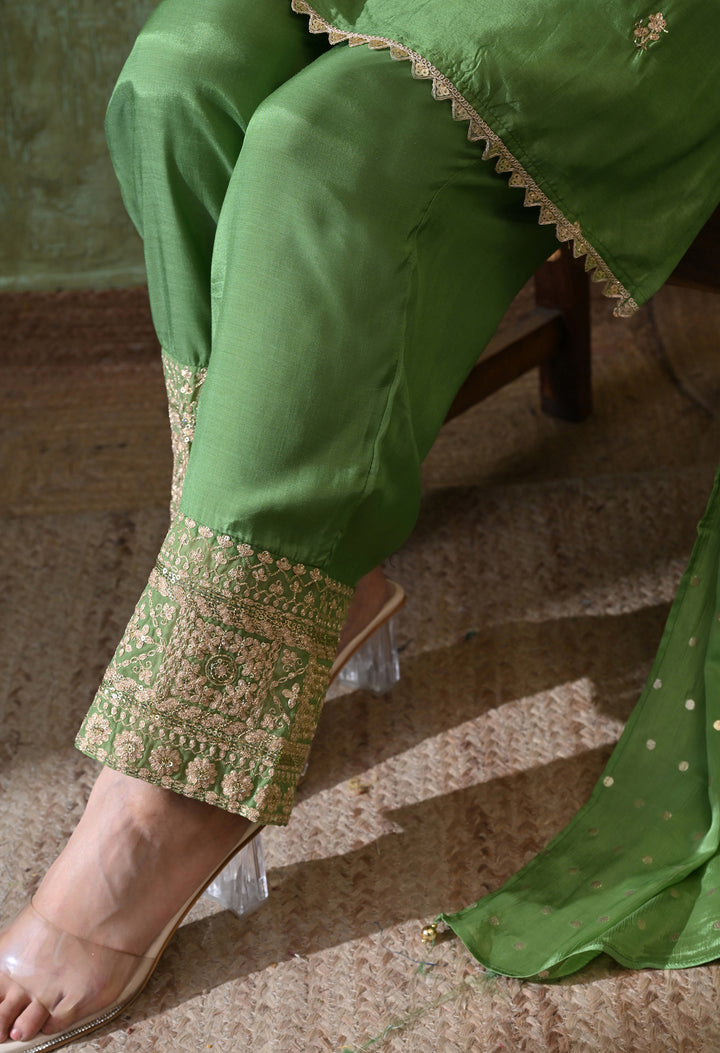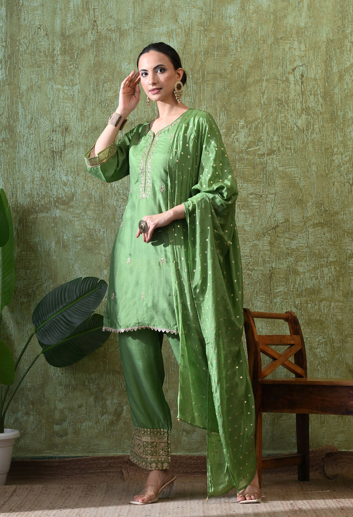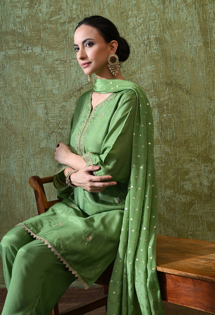 Make every occasion shine with this Sparkling Green Silk Party Suit. The short silk kurti is beautifully decorated with delicate zari and sequins work, making it perfect for parties and celebrations. The 3/4 sleeves and round neck with a stylish V cut add elegance to your look. The matching lower pant has detailed work on one side at the mori, giving a modern touch. To complete the outfit, the soft chinon crepe dupatta with four-side tassels and buti kajiwaram design makes it even more graceful. With comfortable lining inside, this outfit blends festive sparkle with all-day comfort, making it a must-buy.