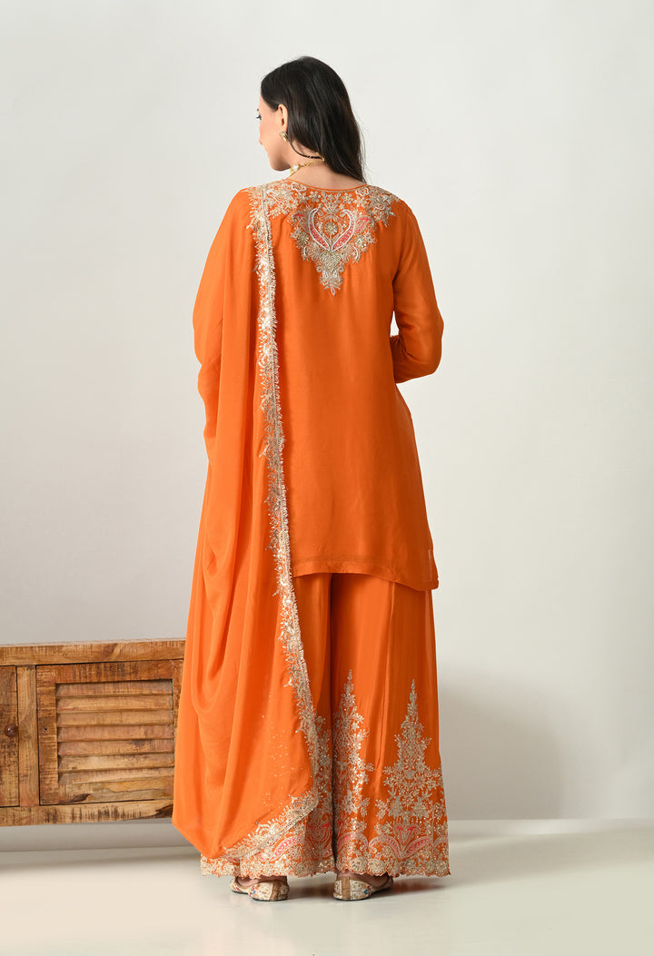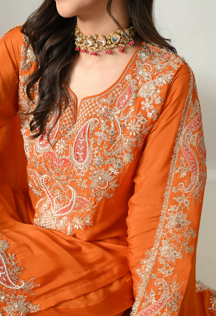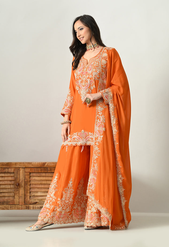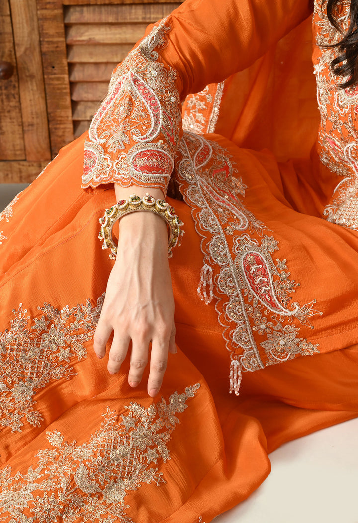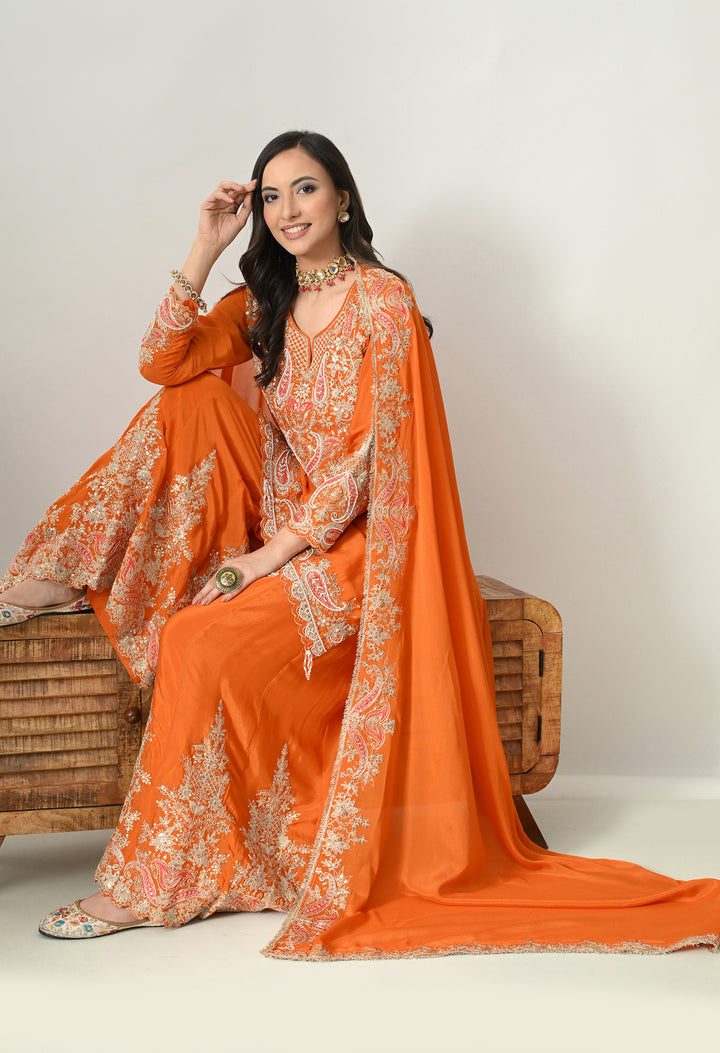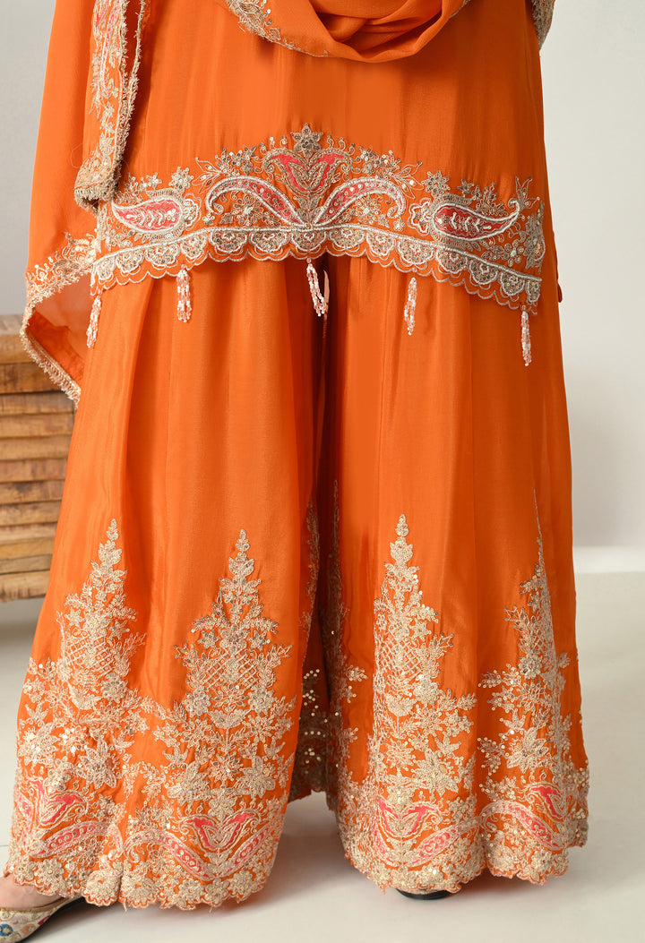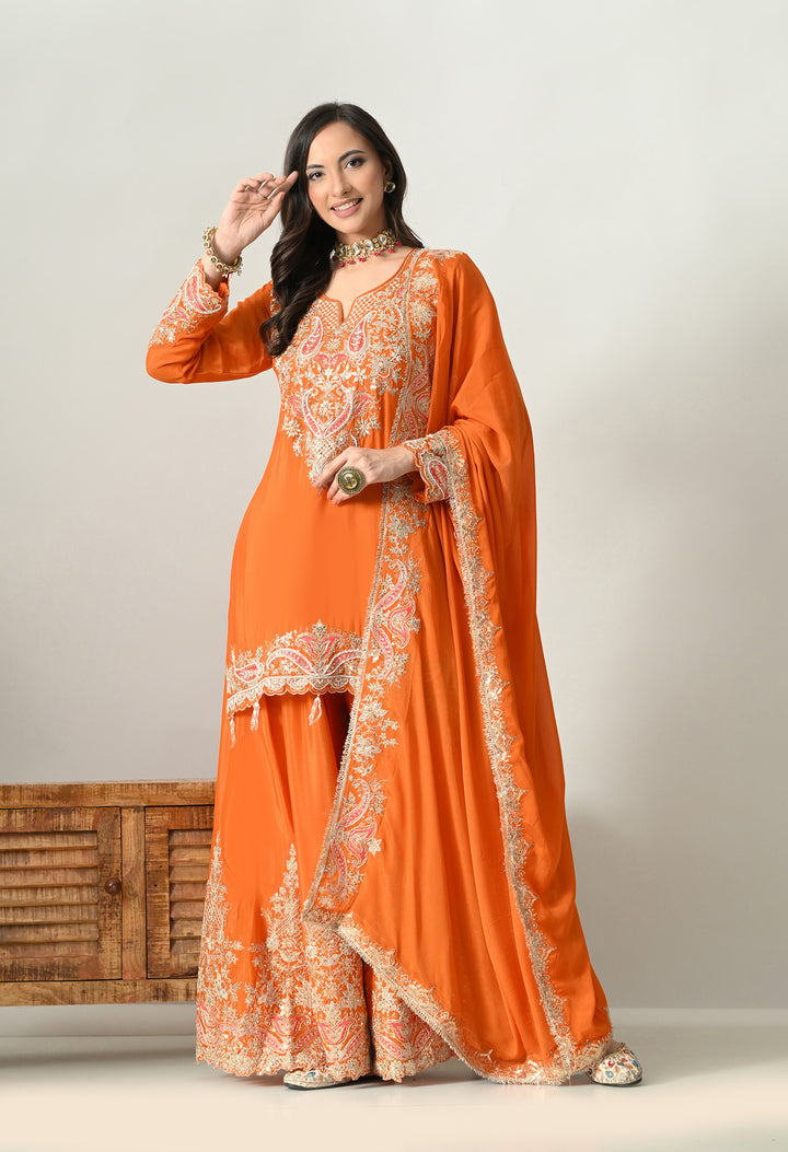 Get ready to shine with this Sparkling Orange Crystal Sharara Set. Made from soft chinon crepe, this outfit is perfect for parties and festive events. The short kurti is beautifully decorated with sequins, zari, pearls, thread, and fine crystal work that makes you look stunning. The flowing sharara adds comfort and style, while the dupatta with a four-side border and tassels completes the elegant look. Its round neck with a stylish V-cut and full sleeves gives it a graceful touch. With lining inside, it feels smooth and easy to wear. This outfit is a must-have to stand out in every celebration!