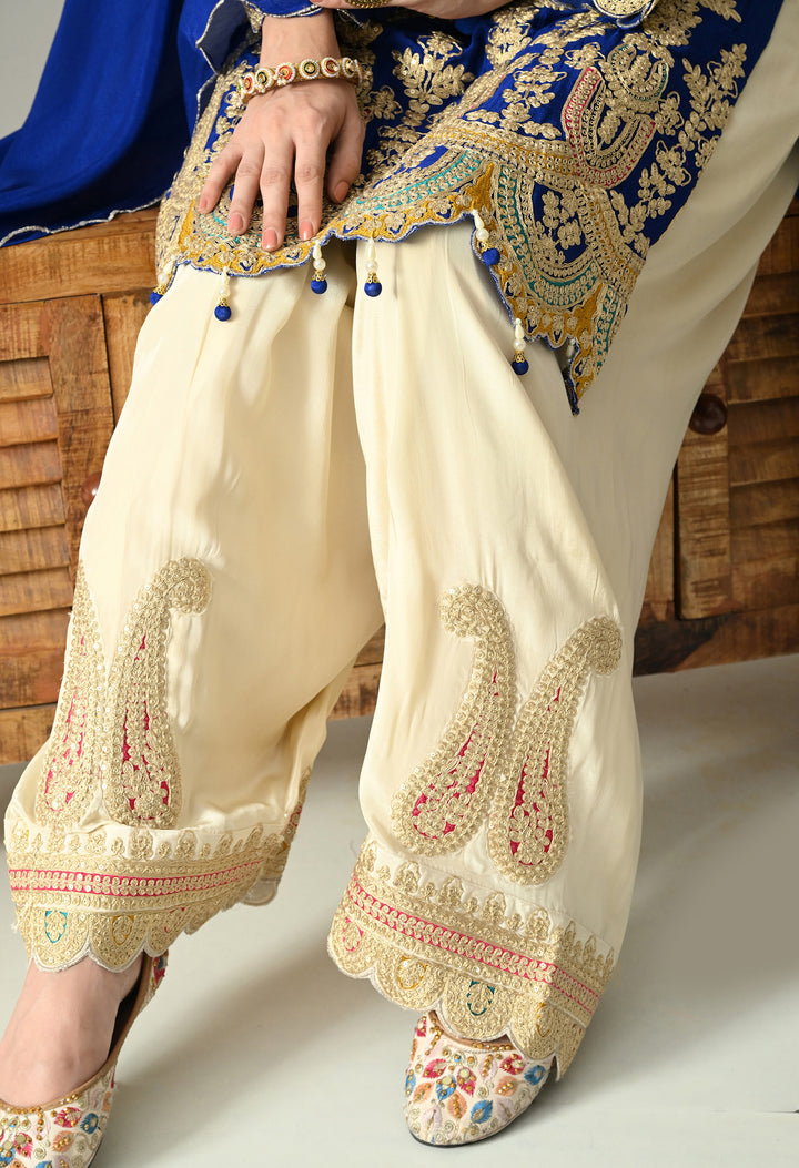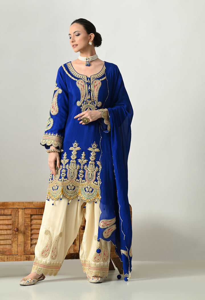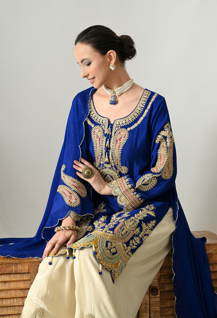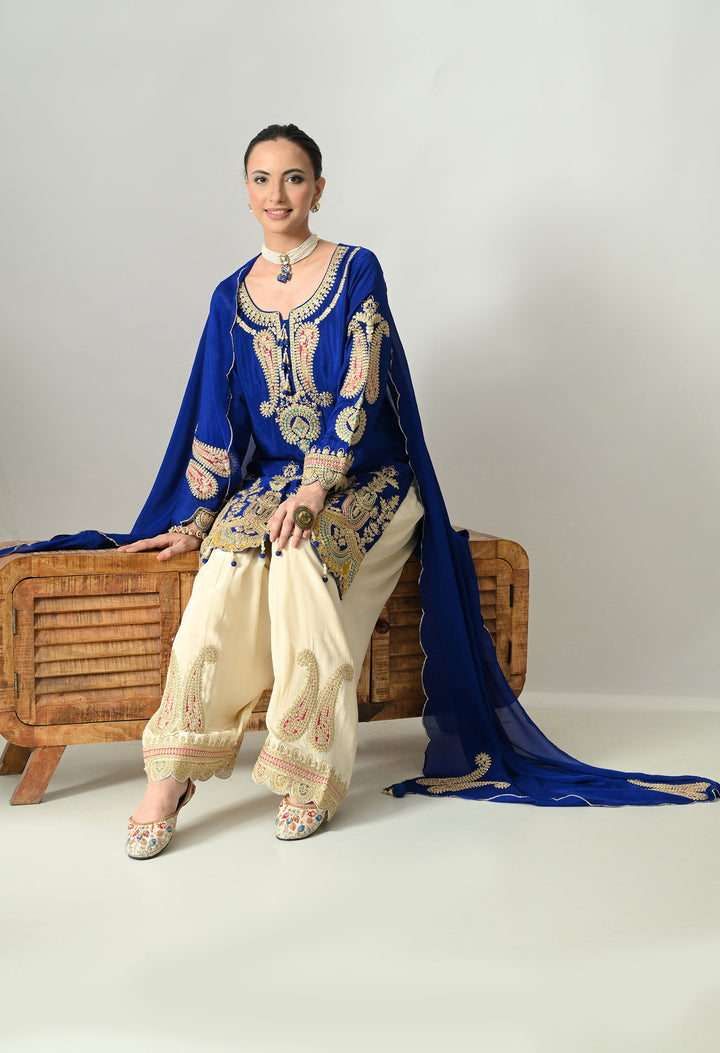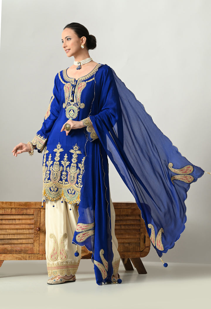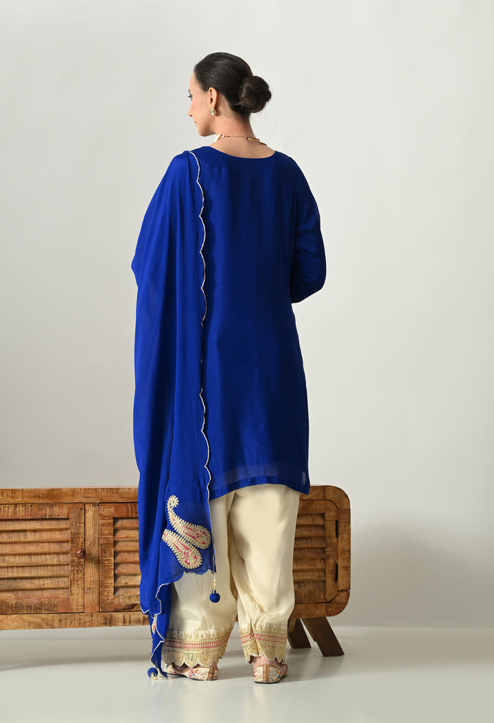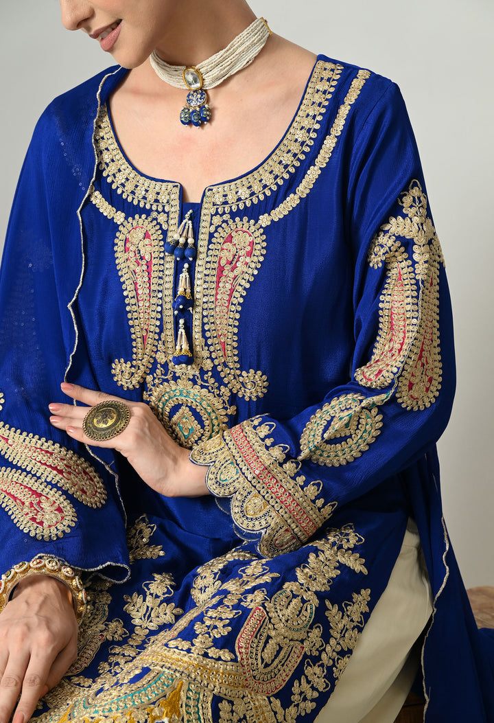 Turn heads at any celebration with this Sparkling Royal Blue Partywear Suit. Made from soft chinon crepe, this outfit shines with delicate zari, sequins, and pearl work that adds glamour to your look. The round neck is styled with 3 tassels, decorated with crystals and pearls for a graceful touch. Full sleeves and a perfectly stitched lining ensure both style and comfort. The parsi salwar features zari and sequins work at the mori, giving it a rich finish. The chinon crepe dupatta with four tassels, zari, and buti detailing completes the royal look. Perfect for parties, weddings, or festive nights.