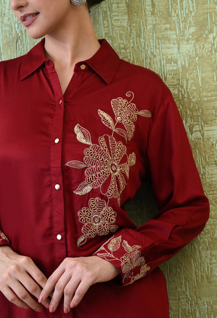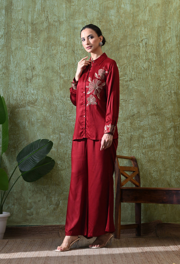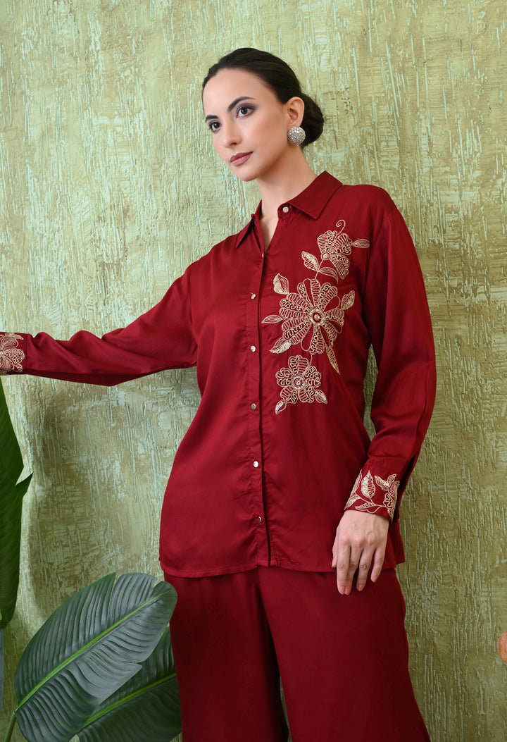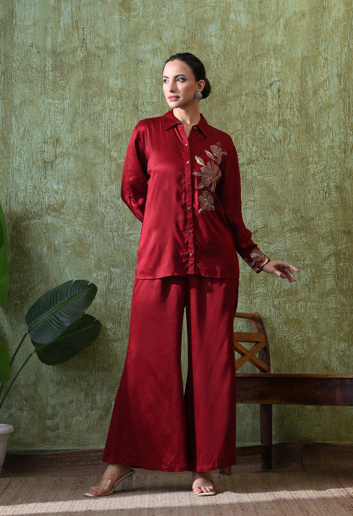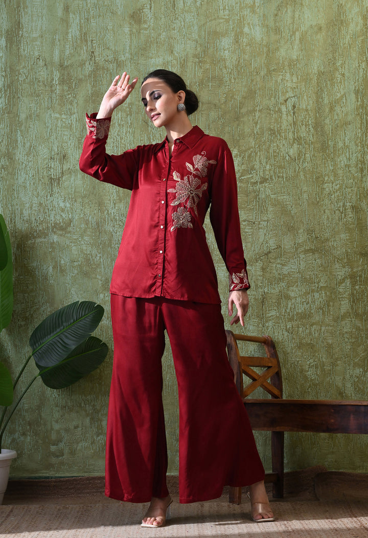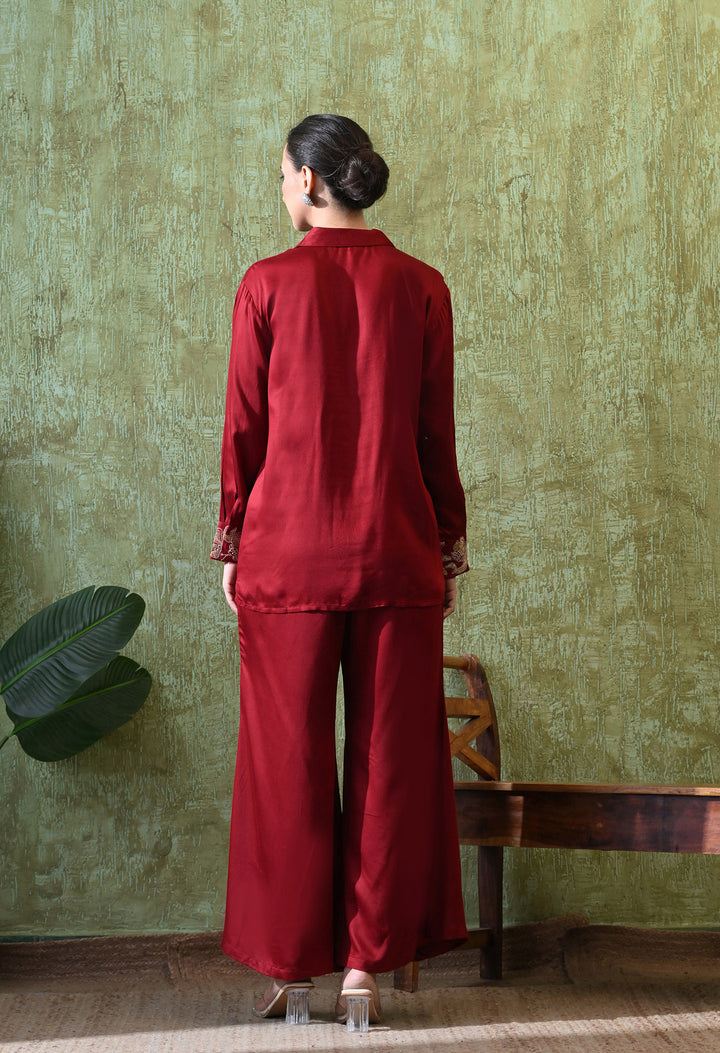 Shine bright at every party with this Sparkling Maroon Zari Co-ord Set. Made from soft cotton, it gives you comfort while looking super stylish. The outfit has fine zari and sequins work that adds a rich festive touch. The full-sleeve top comes with a smart collar and cuff design, making it look classy. The matching palazzo has a handy side pocket, blending fashion with function. The deep maroon shade makes it perfect for evening events or celebrations. With its chic design and elegant sparkle, this co-ord set is sure to turn heads wherever you go. A perfect mix of style and comfort!