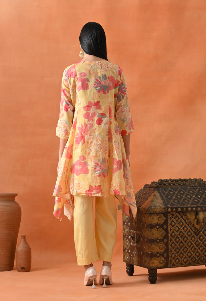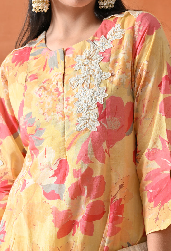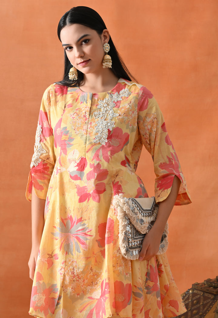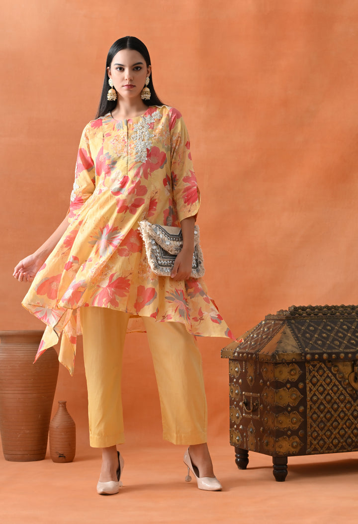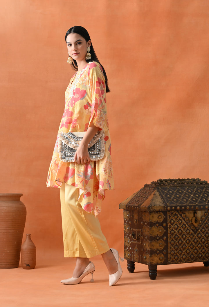This beautiful frock-style co-ord set is made from soft cotton, perfect for staying cool and comfy all day. The high-low design adds a fun, modern twist. Bright yellow color with floral prints looks fresh and lively. It has lovely thread work, gota, and mirror details that make it sparkle just right. The round neck with a collar style gives it a neat look. Paired with matching palazzo pants, this outfit is great for parties or casual outings. Feel stylish and comfortable every time you wear it!